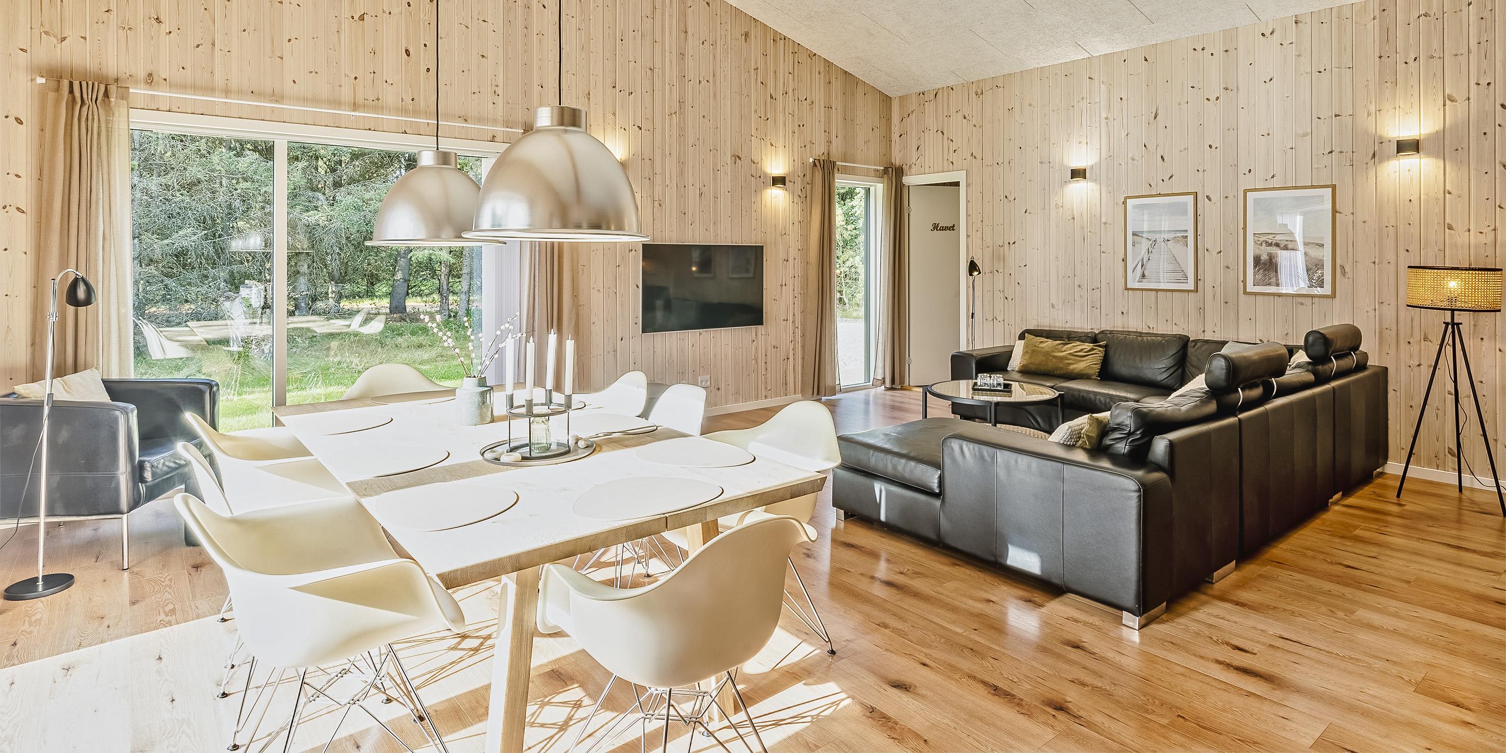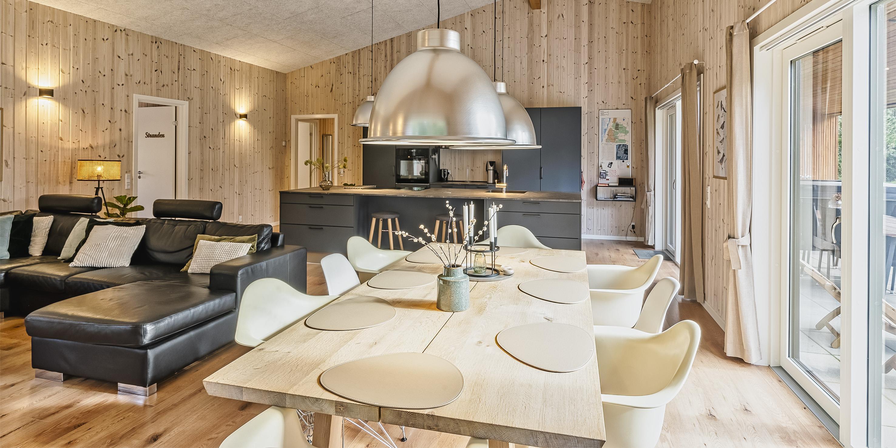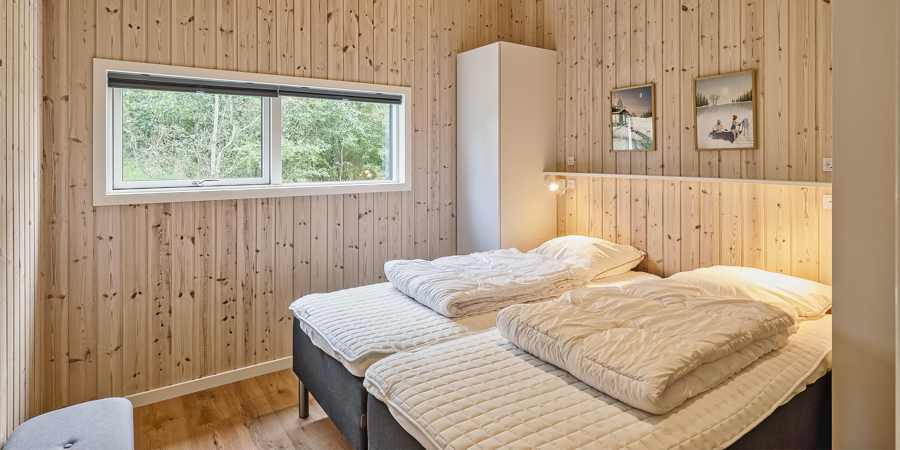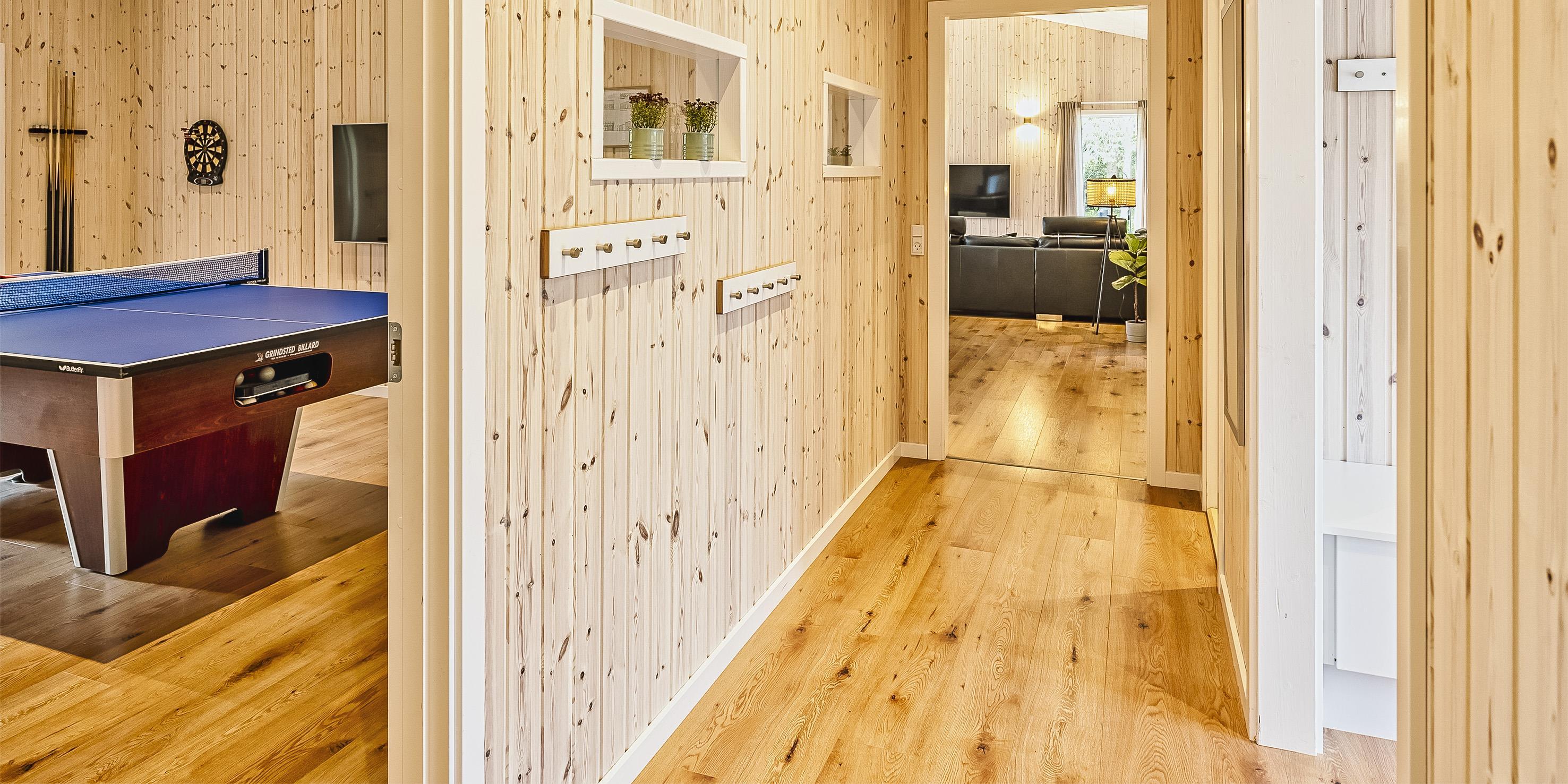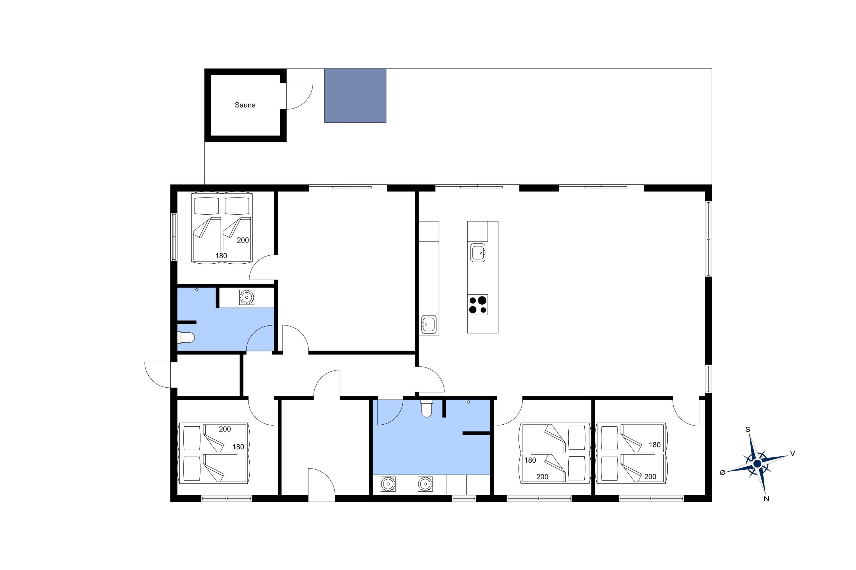 The summer house: Entrance hall with plenty of space for the wardrobe and extra storage. From the entrance area you continue to the hallway, which leads to both of the house's bathrooms, the house's first bedroom and activity room. From the activity room there is an entrance to another bedroom. One bathroom has a washing machine and dryer. From the hallway you enter a large kitchen-dining room and living room in one. The room is bright and nice with good windows and access to the terrace. The kitchen is equipped with all comforts such as a dishwasher, microwave, hob, hood and fridge/freezer with 8 drawers. Large dining table with room for 8 guests. Nice living room with television with Google Chromecast and wireless Internet access. The Danish TV programs are streamed via Google Chromecast. From here there is access to a lovely terrace environment. Under the covered terrace, there is an outside jacuzzi and sauna. The day can be enjoyed from morning to evening on the large partially covered terrace. From the living room there is access to the remaining 2 other bedrooms. All 4 bedrooms: DB + DB + DB + DB.