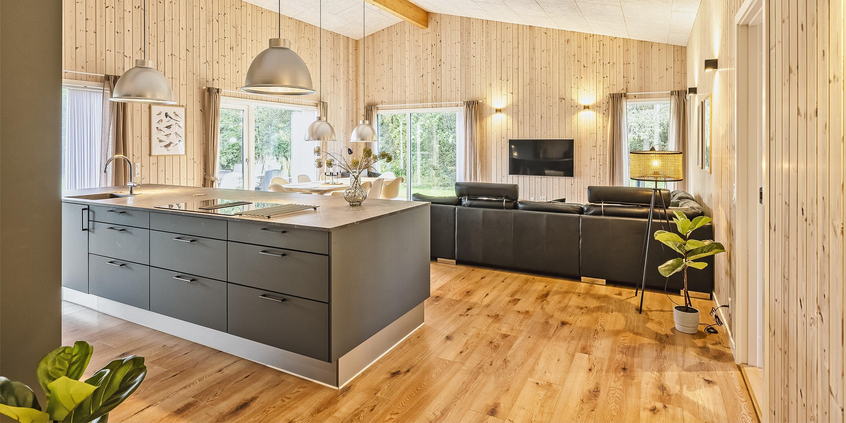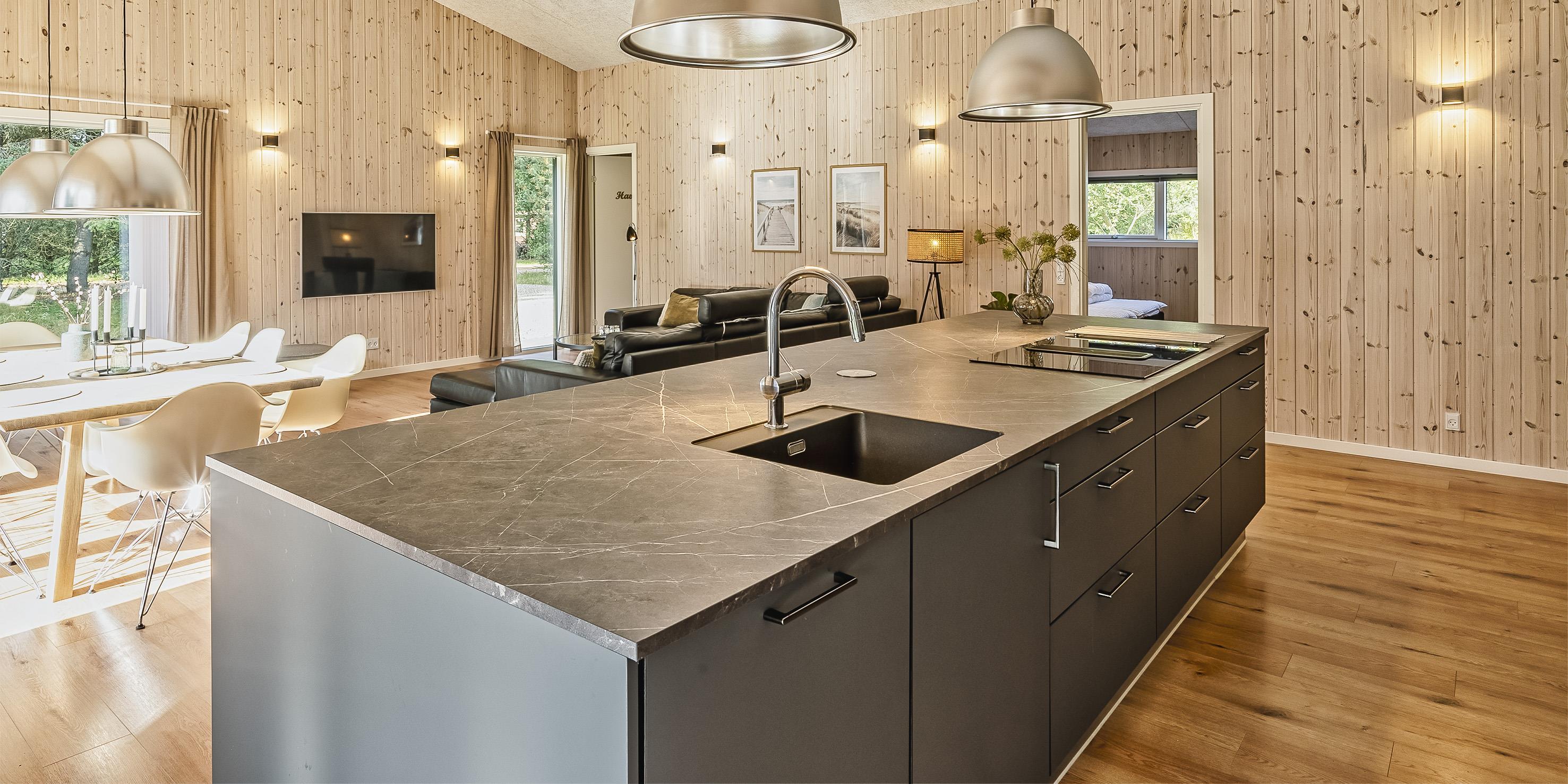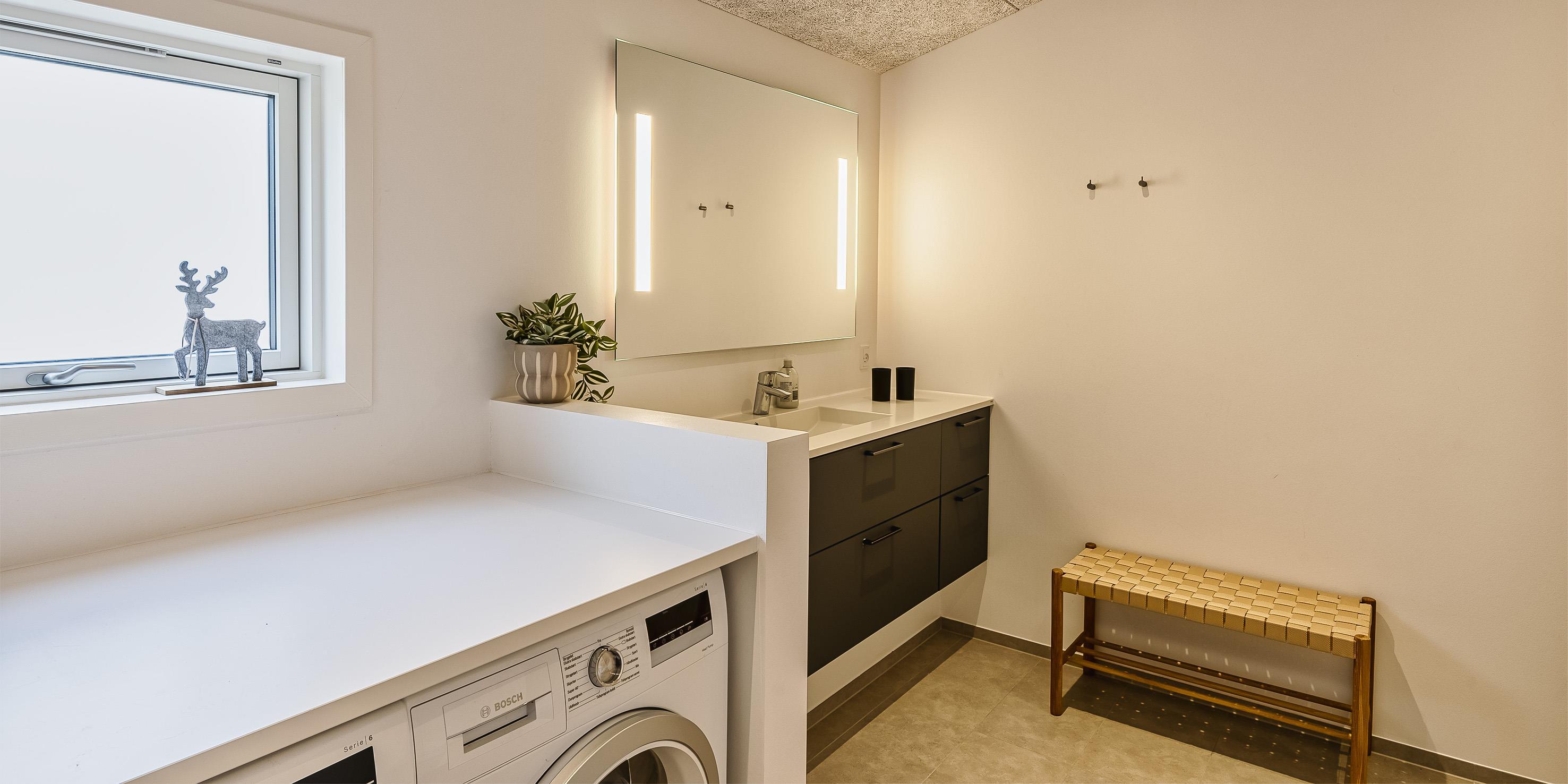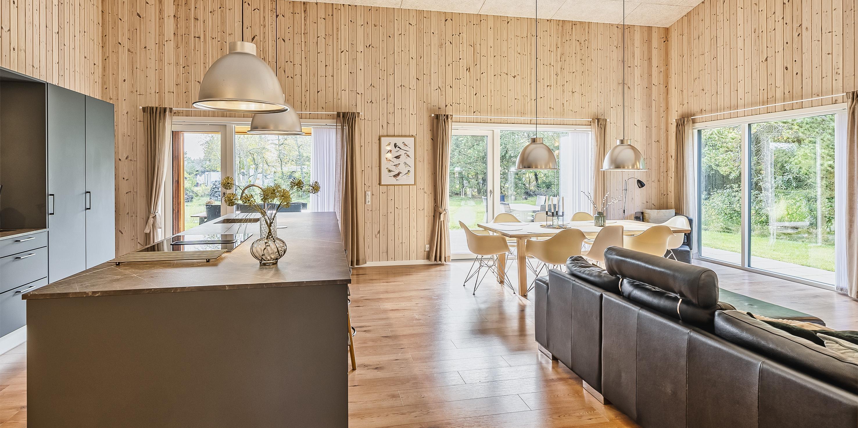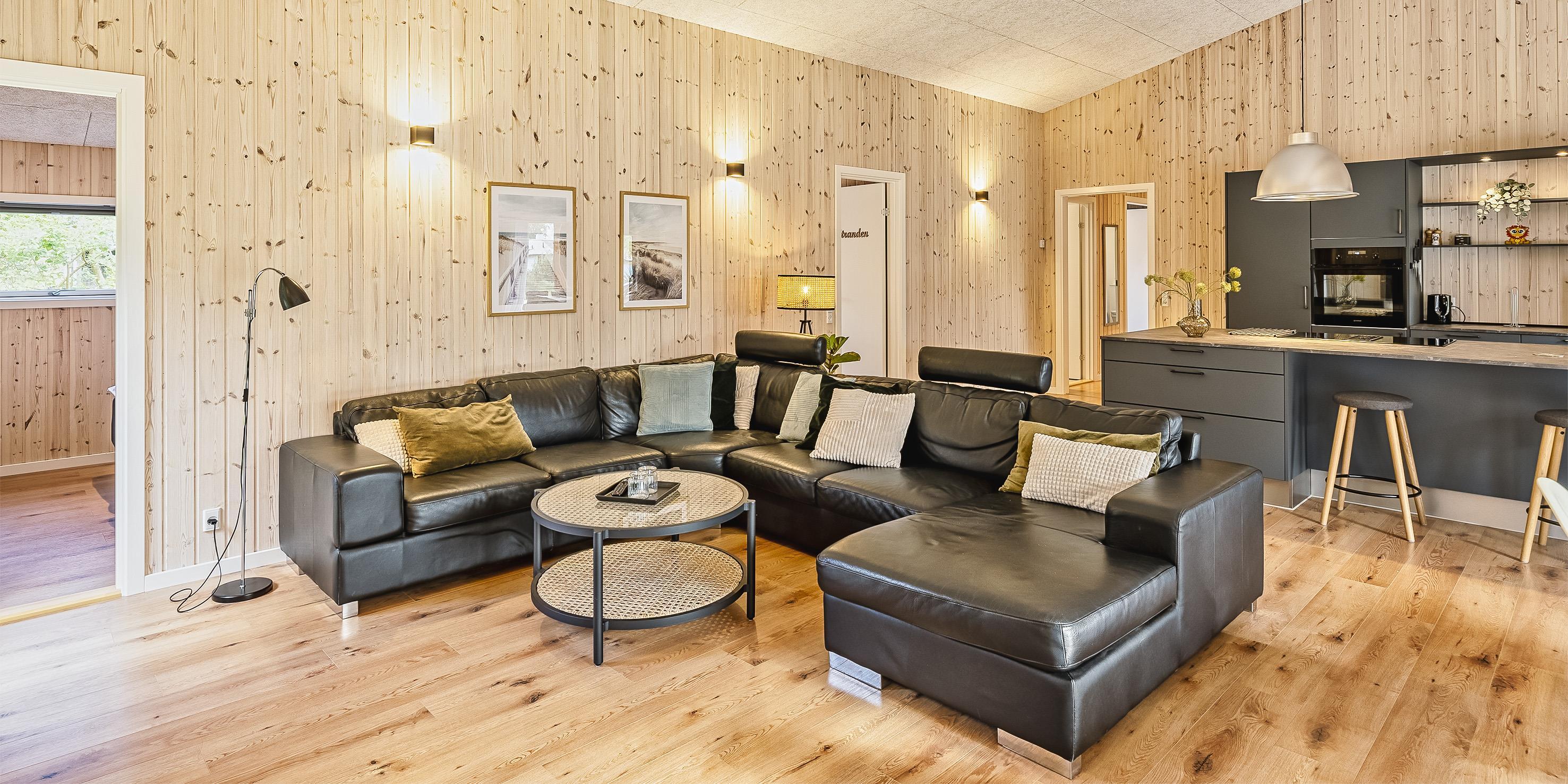 The summer house: Entrance hall with plenty of space for the wardrobe and extra storage. From the entrance area you continue to the hallway, which leads to both of the house's bathrooms, the house's first bedroom and activity room. From the activity room there is an entrance to another bedroom. One bathroom has a washing machine and dryer. From the hallway you enter a large kitchen-dining room and living room in one. The room is bright and nice with good windows and access to the terrace. The kitchen is equipped with all comforts such as a dishwasher, microwave, hob, hood and fridge/freezer with 8 drawers. Large dining table with room for 8 guests. Nice living room with television with Google Chromecast and wireless Internet access. The Danish TV programs are streamed via Google Chromecast. From here there is access to a lovely terrace environment. Under the covered terrace, there is an outside jacuzzi and sauna. The day can be enjoyed from morning to evening on the large partially covered terrace. From the living room there is access to the remaining 2 other bedrooms. All 4 bedrooms: DB + DB + DB + DB.