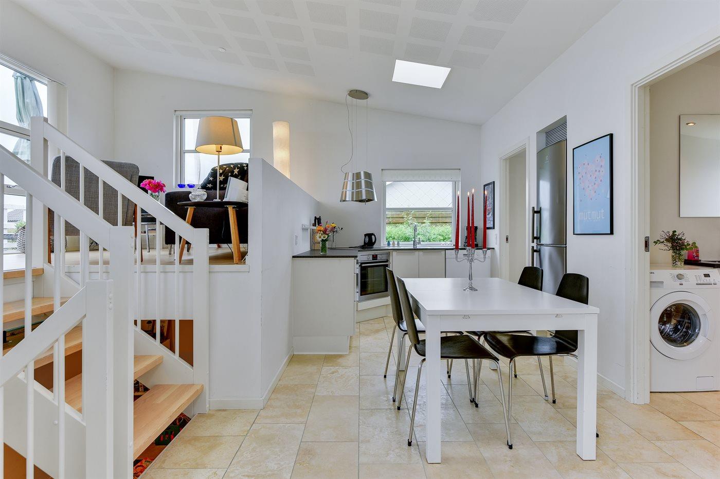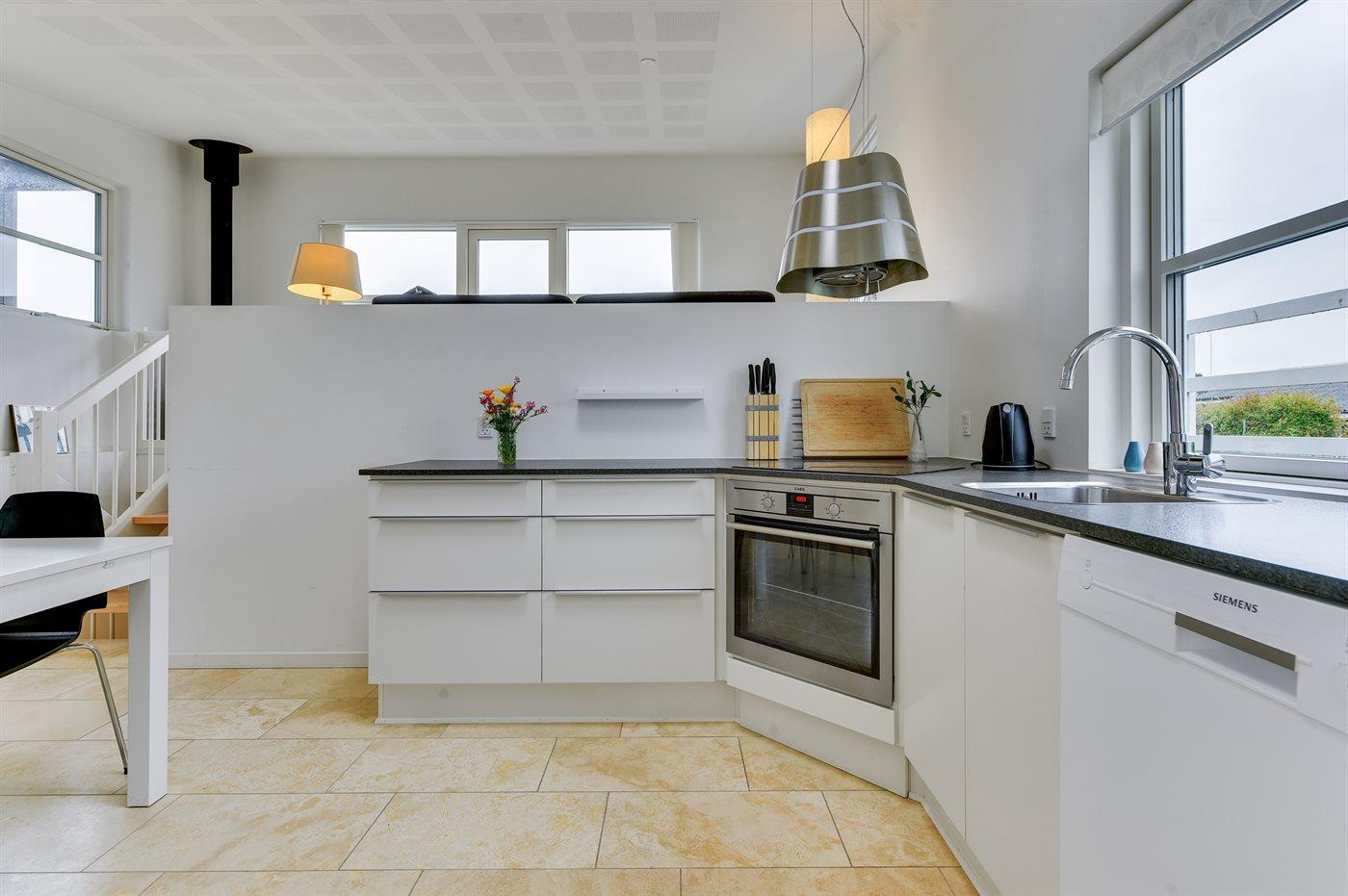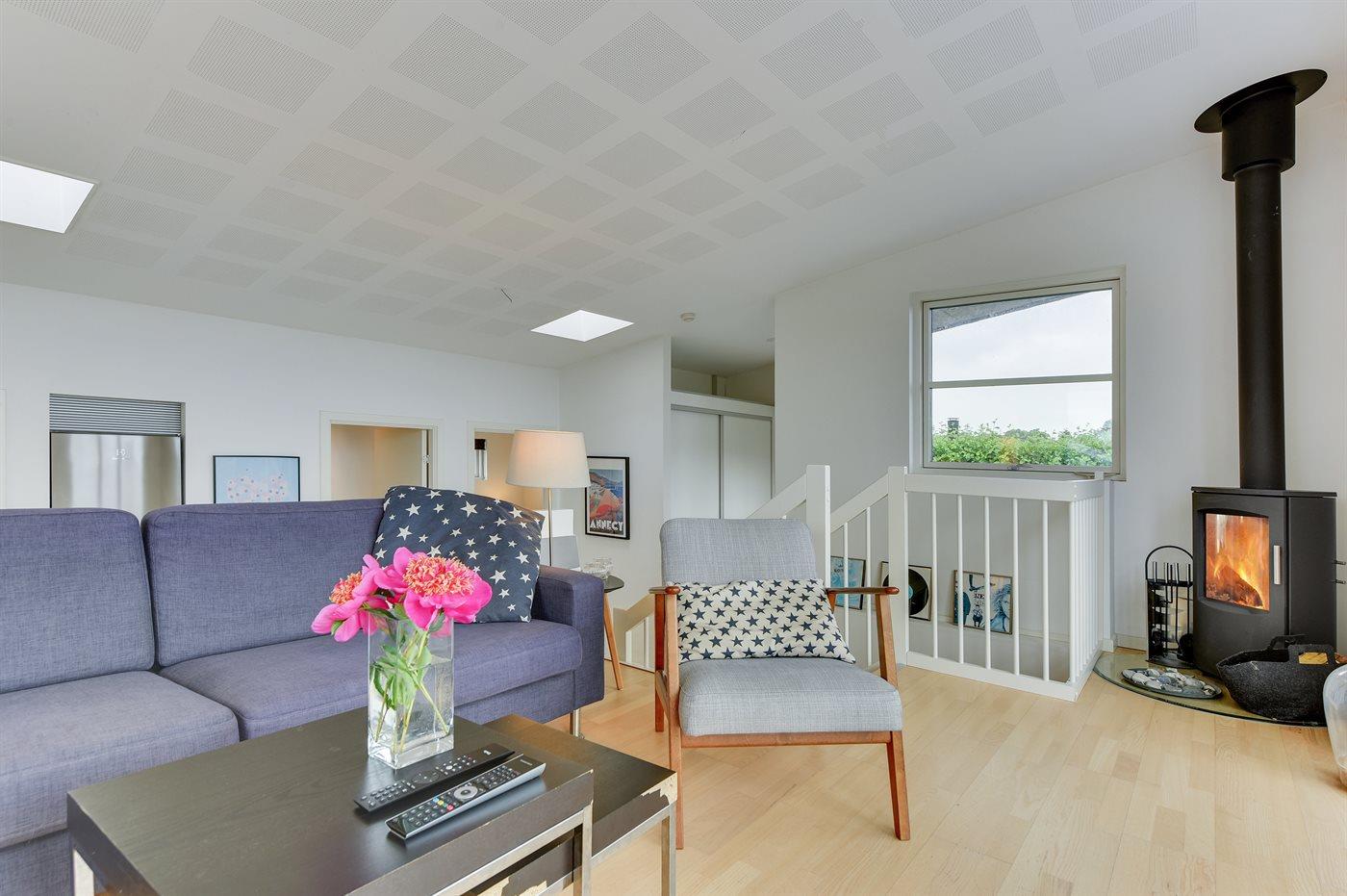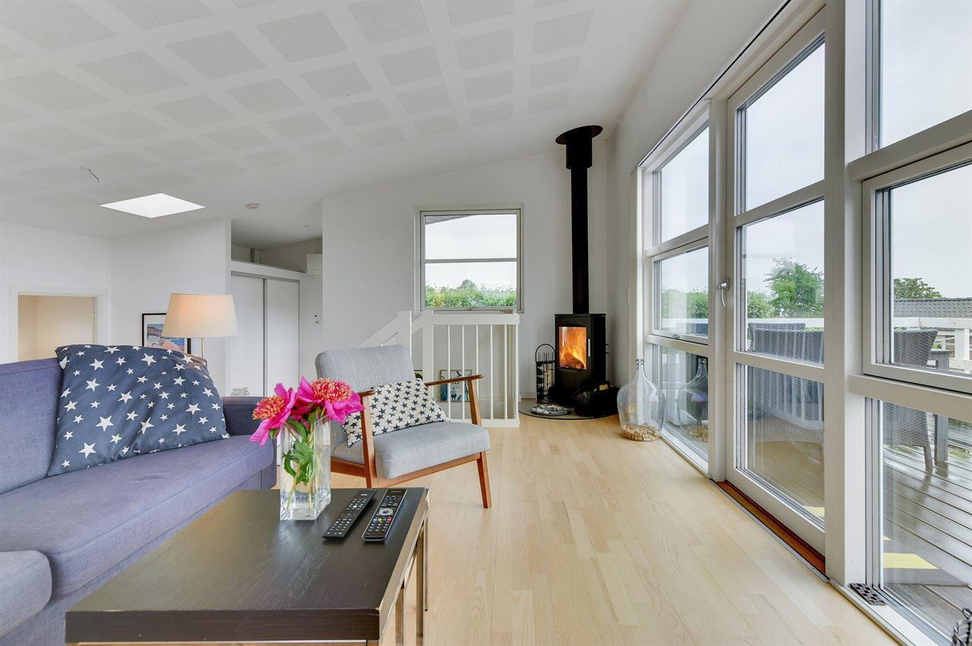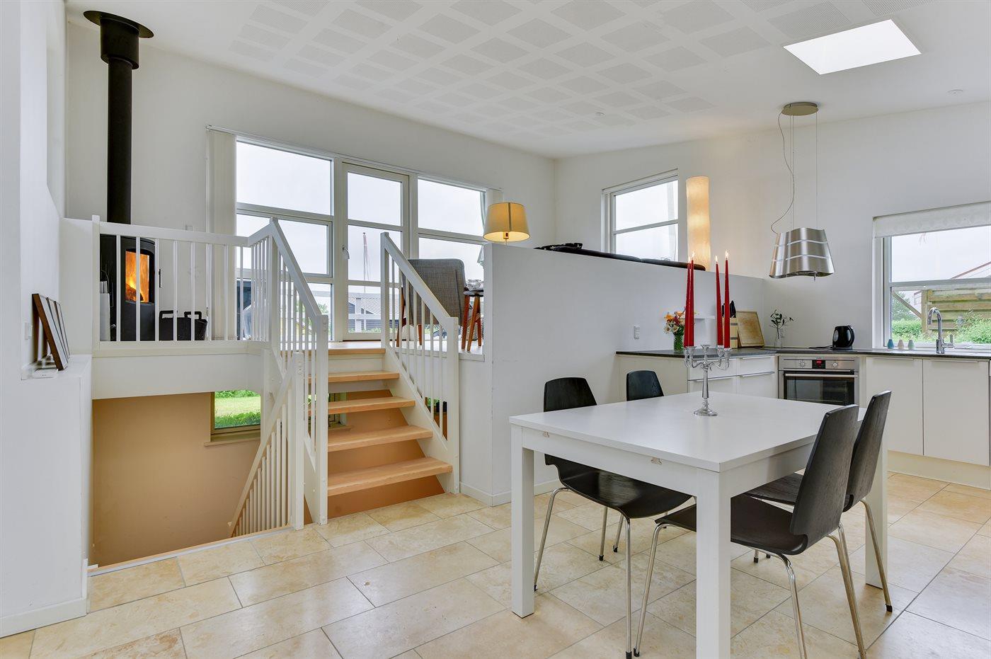 Holiday home suitable for 4 persons . The holiday home is 76 m², in 2 levels, and is build in 2014. No pets allowed. The holiday home is equipped with energy-saving heat pump. Floor heating in all tiled floors. The holiday home has washing machine. Freezer capacity of 60 litres. Further more there is 1 wood-burning stove. For the youngest ones there is 1 high chair.