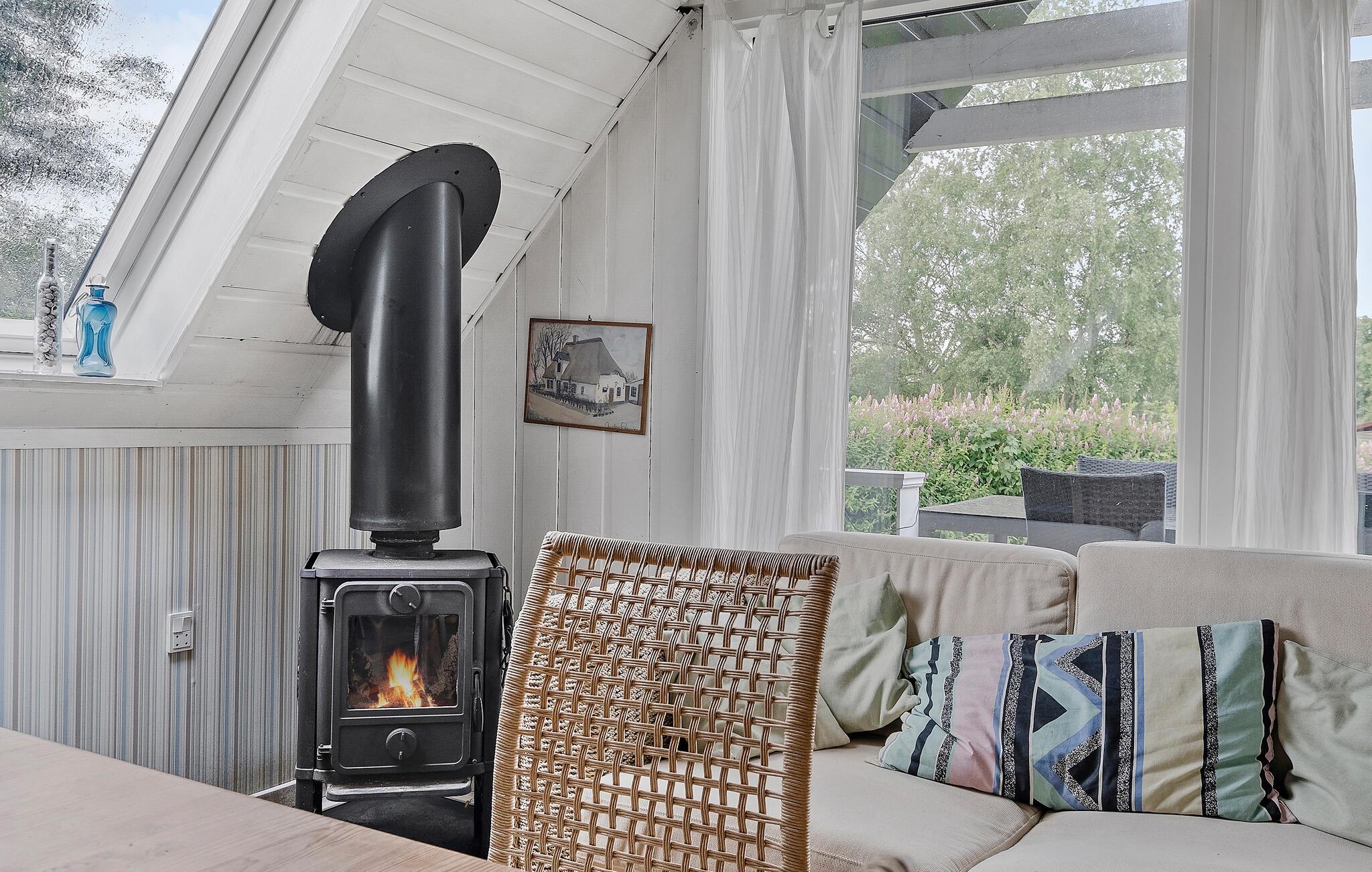 Im Inneren des Hauses erwartet Sie ein gemütlicher Wohnbereich mit einer komfortablen Sofaecke, die zum Entspannen einlädt. Die offene Gestaltung des Raumes mit sichtbaren Balken und der großen Fensterfront schafft eine helle und luftige Atmosphäre. In der kompakten Küche können Sie die Mahlzeiten des Tages zubereiten, die Sie anschließend am schönen Holzesstisch oder auf der Terrasse genießen können.