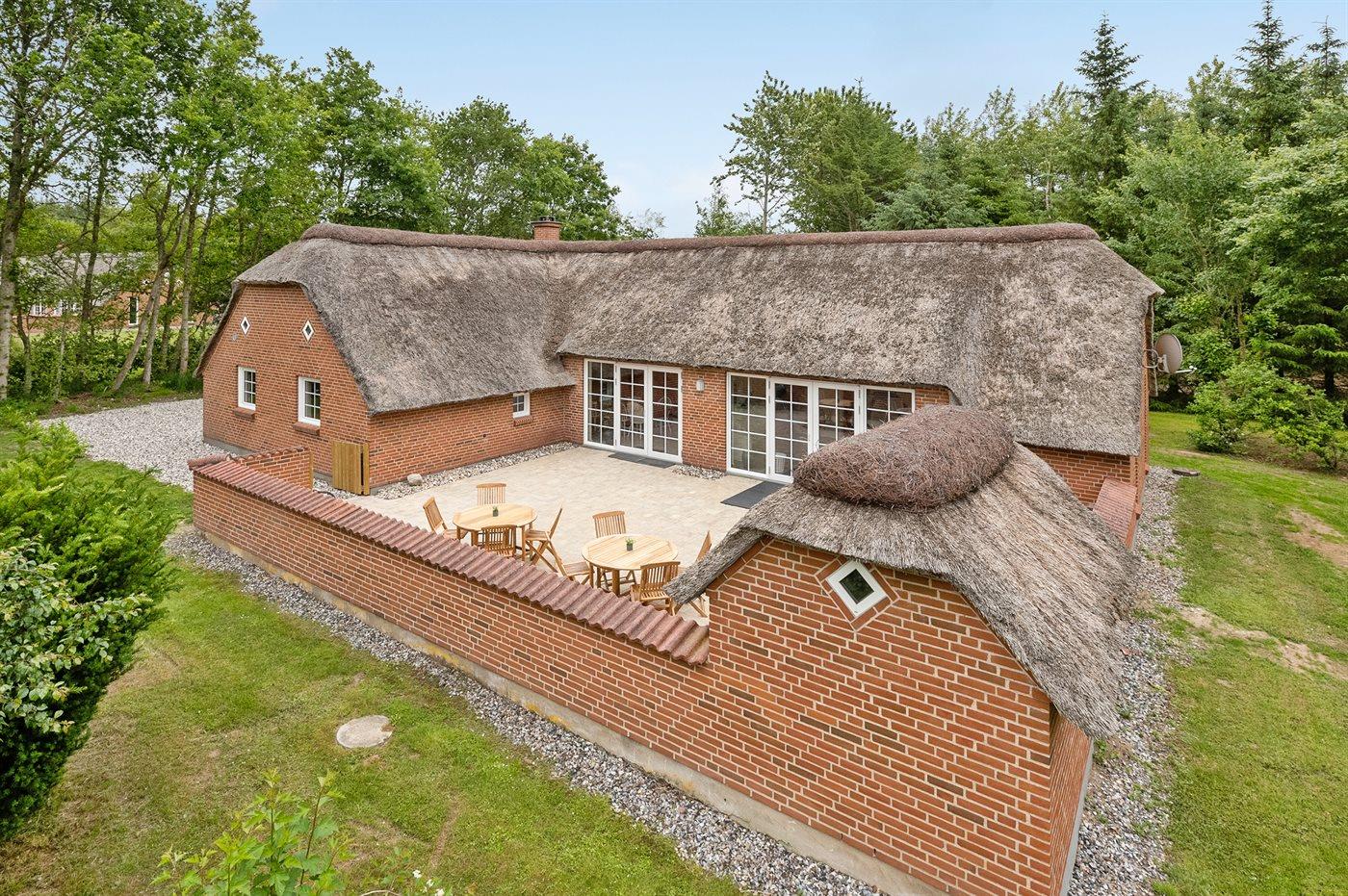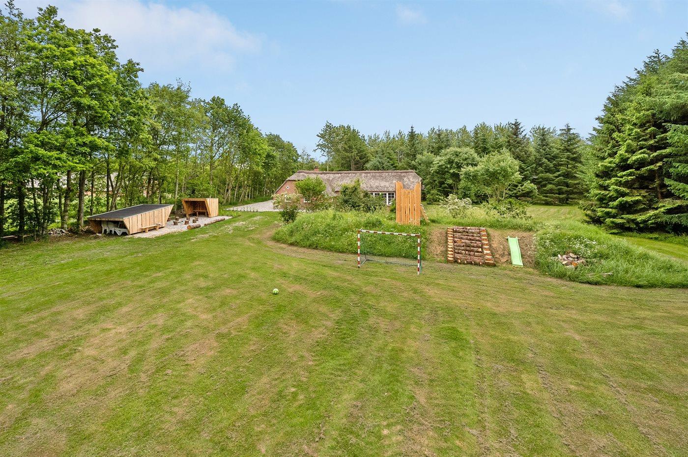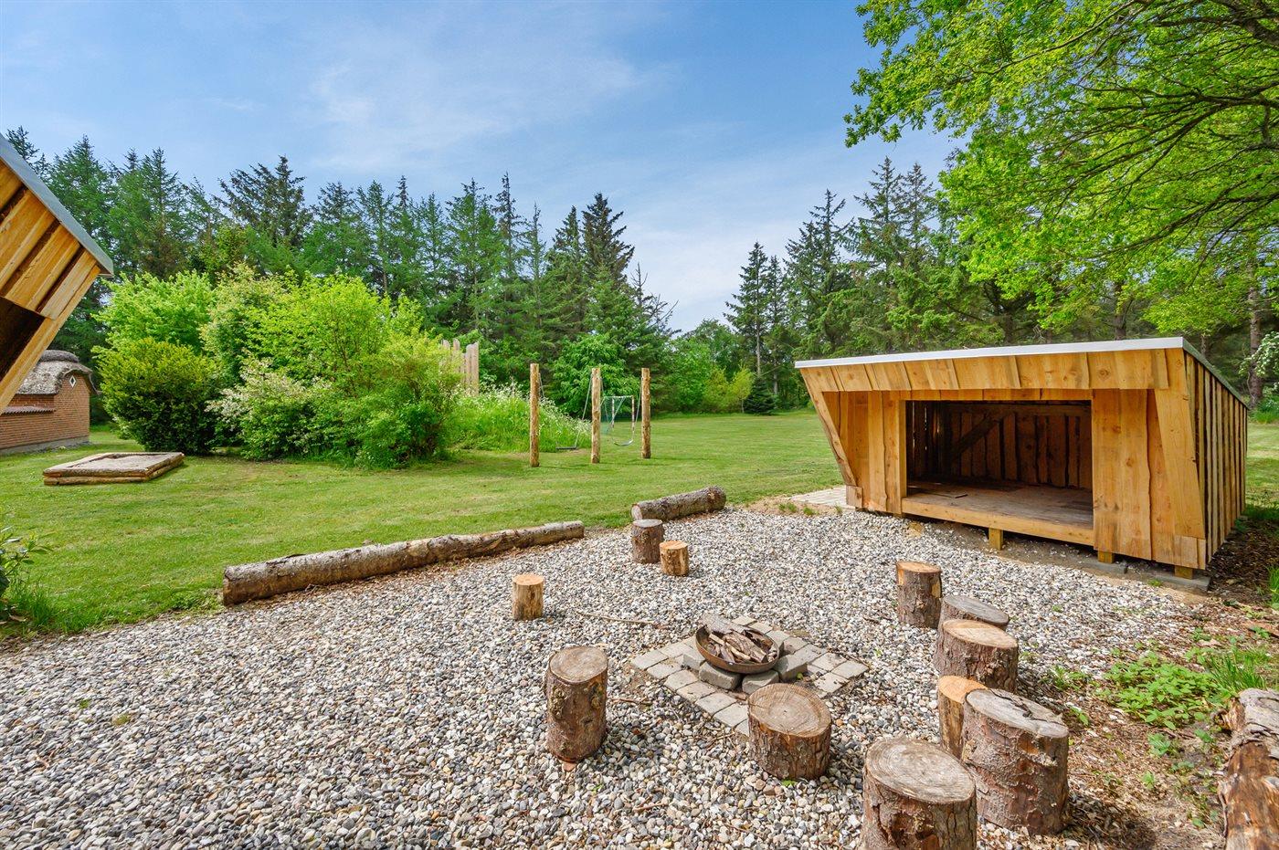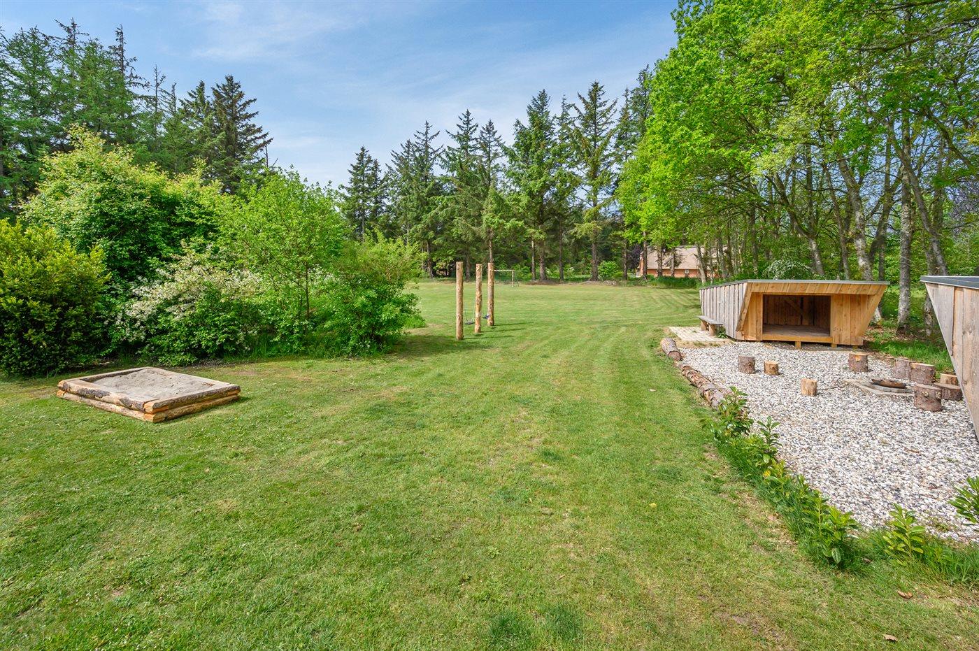 The holiday home is situated on a 5583 m² natural site. Situated 2300 m from the sea. Nearest shop is 4000 m away. You will find a golf course in a distance of 17000 m. A 85 m² terrace belong to the holiday home. Hereof a total of 85 m² enclosed terrace. You find a tool shed. Swing. Sandbox. Play tower. Football goal. Situated 200 m from a playground.Fire place. Shelter. Plug for charging electric car is available. Parking place by the holiday home.
