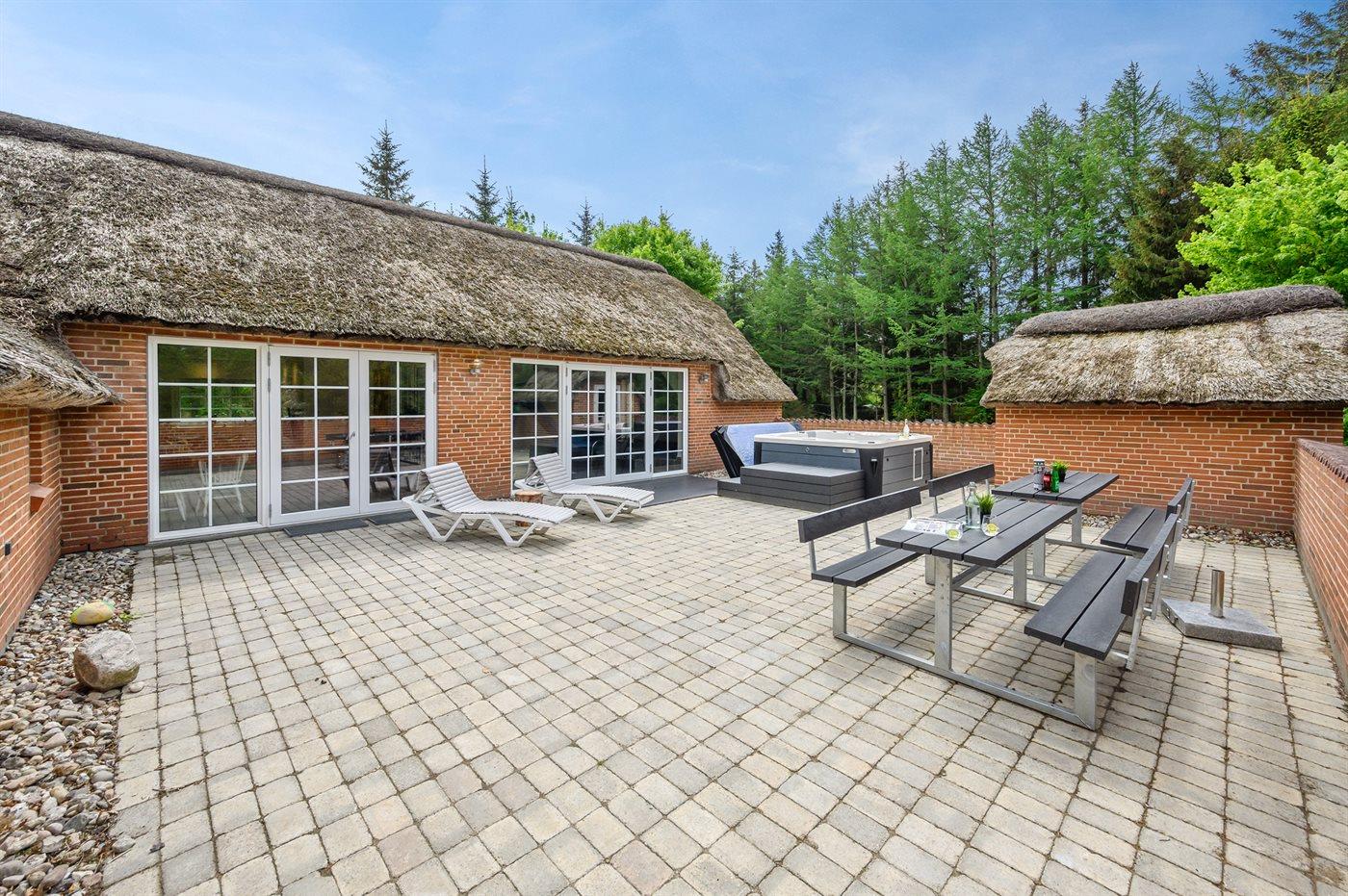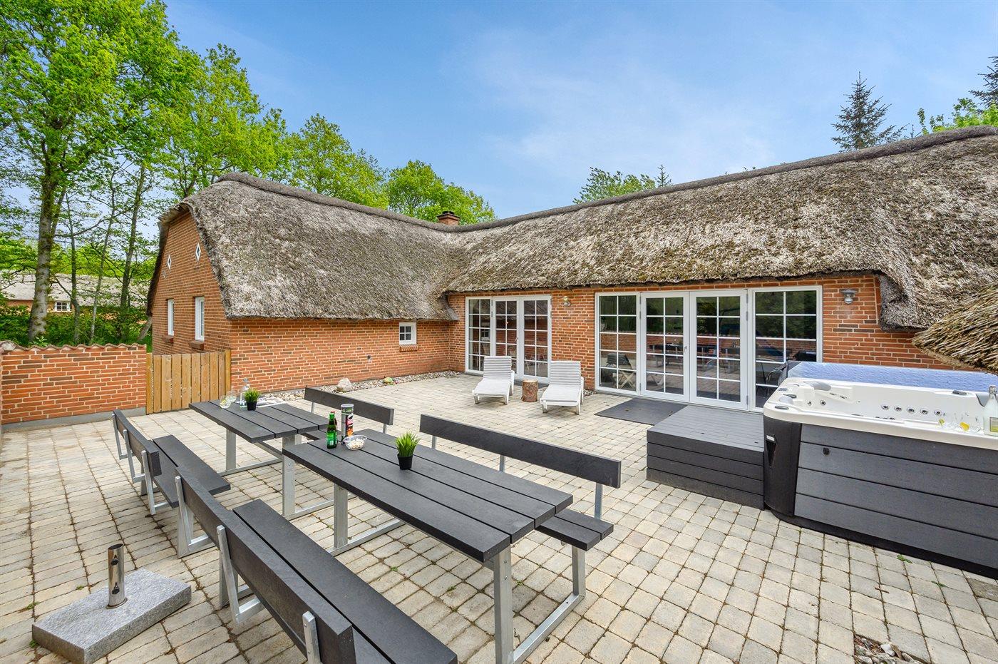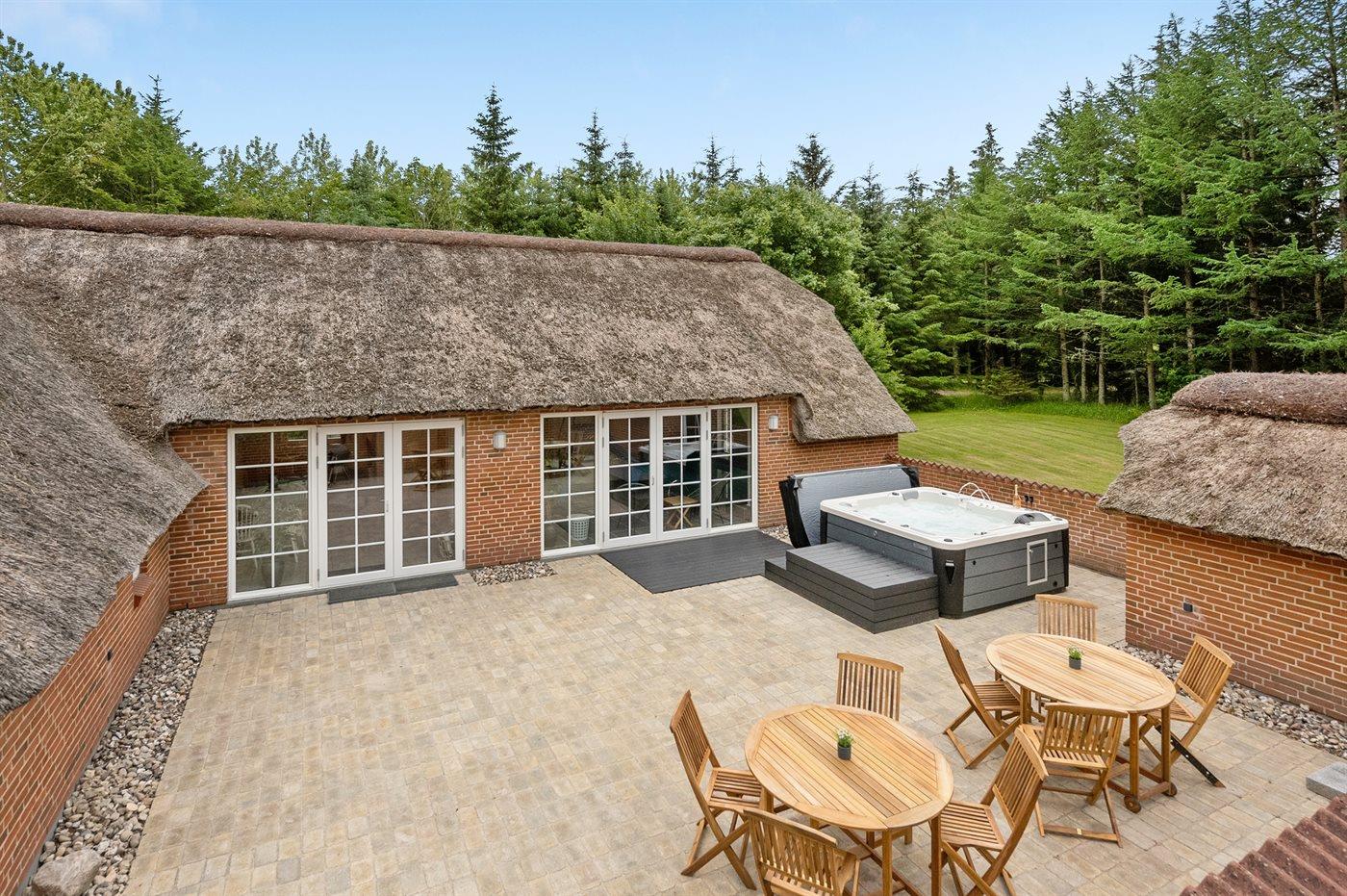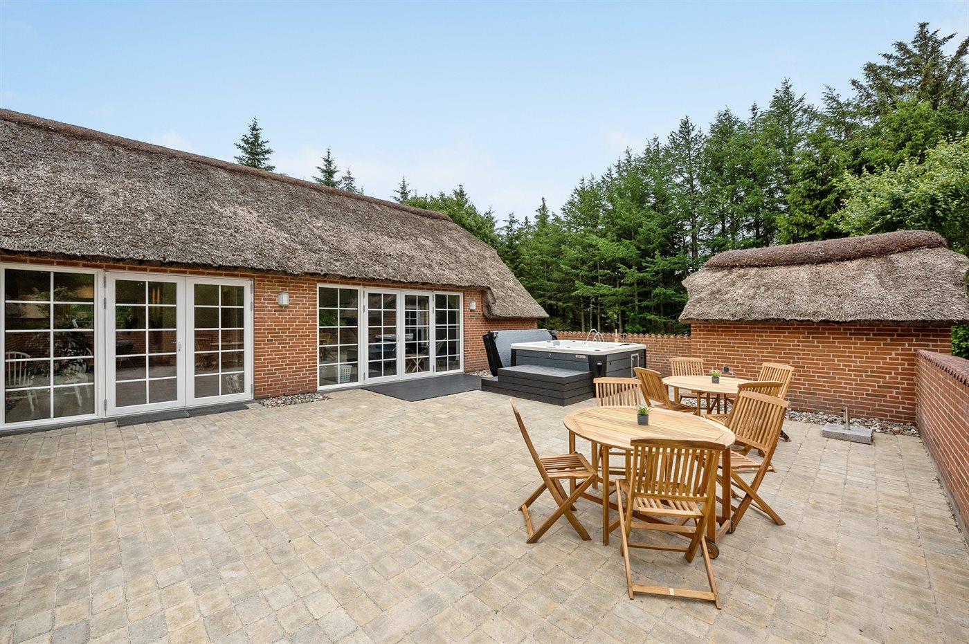 The holiday home is situated on a 5583 m² natural site. Situated 2300 m from the sea. Nearest shop is 4000 m away. You will find a golf course in a distance of 17000 m. A 85 m² terrace belong to the holiday home. Hereof a total of 85 m² enclosed terrace. You find a tool shed. Swing. Sandbox. Play tower. Football goal. Situated 200 m from a playground.Fire place. Shelter. Plug for charging electric car is available. Parking place by the holiday home.