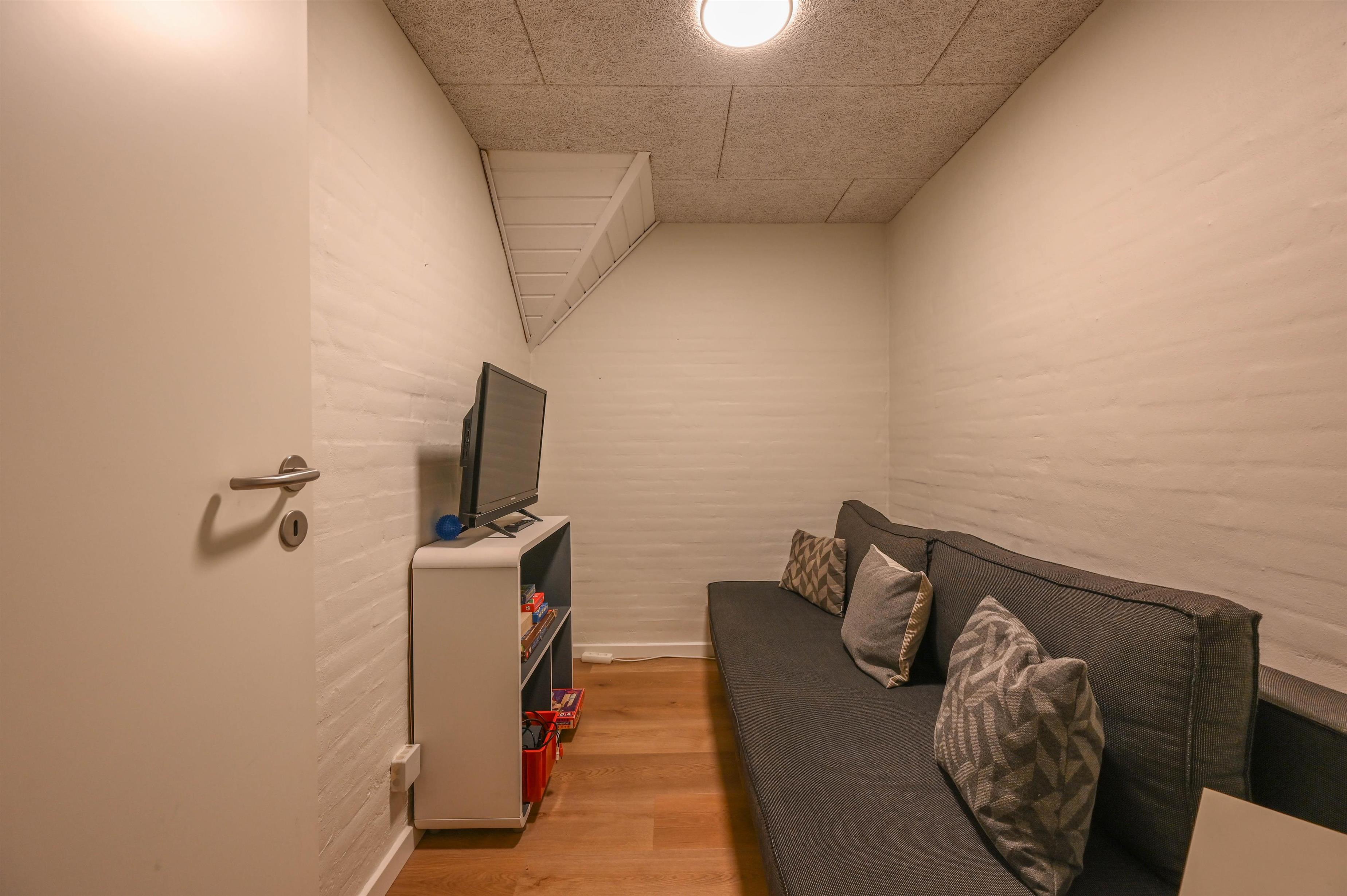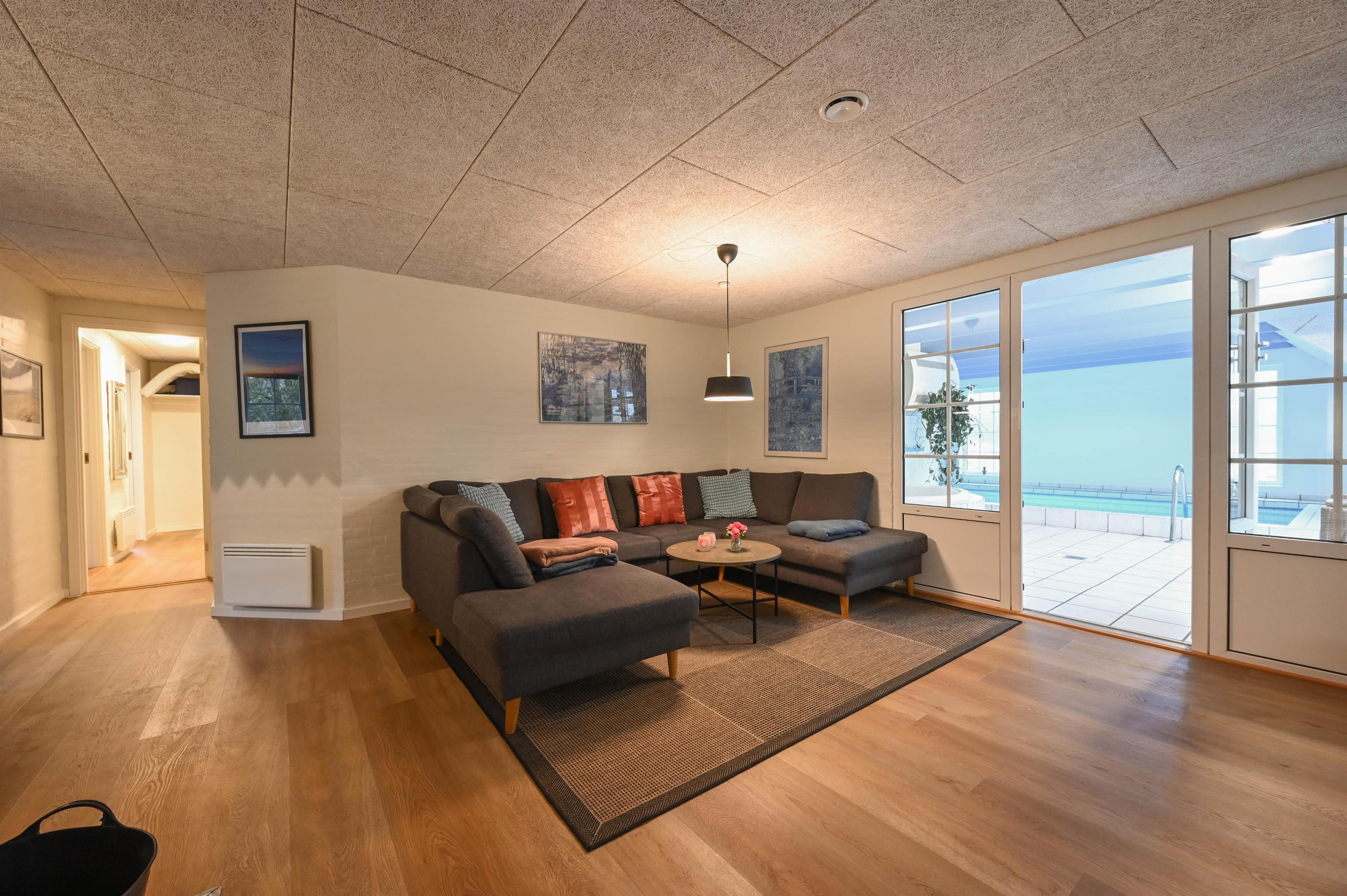 From the living room you can watch your children bathing through the large glass window. So you always have an eye on them, even if you don't want to go into the water yourself. There is another bathroom with toilet from the pool area, where you will also find a whirlpool and sauna.