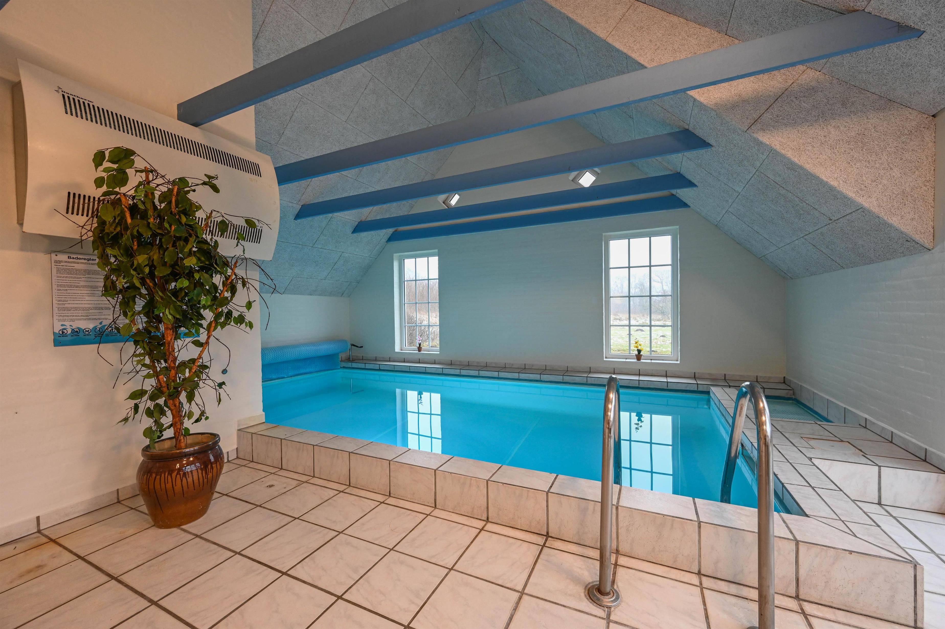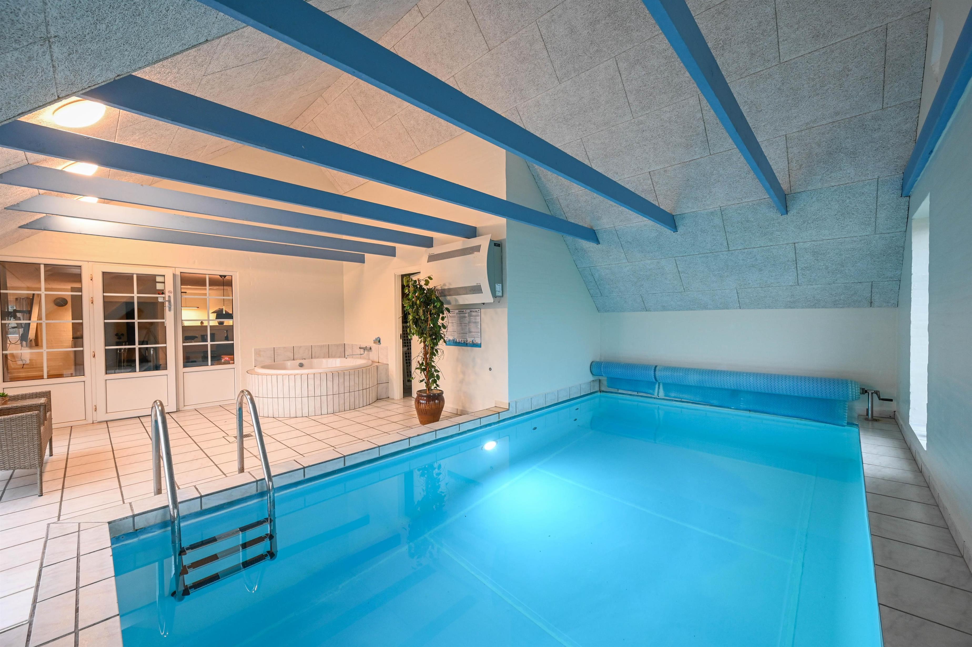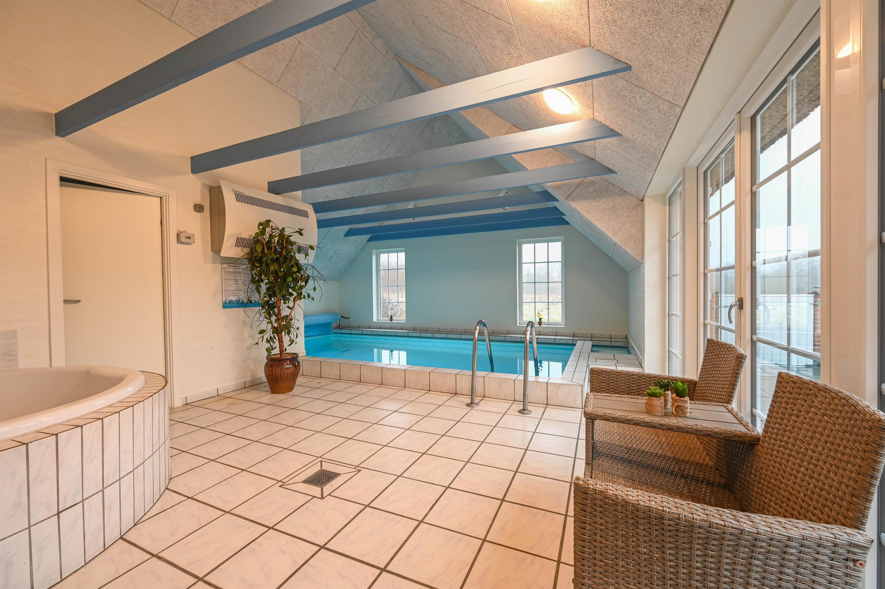 If you want to make your dream vacation a reality, this pool house is for you. In the swimming pool and also outside on the large property, children and adults can be active to their heart's content. You can really relax in the whirlpool and sauna or take a walk in the beautiful nature. The holiday home is wonderfully quiet on a 5,000 square metre nature plot in beautiful Vester Husby. Here you will find the sea, the forest and good shopping nearby.