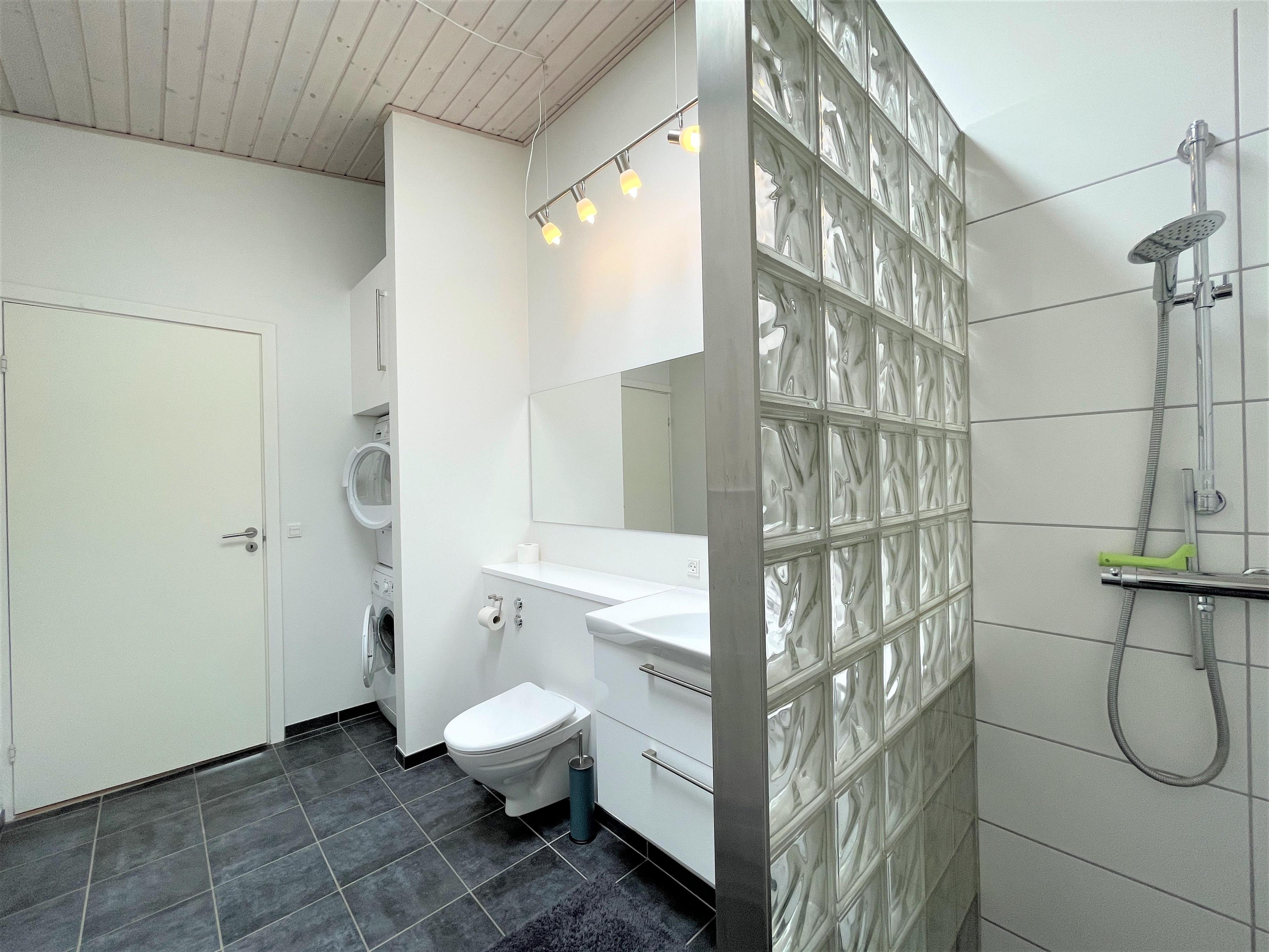 Auf der Terrasse befindet sich einen Aussenkamin und bequemen Gartenmöbeln. Grosses helles Badezimmer mit Dusche.