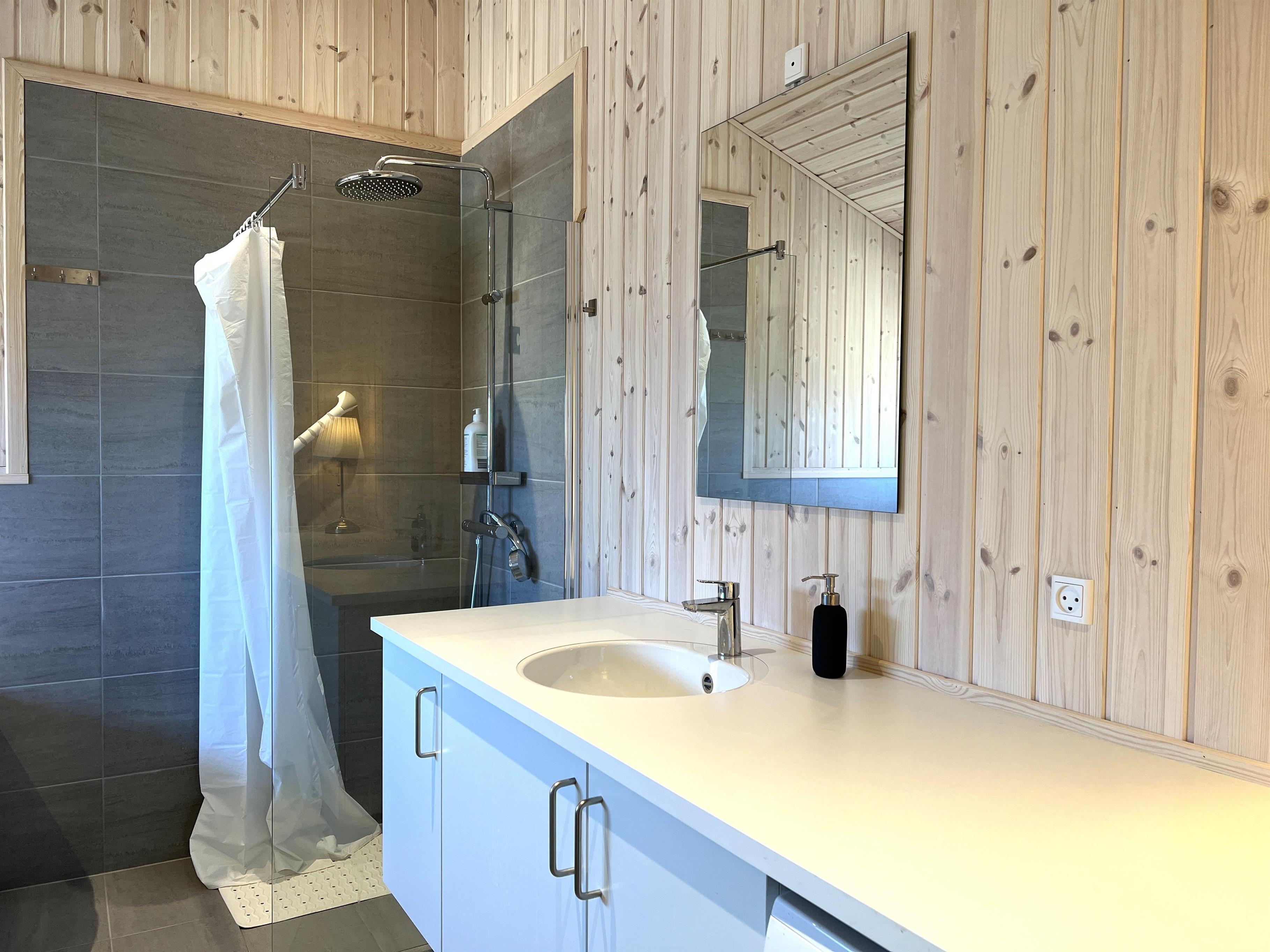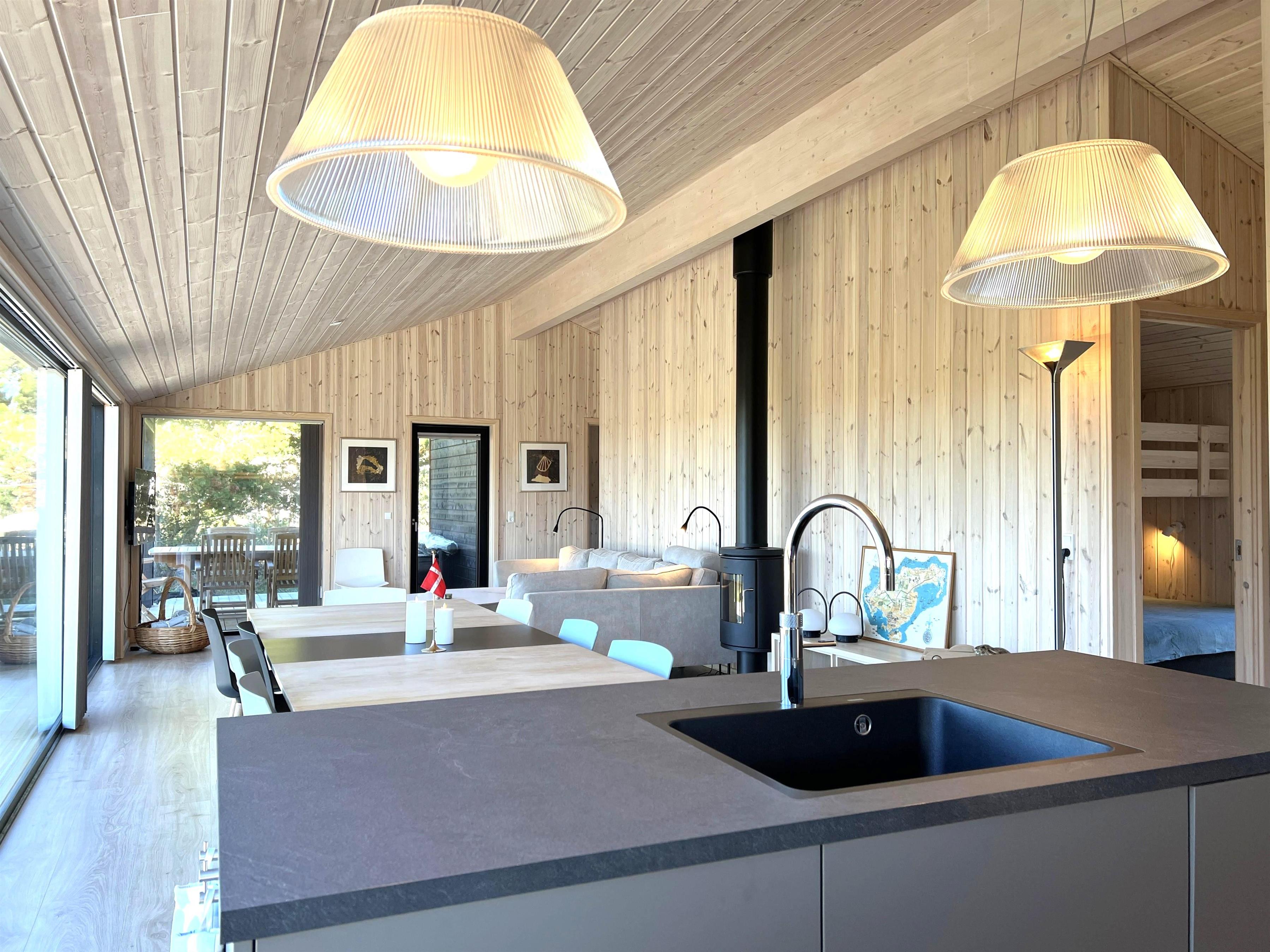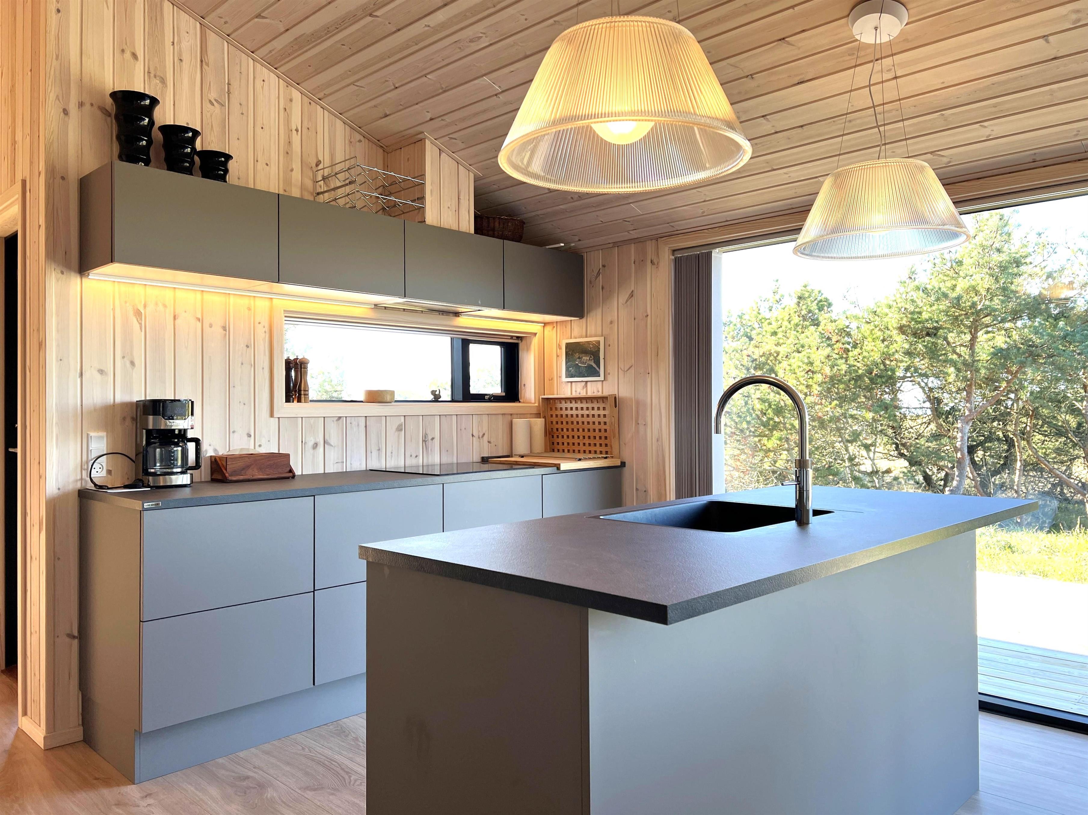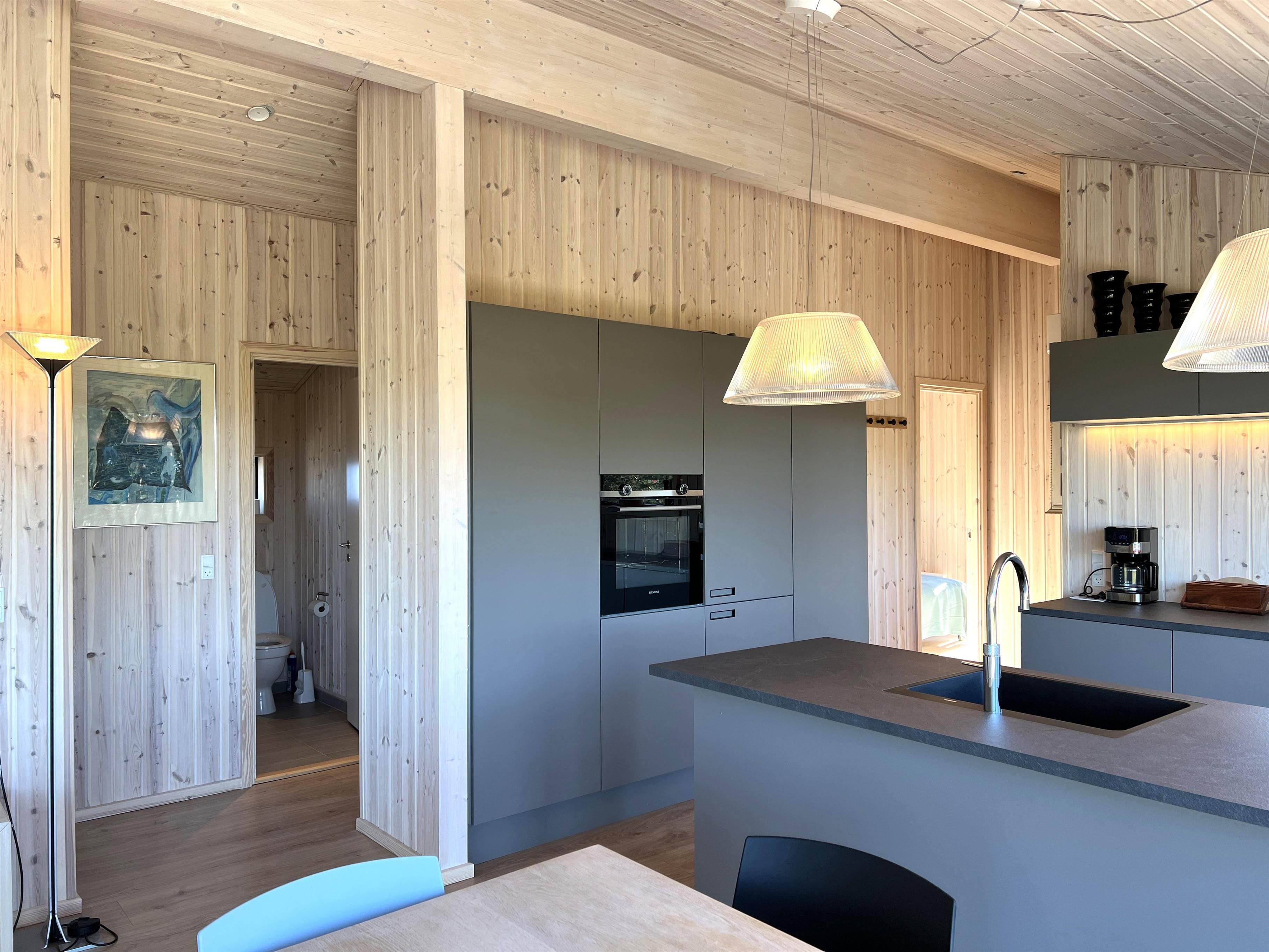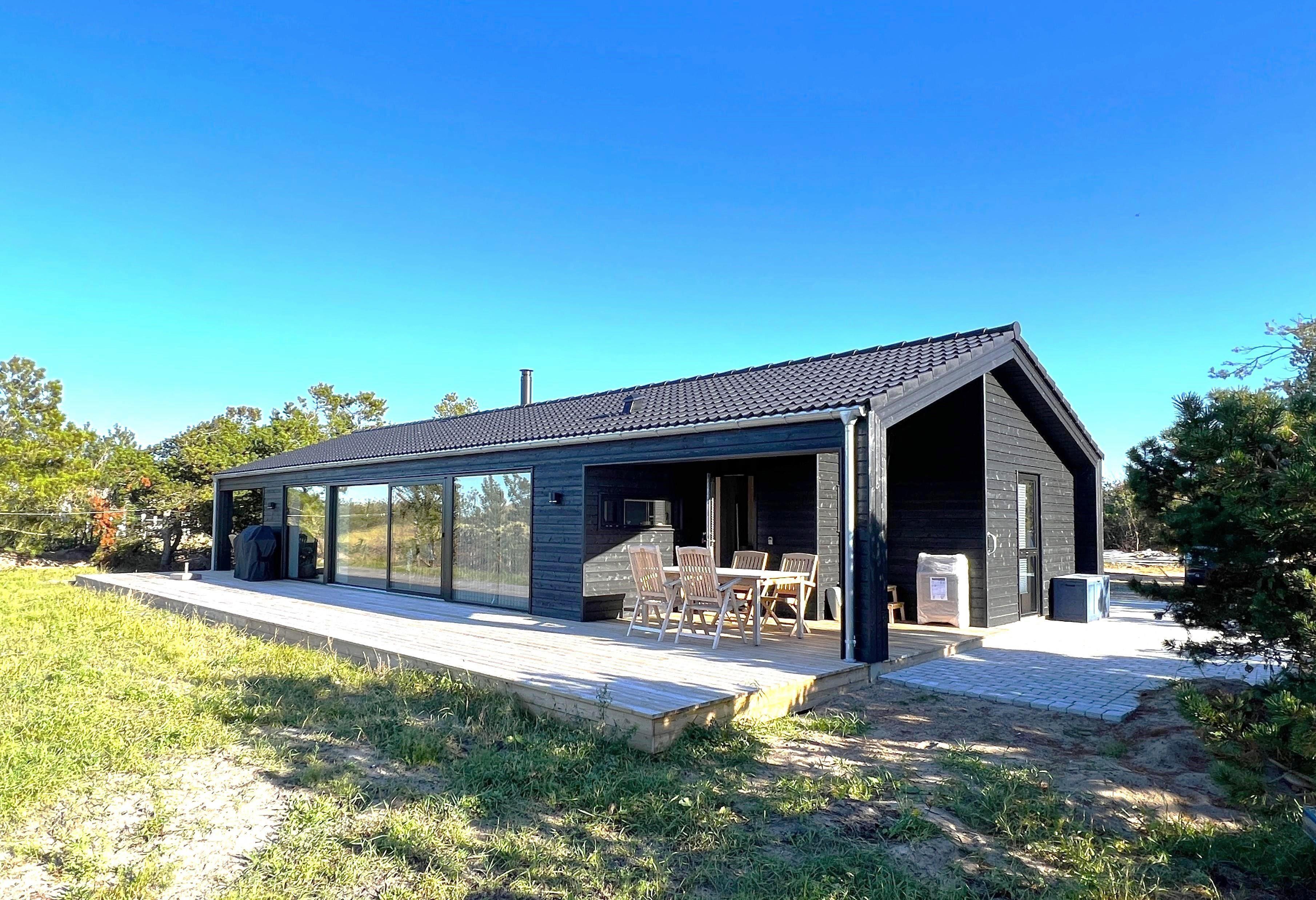MEERBLICK: Im Schutz der äußeren Dünen mit Meerblick und direkt neben Læsøs bestem Strand, Kongestranden, liegt dieses fantastische, nagelneue Ferienhaus. Neben der einzigartigen Aussicht zu fast allen Tageszeiten bietet das Haus Platz für bis zu 9 Personen. Das Haus verfügt über viele schöne Einrichtungen wie eine große, schöne und helle Wohnküche mit Kücheninsel, Esstisch und Sofabereich mit Holzofen. Vom gesamten großen Familienzimmer hat man einen Blick auf die blauen Wellen des Kattegats und Zugang zur großen Holzterrasse des Hauses, die teilweise überdacht und mit Gartenmöbeln und einem Grill ausgestattet ist. Das Haus verfügt über vier Schlafzimmer, von denen drei mit Doppelbetten und eines mit einem Etagenbett ausgestattet sind, wobei das untere Bett 140 cm breit ist. Es gibt zwei moderne, schöne Badezimmer, eines davon mit Sauna und Spa. Am Haus wurde eine Ladestation für Elektroautos installiert. Das Haus ist perfekt für z.b. gemeinsam reisende Familien.