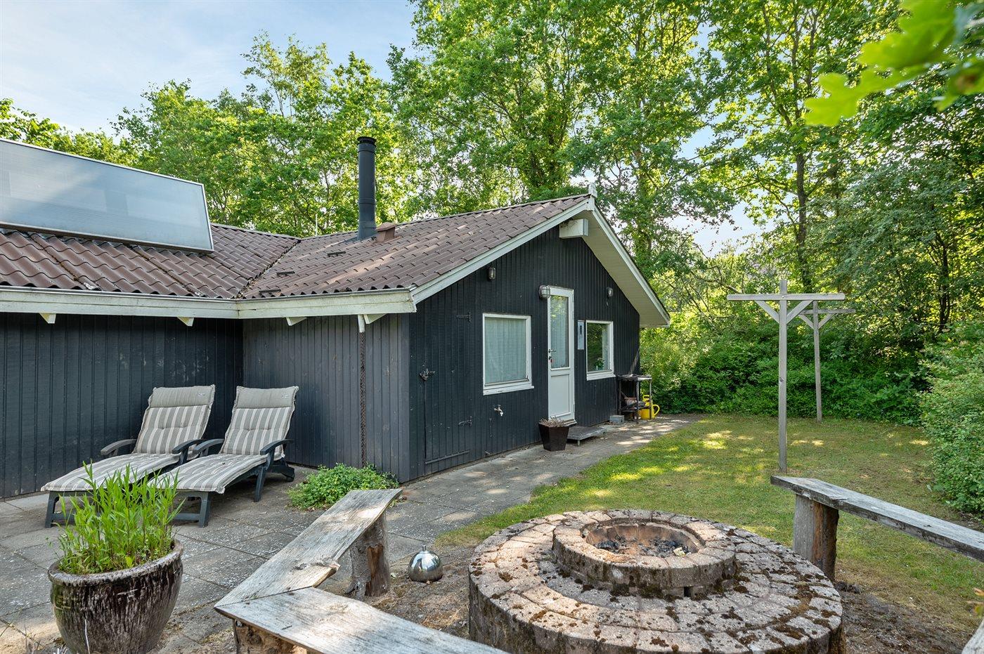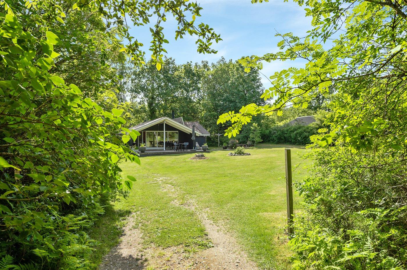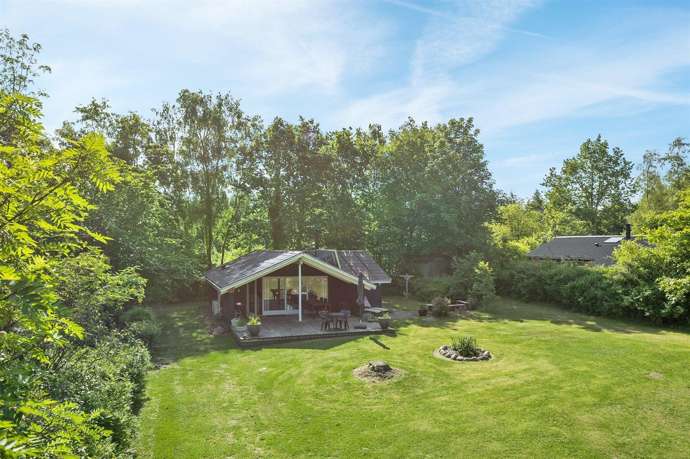 The holiday home is situated on a 1060 m² garden site. The site is fenced in. Situated 56500 m from the sea. Situated 100 m from lake. Nearest shop is 4000 m away. You will find a golf course in a distance of 10000 m. A 10 m² terrace belong to the holiday home. Furthermore the house has a 16 m² covered terrace. Situated 200 m from a playground.Fire place. Parking place by the holiday home.