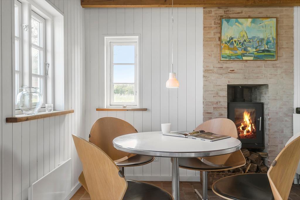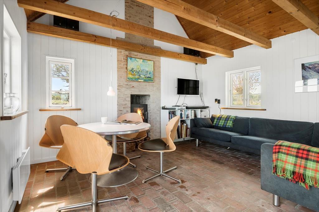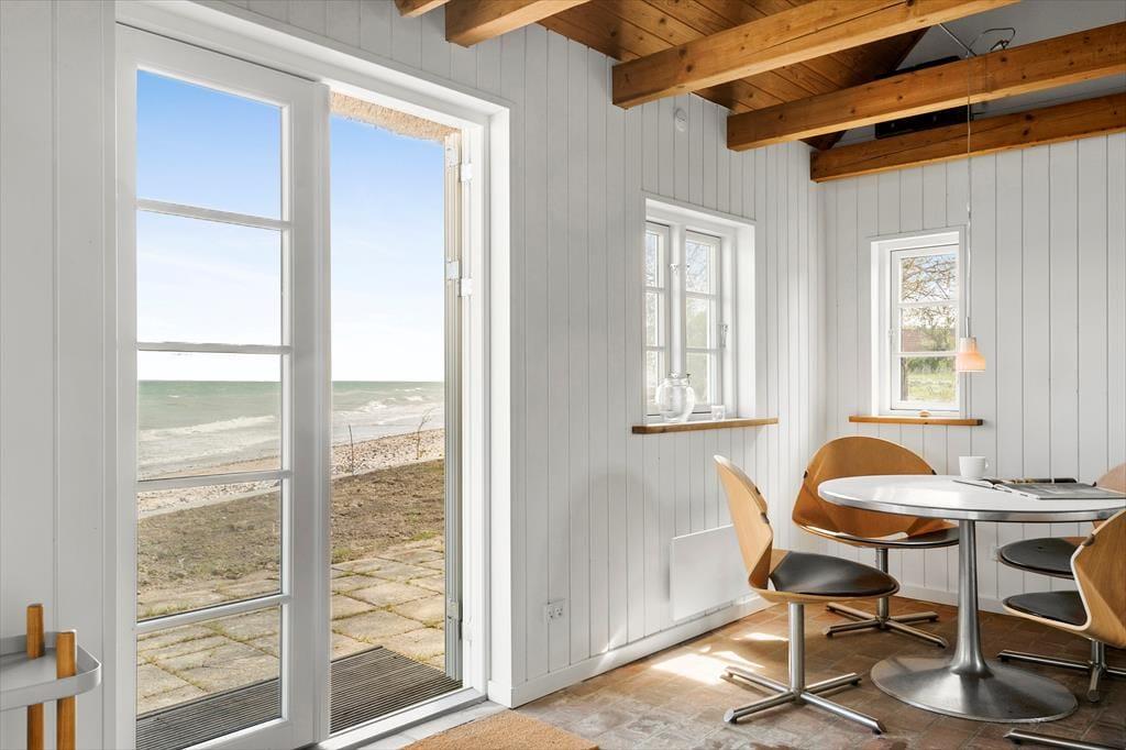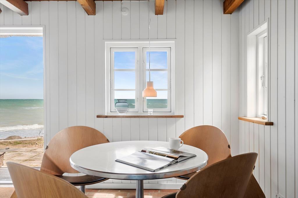 Wohnzimmer mit Aussicht zum Wasser und Zugang zur Morgenterrasse. Essecke.