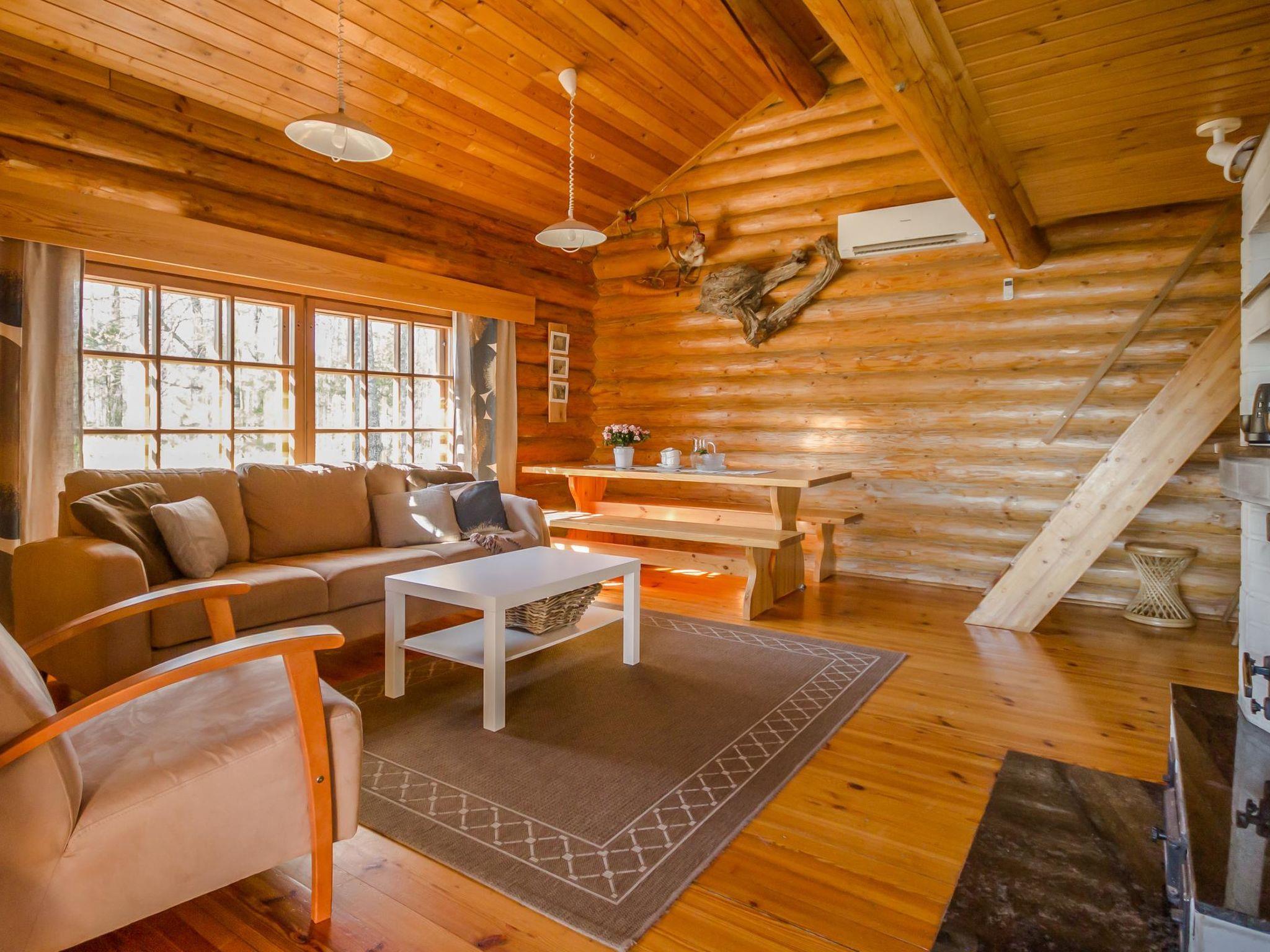 Log cabin 1994, kitchen, living room, sleeping loft (sloping ceilings, low room height, steep stairs) 4 beds and wide mattress for 2 persons and crib, dressing room, sauna (wooden heated), shower in sauna, open veranda.