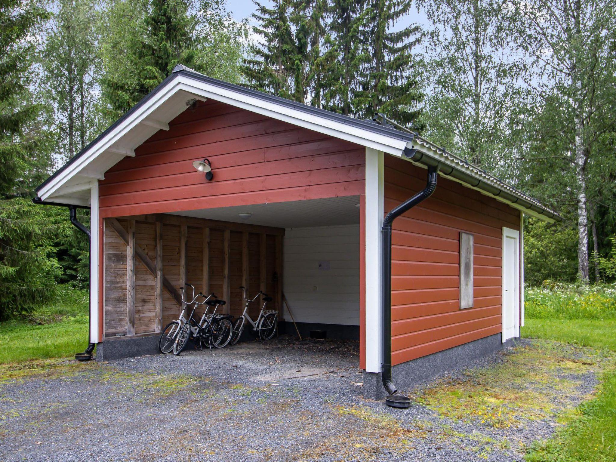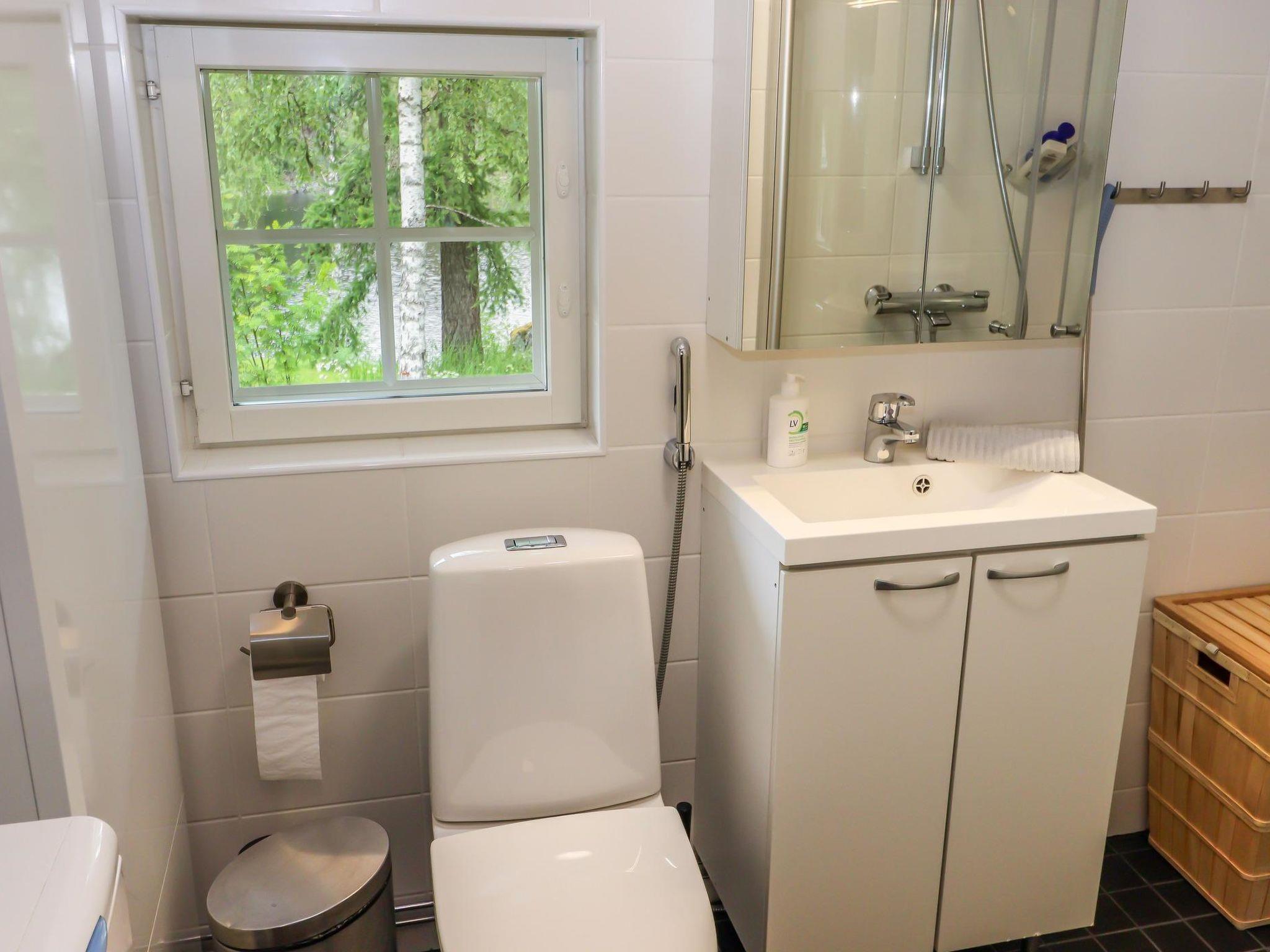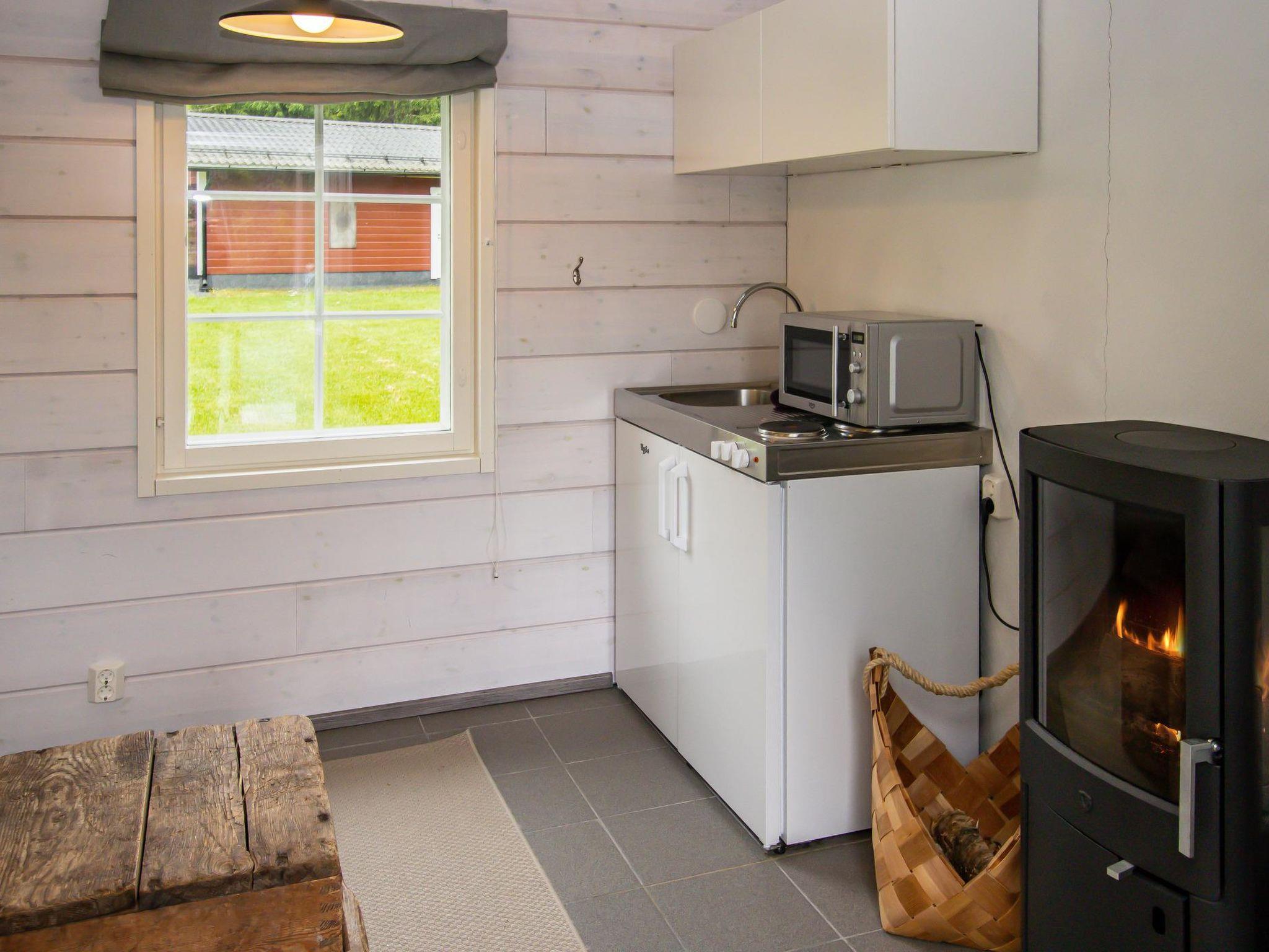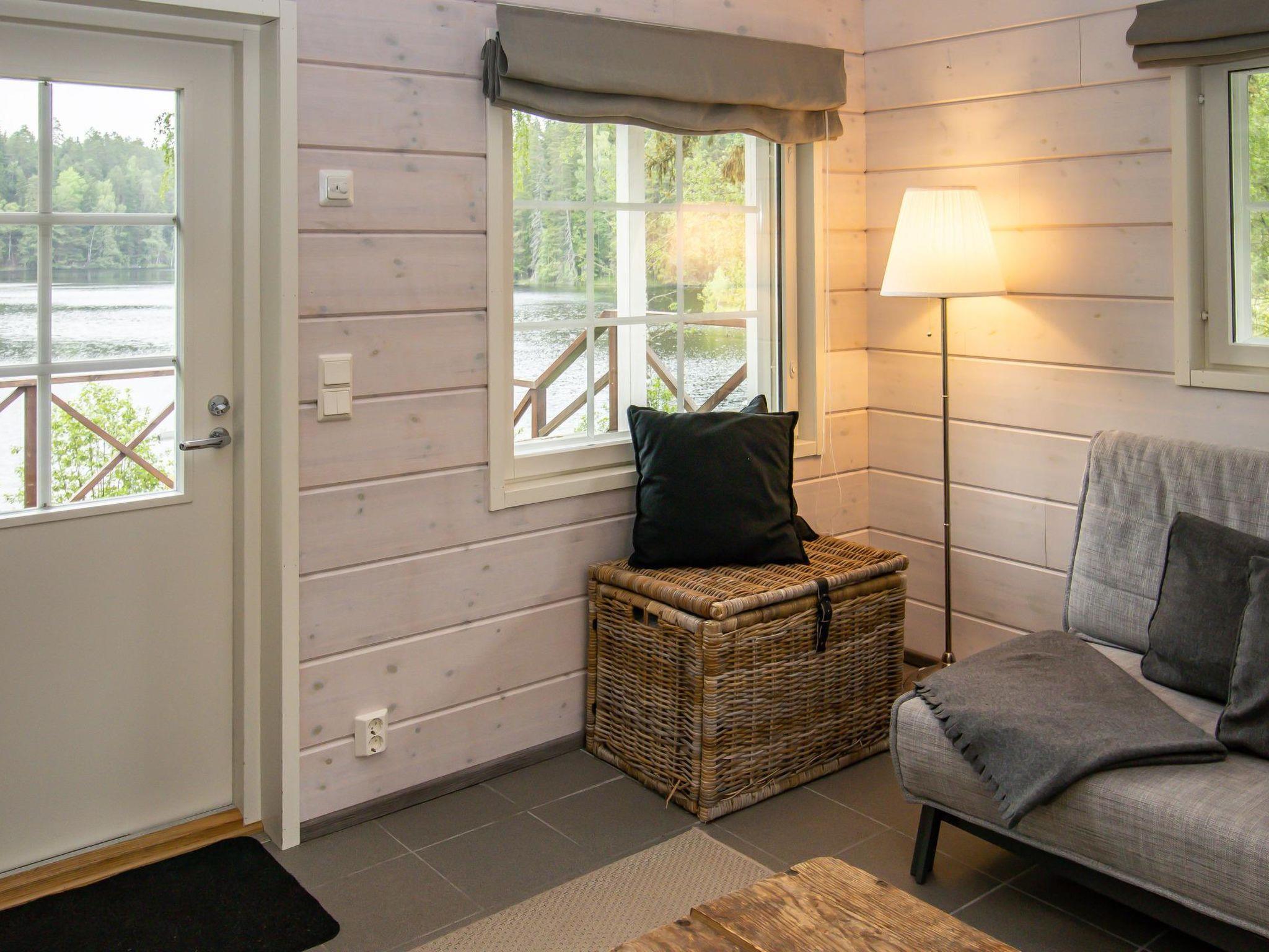 The wood-heated lakeside sauna includes a living area with a mini kitchen, fireplace, and a sofa bed (120 cm wide when opened). The sauna building also has a washroom with another WC. The pier has deep water, and the shoreline is steeply deepening and soft — only for people with swimming ability.