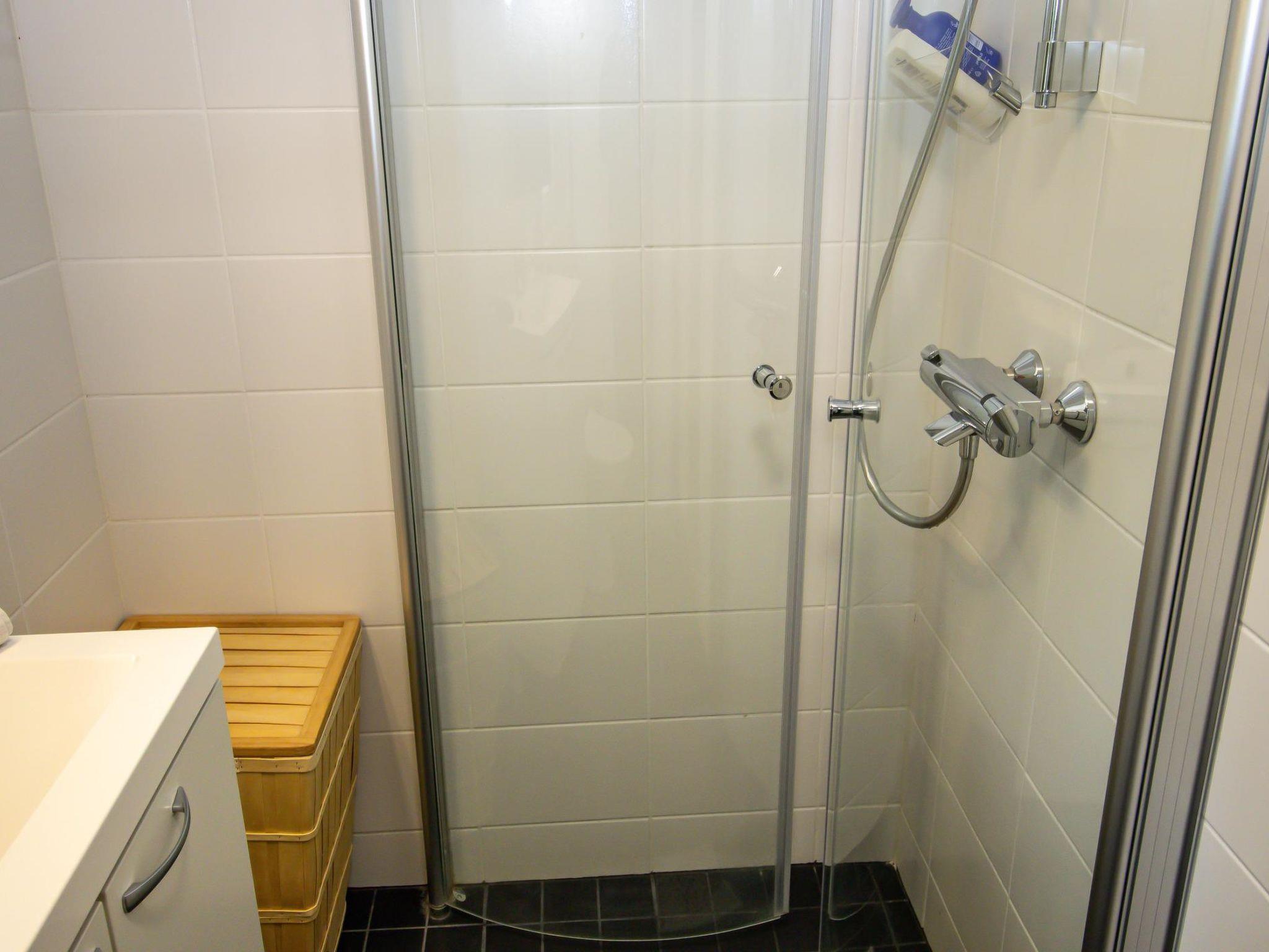 Inside the main cabin, you’ll find a spacious kitchen with a dining group for 12 persons, a living room with two sofa beds (140 cm wide when opened), and a separate bright living area. The bedroom includes two 80 cm single beds. The WC and shower facilities also have a washing machine. A gas grill is available on the cabin’s terrace.
