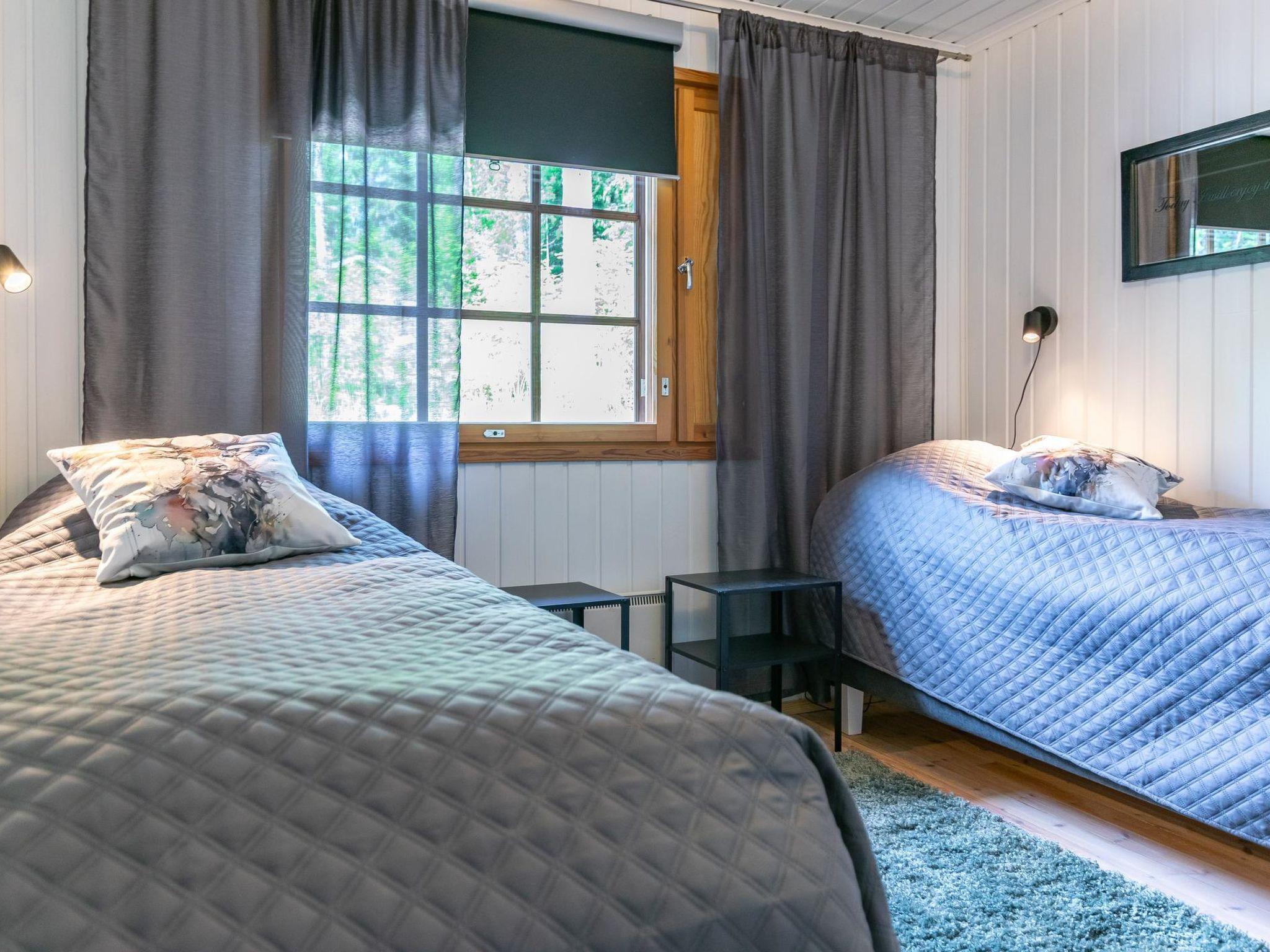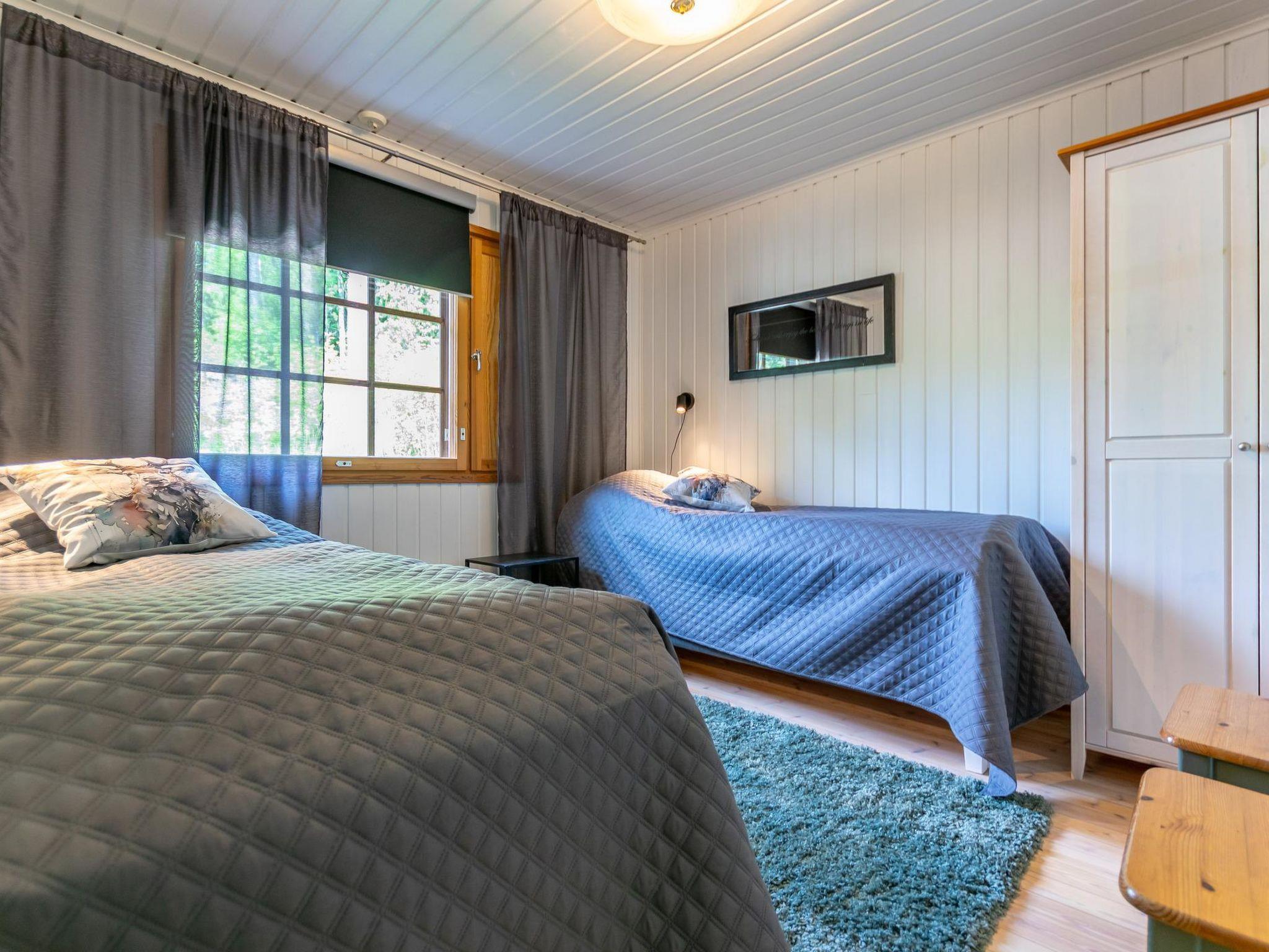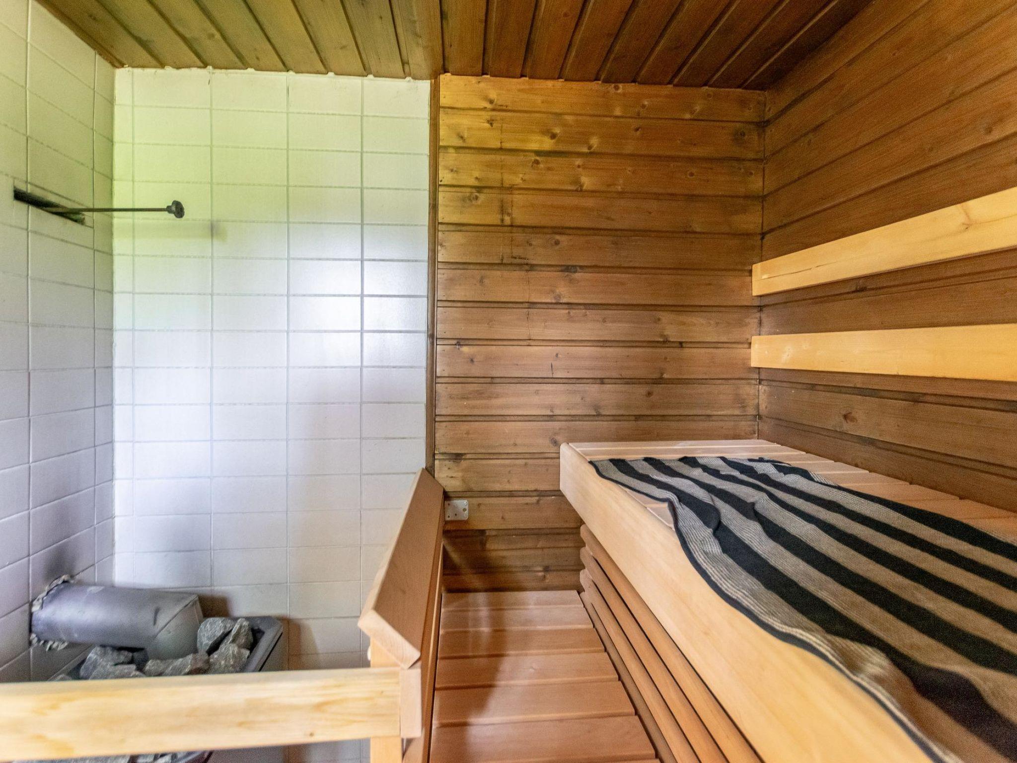 Downstairs there are two bedrooms. One bedroom has a double bed and the other two single beds. Downstairs there is also a sauna (wood-burning stove), a washroom with a shower and toilet, a dressing room with access to the terrace and a separate toilet. Upstairs is the loft with sleeping area for three persons.