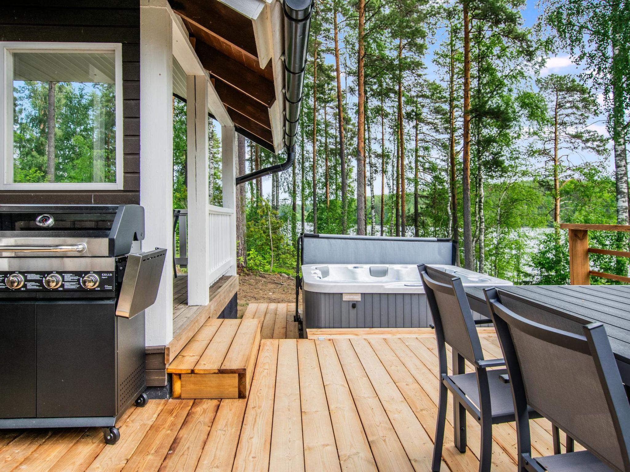 A spacious terrace with a smaller covered part and an open space with high-quality garden furniture and a whirlpool and a gas grill. There is a separate barbecue hut with a fireplace on the shore.