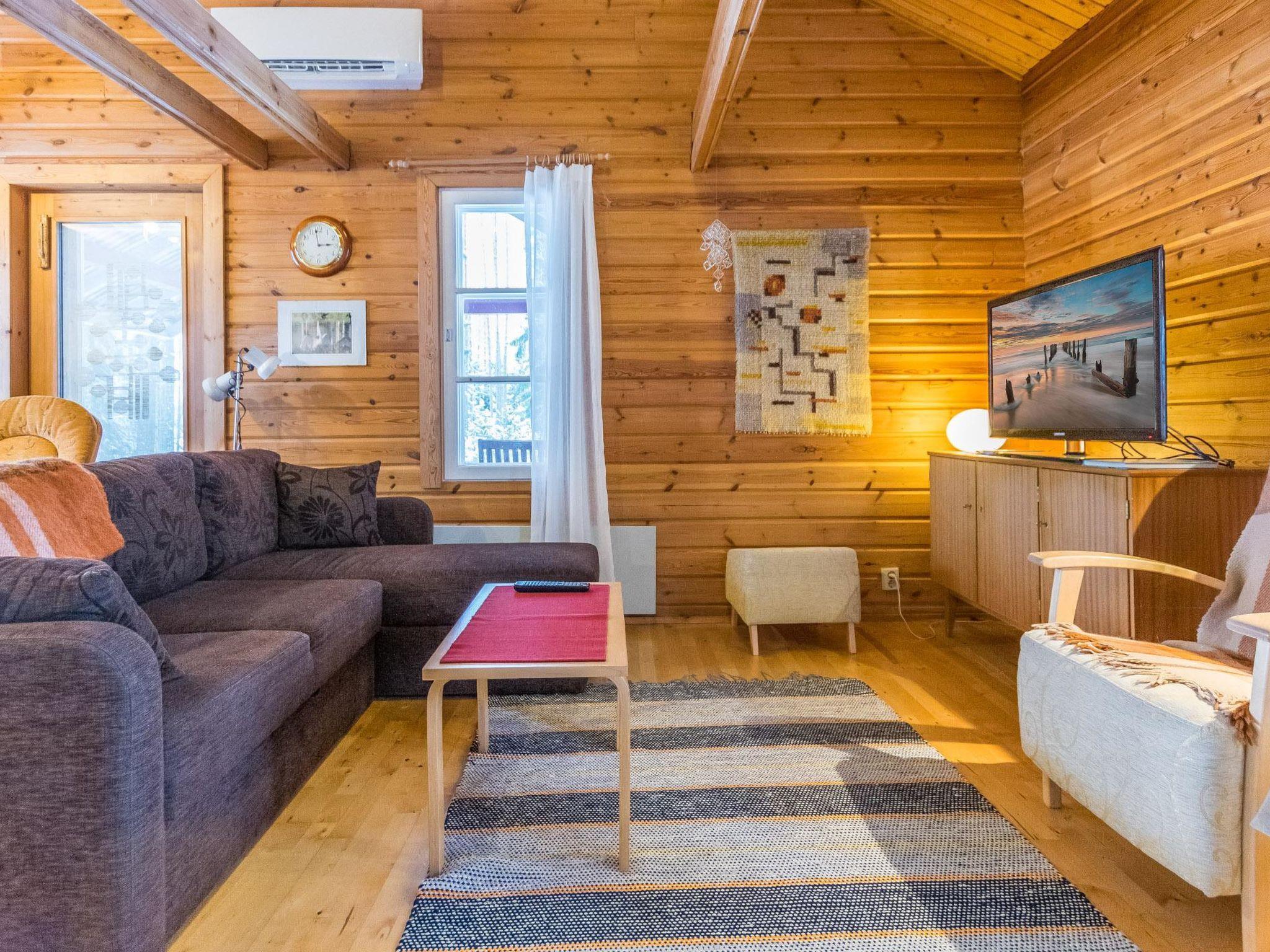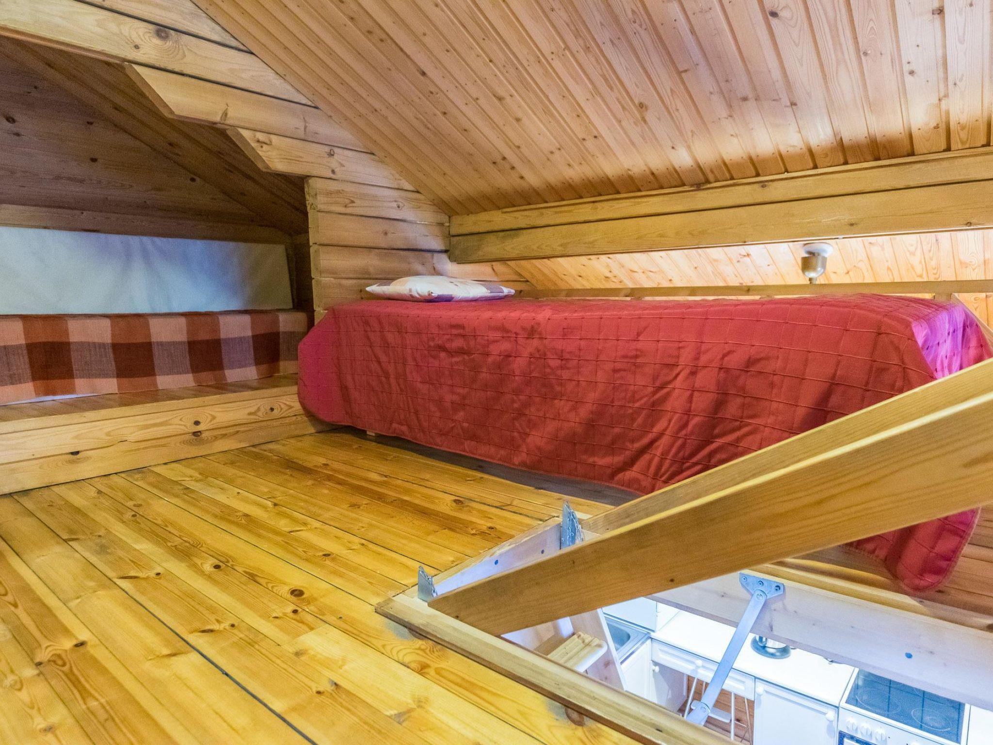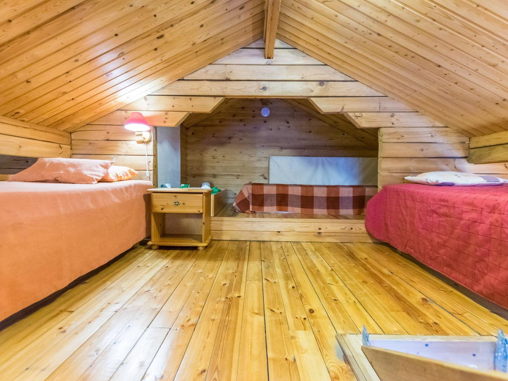 The log cabin, built in 1985, features a living room/kitchen with a sofa set, TV, fireplace, and an air source heat pump for heating and cooling. The fully equipped kitchen includes a dining group for six people. The cabin has one bedroom with a double bed and a separate storage space with a curtain, which also includes a work desk. From the living room, a ladder leads to a sleeping loft, which has three beds with box springs.