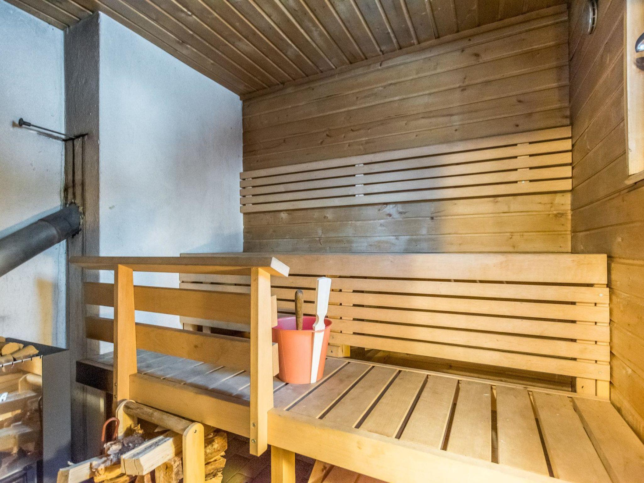 The wood-heated sauna includes a shower, WC, and washing machine in the washroom. The cabin also features a glazed porch with a seating area and a gas grill, as well as a small covered porch with a table and two chairs. A woodshed is located in the yard building.