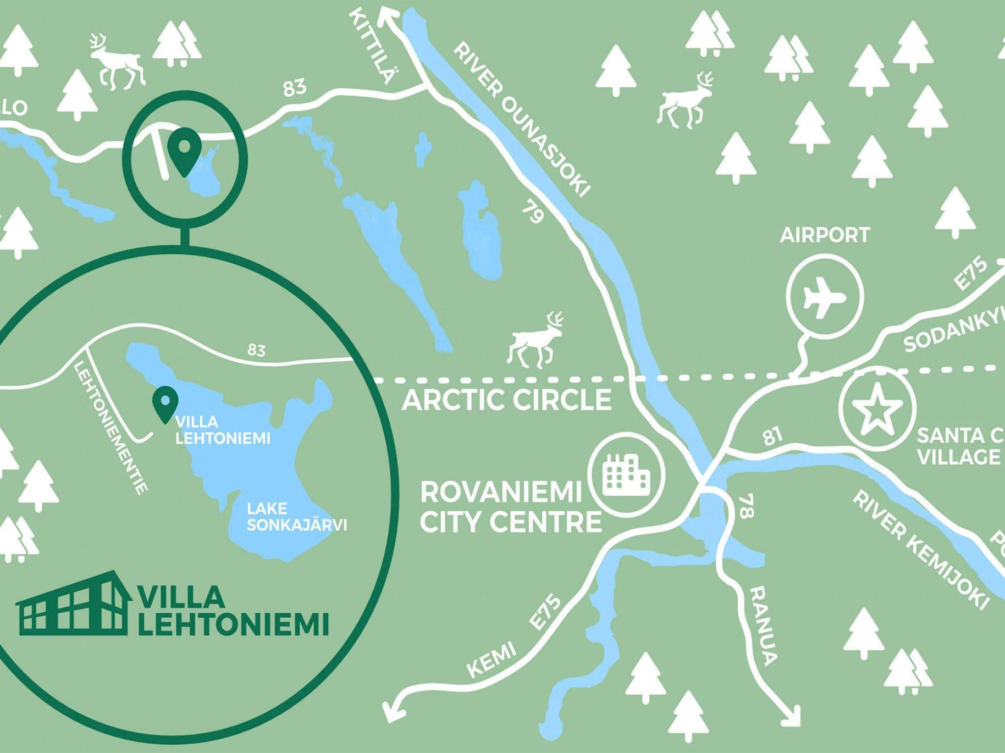 Villa Lehtoniemi is a magnificent large villa in the middle of beautiful landscape by the lake, half an hour's drive from the center of Rovaniemi. Thanks to the villa's many large windows, you can enjoy the surrounding scenery inside the villa. It is also possible to view the northern lights, for example, from the bedrooms, which are 5 in total.