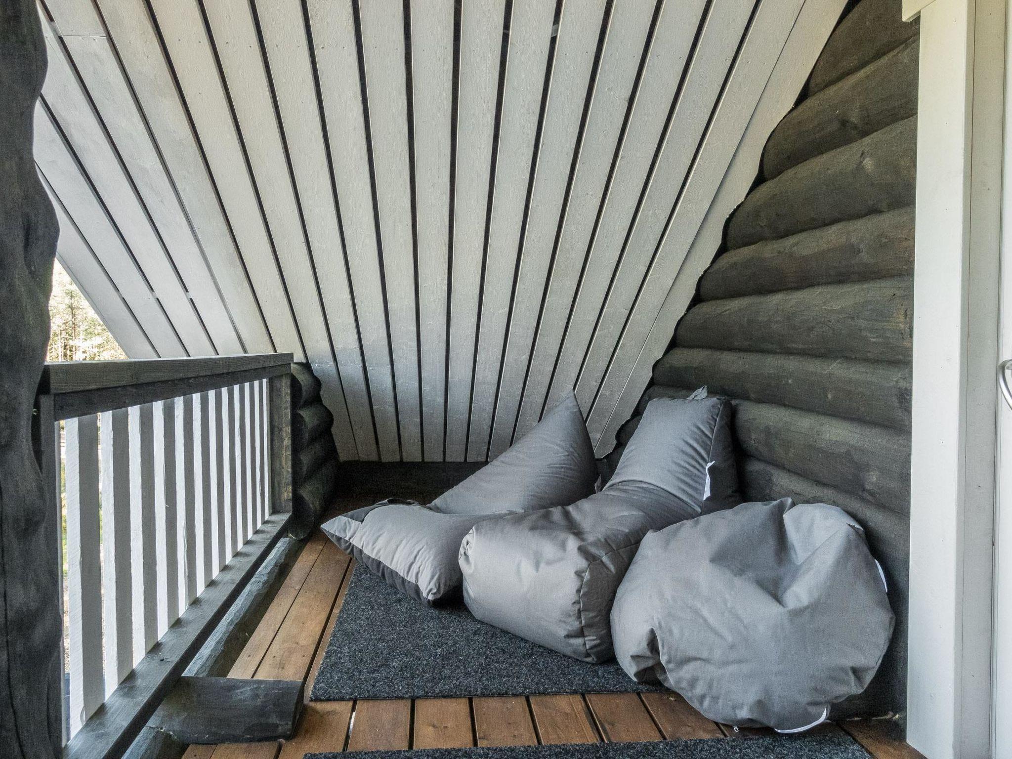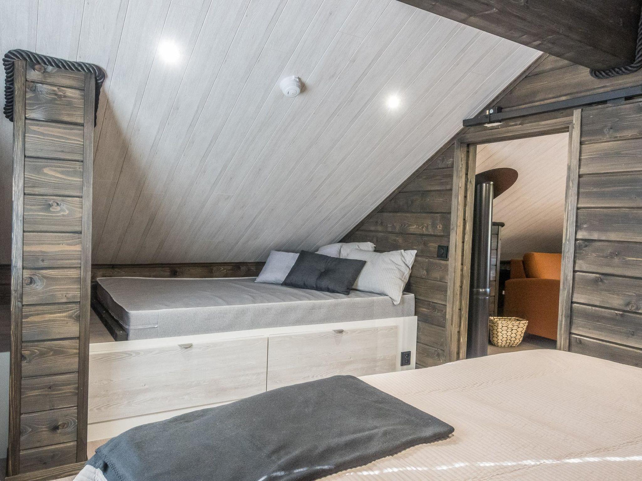 On the upper floor, there is a bedroom with a double bed (180 cm wide) and a separate bed (120 cm wide). There is also a loft with a sofa bed. Access to a balcony from the loft. The balcony is equipped with bean bag chairs. Please note that the stairs leading to the upper floor are steep.