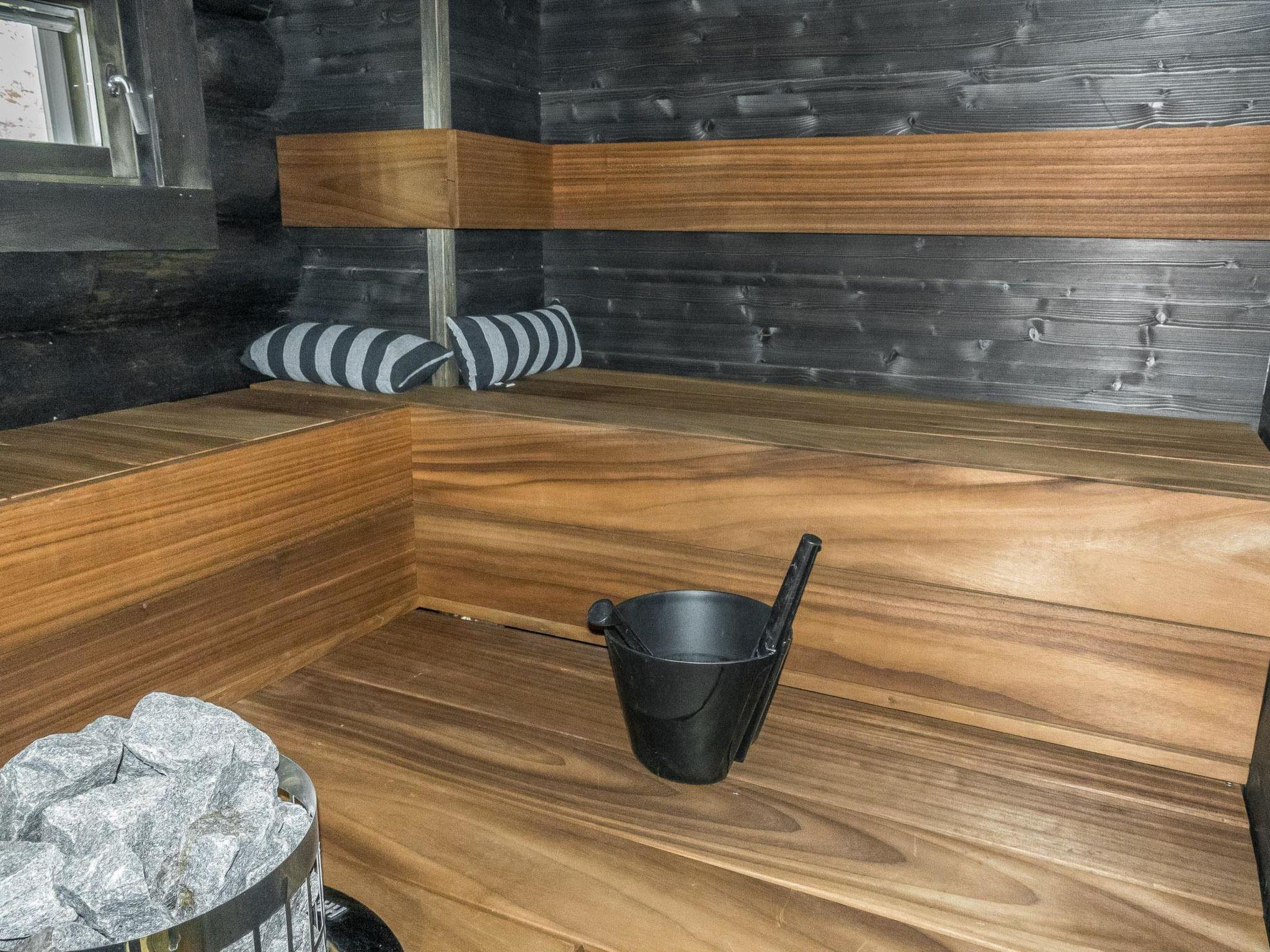 The cabin's facilities are spread across two floors. The ground floor features a living room/kitchen, a bedroom with double bed, a sauna, a bathroom, and a covered terrace.