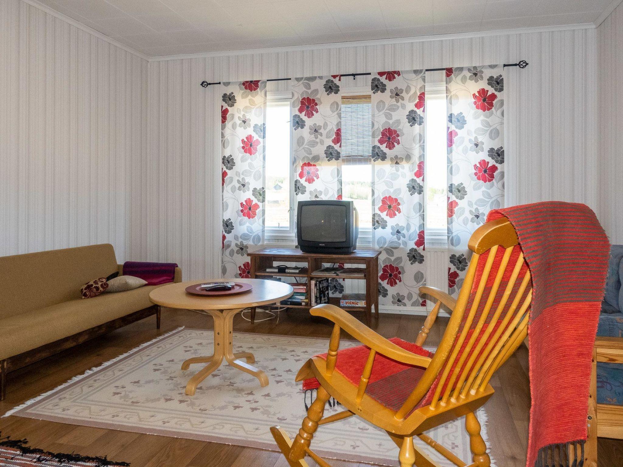 Gable apartment in a row house containing three apartments in total. The house is log-built (board lining, interior walls partially covered), former apartment in village school building, built in 1947 and renovated in 2015.