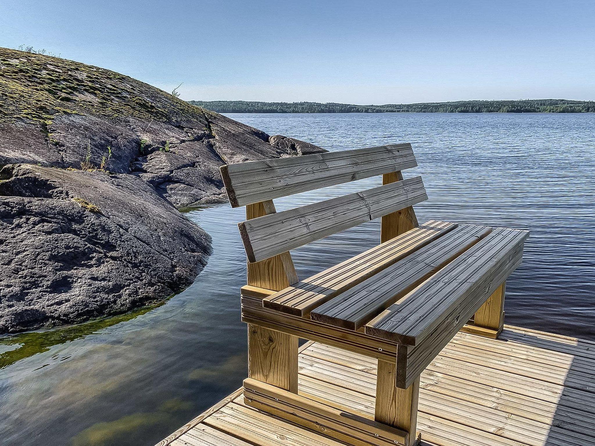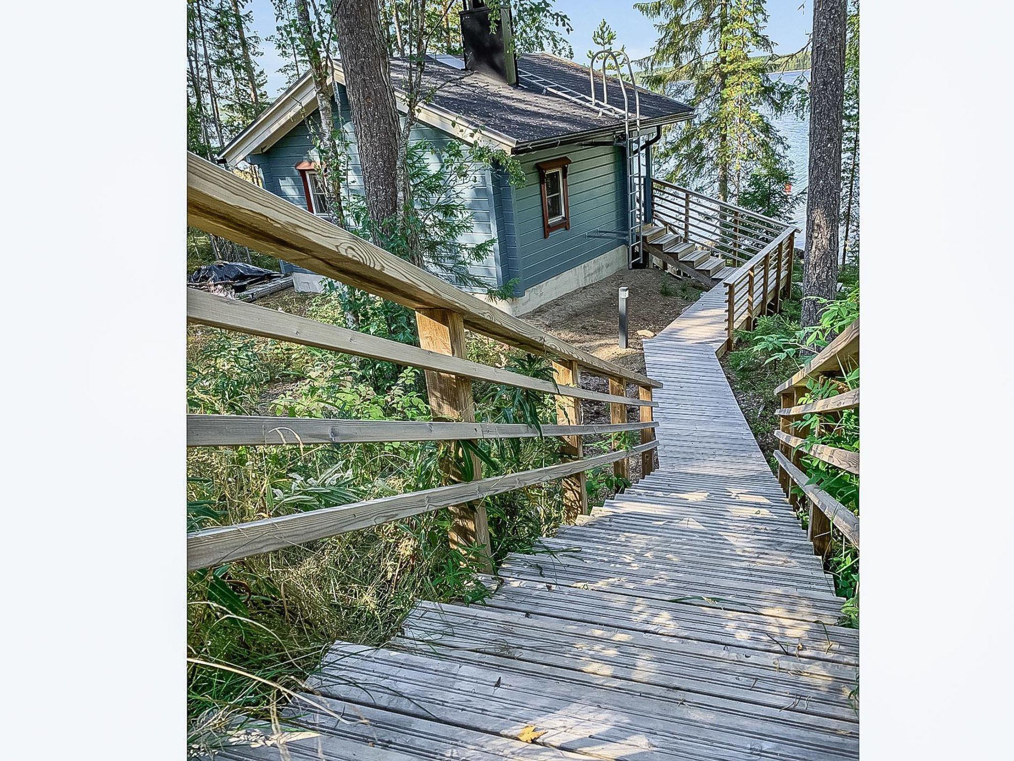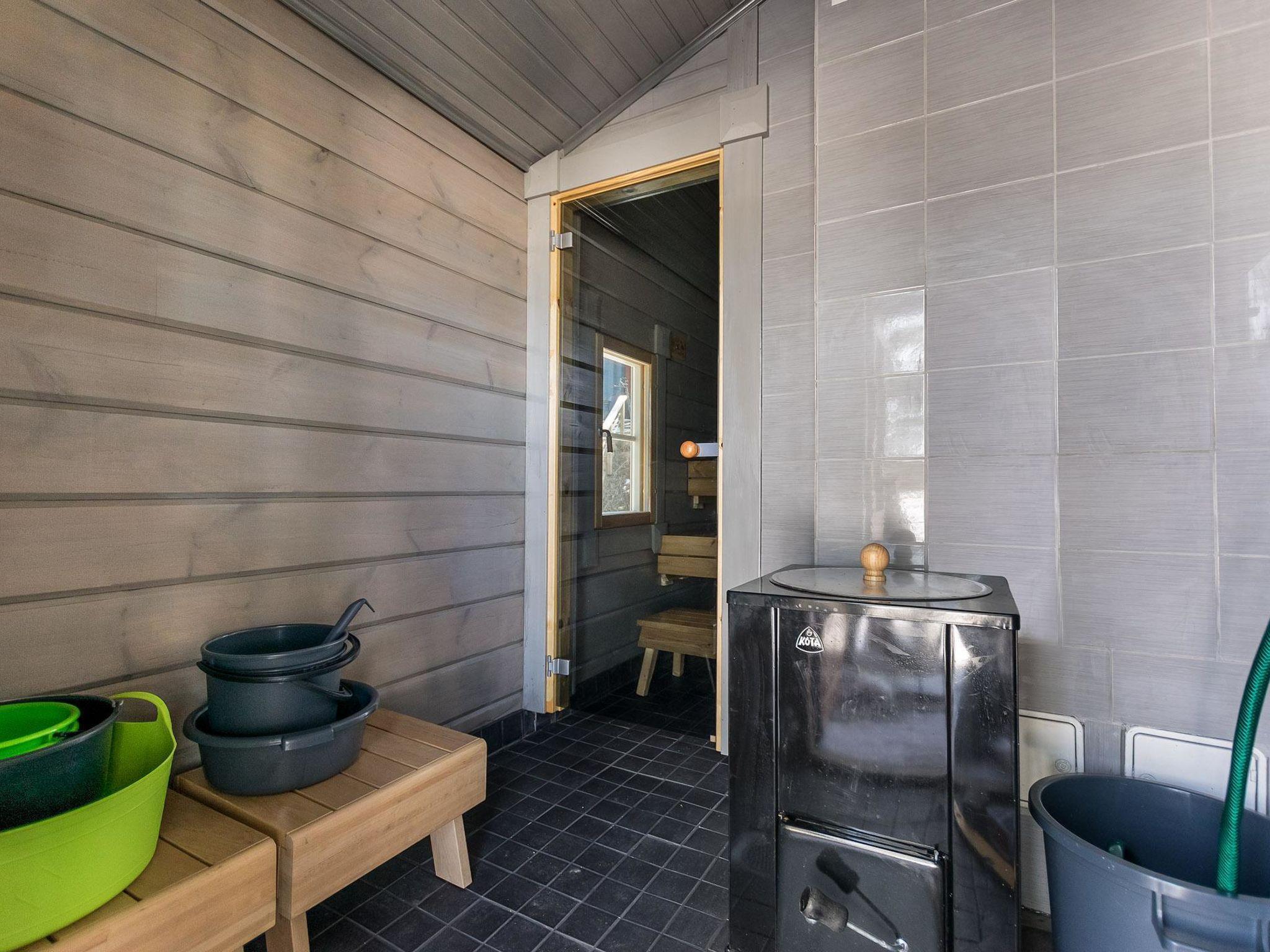 Separate lakeside sauna with electric light, steam room (wood-heated sauna stove), washroom (cold water from the lake with pumps for summer time, in addition to the wood heated water stew), dressing room with seats for four and wood-fired stove.