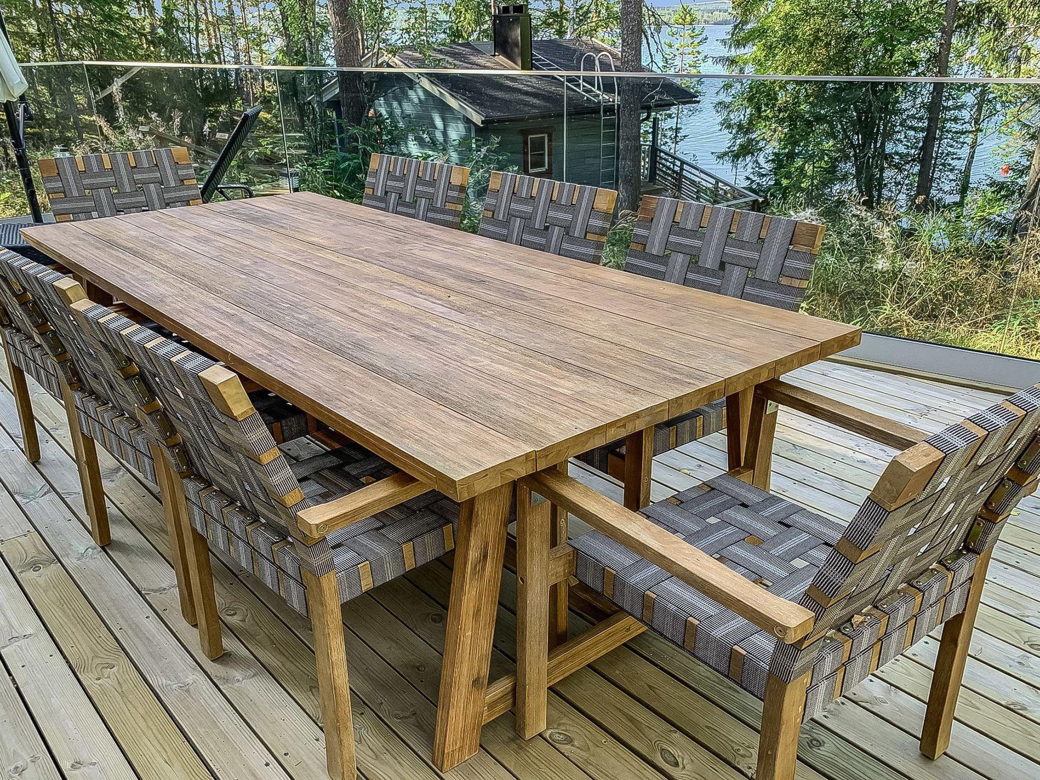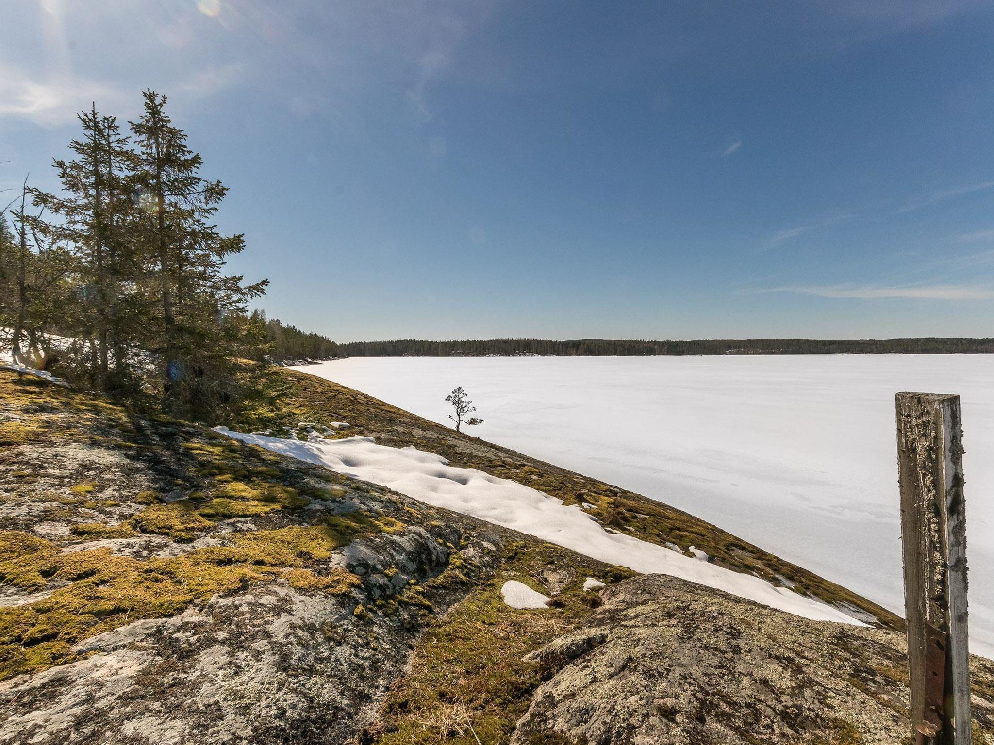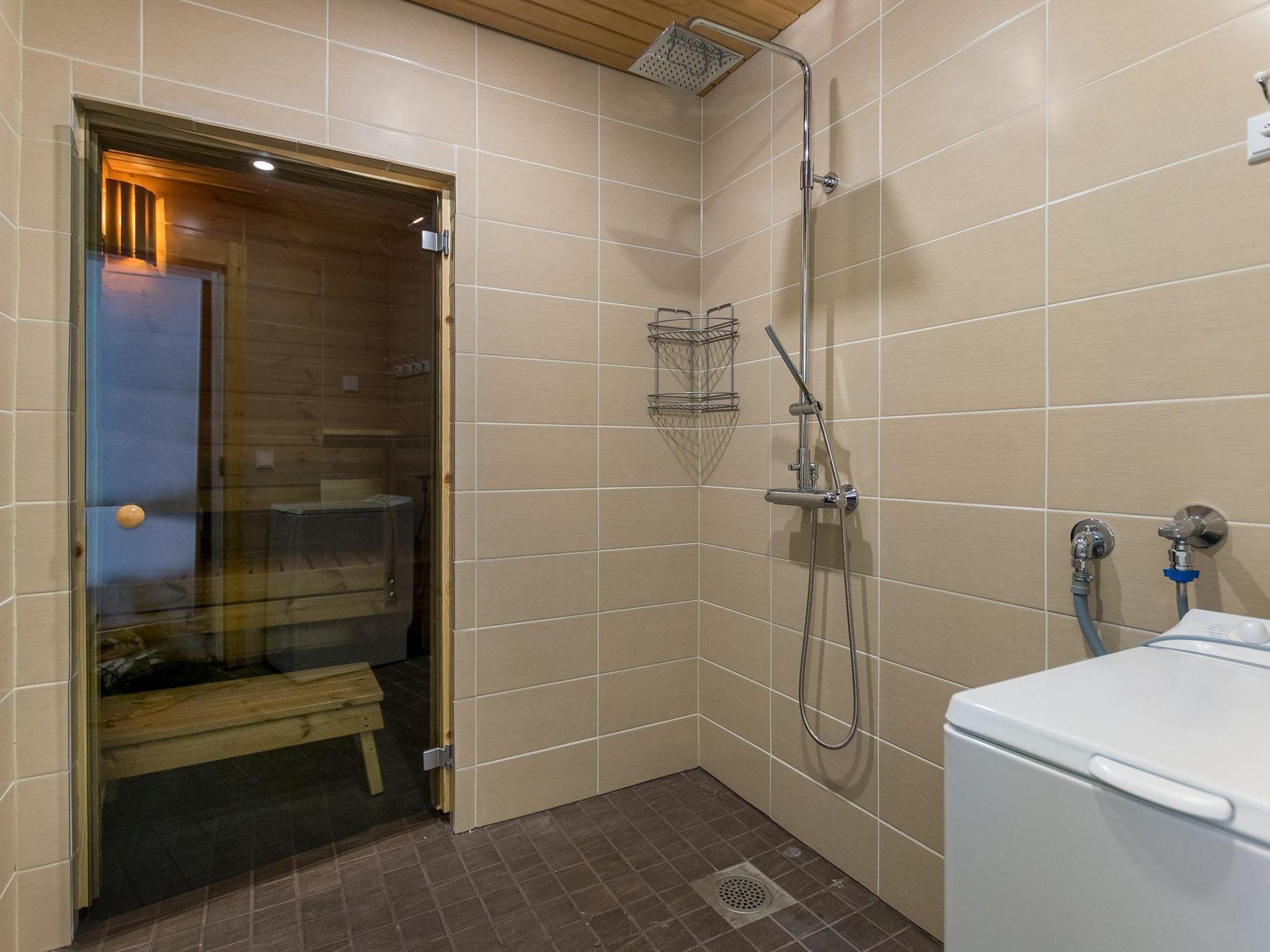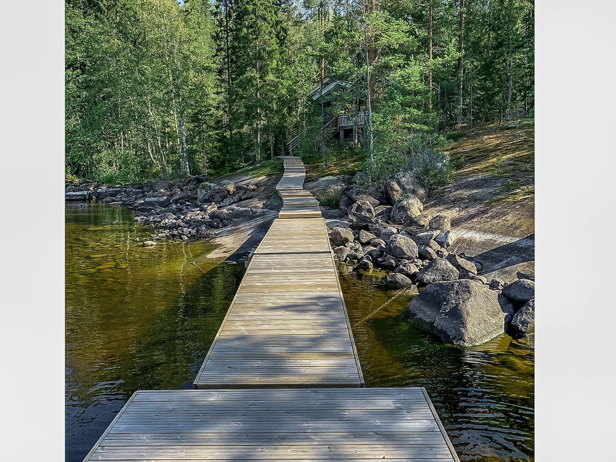 Separate lakeside sauna with electric light, steam room (wood-heated sauna stove), washroom (cold water from the lake with pumps for summer time, in addition to the wood heated water stew), dressing room with seats for four and wood-fired stove.