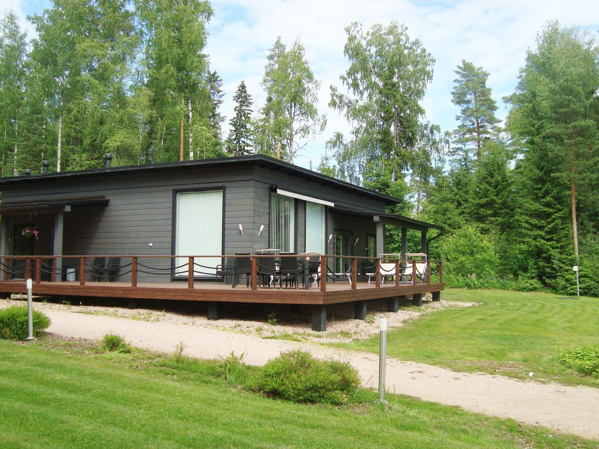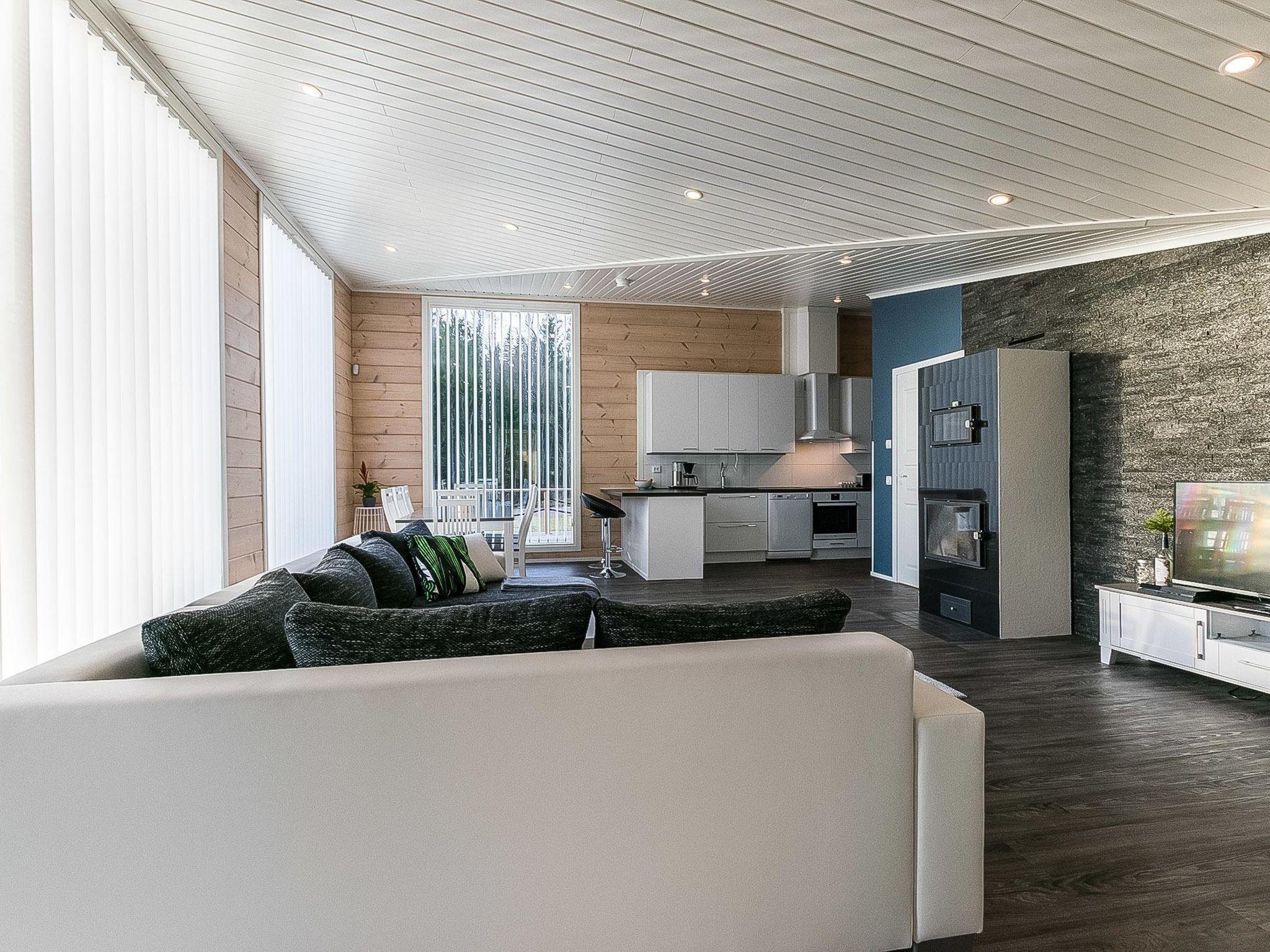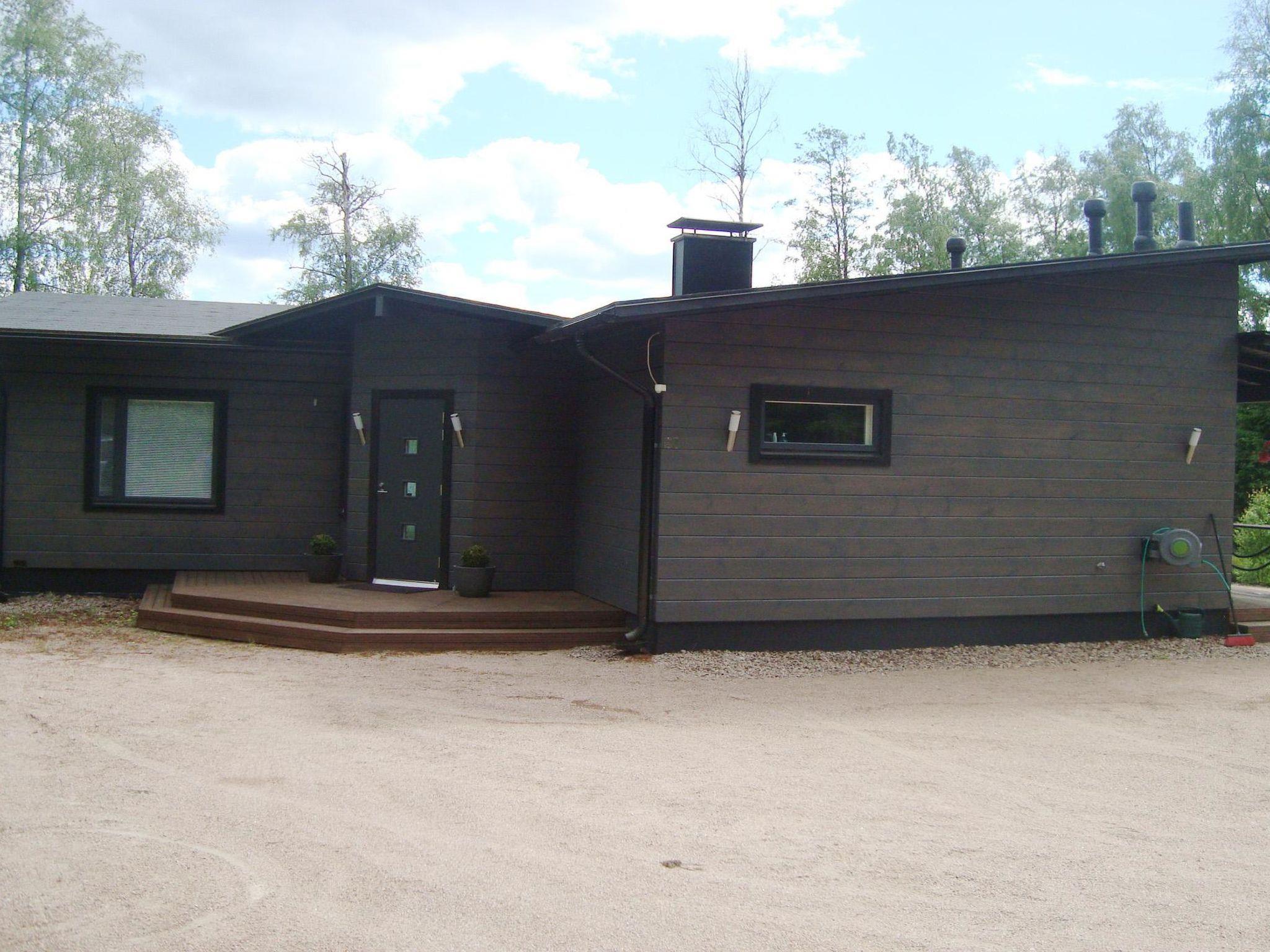Log cabin 2020, living room/kitchen, two bedrooms, one with double bed (160 x 200 cm Yankee bed), another with 2 80 x 200 cm beds, sofa which can be spread as spare bed (120 x 200 cm) in living room, WC, sauna (wood-fired sauna stove), washroom with two showers, hall, large open terrace with gas grill and garden furniture.