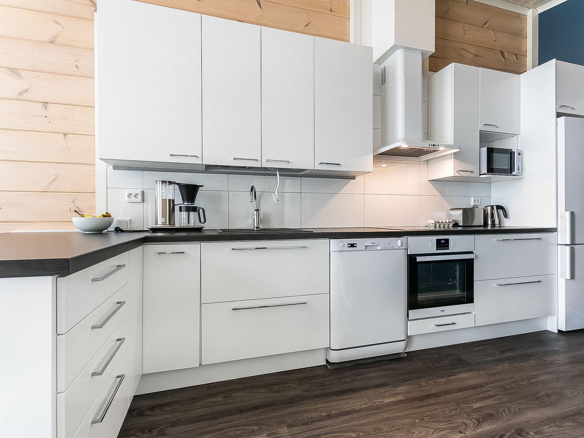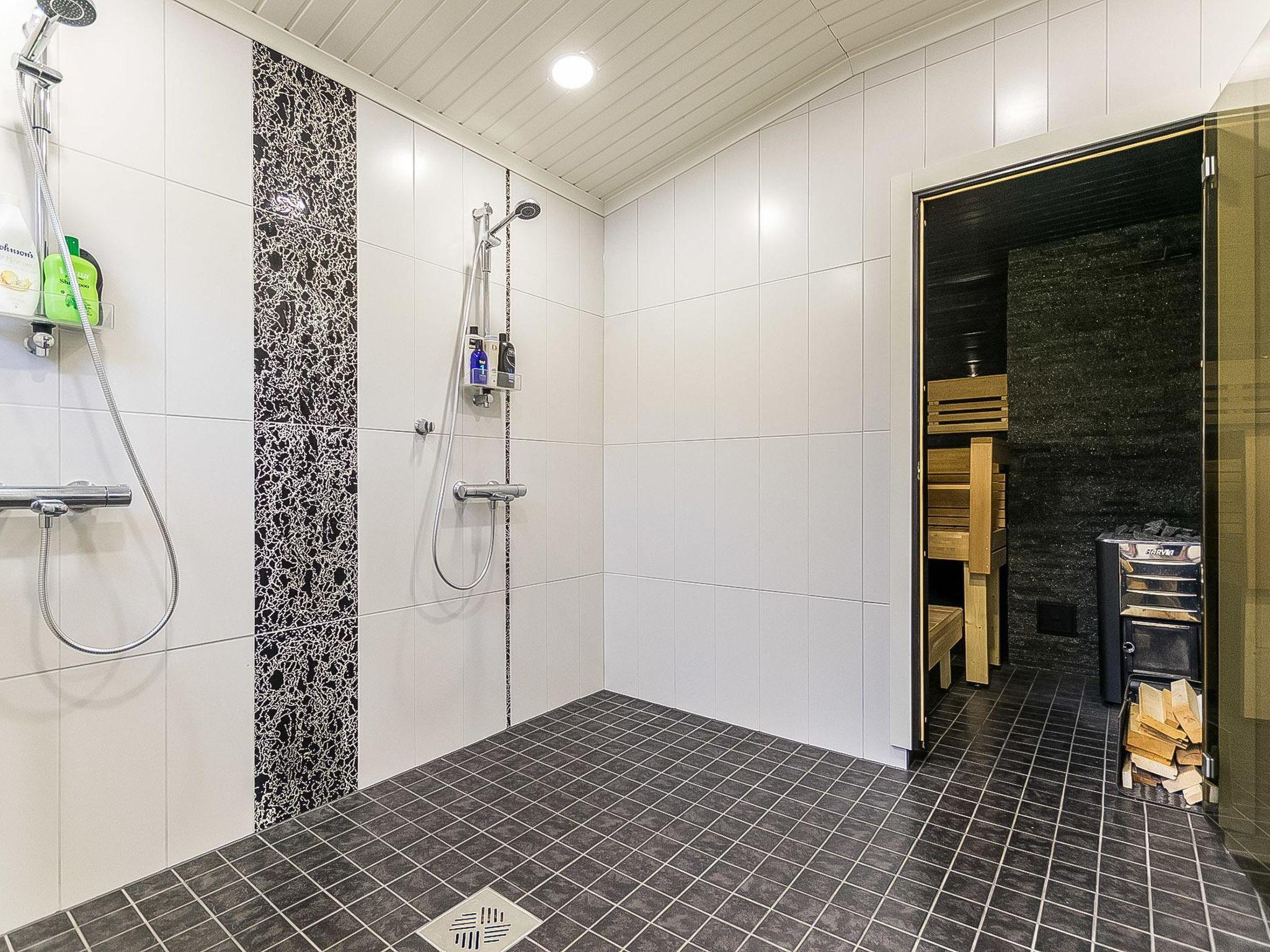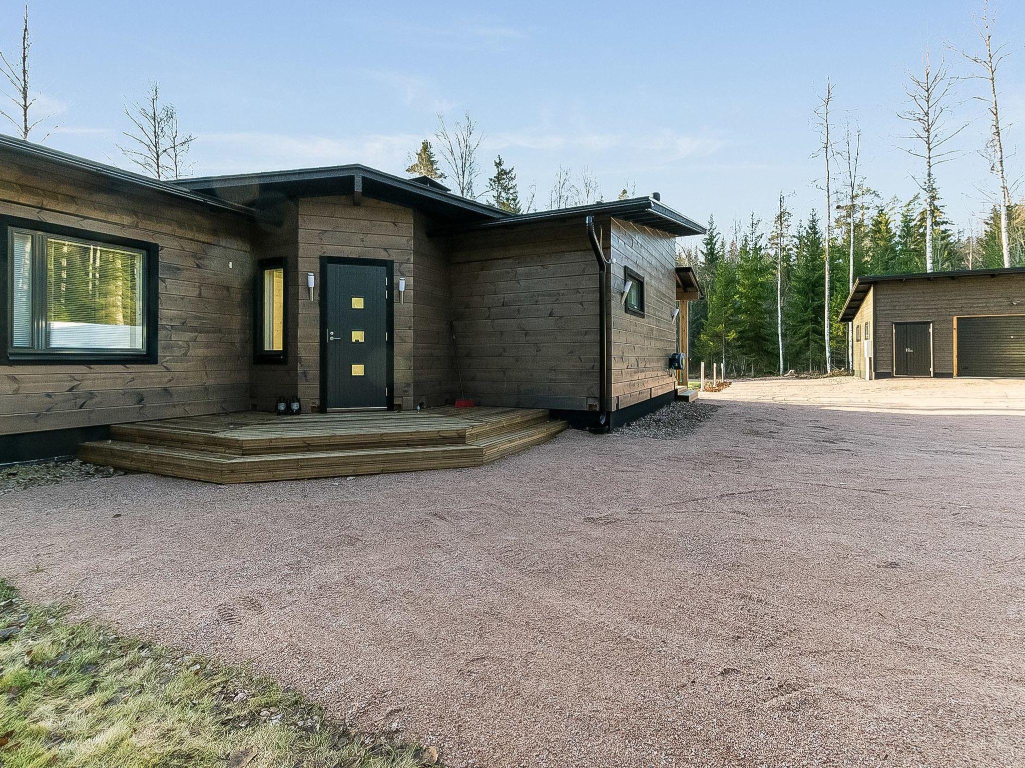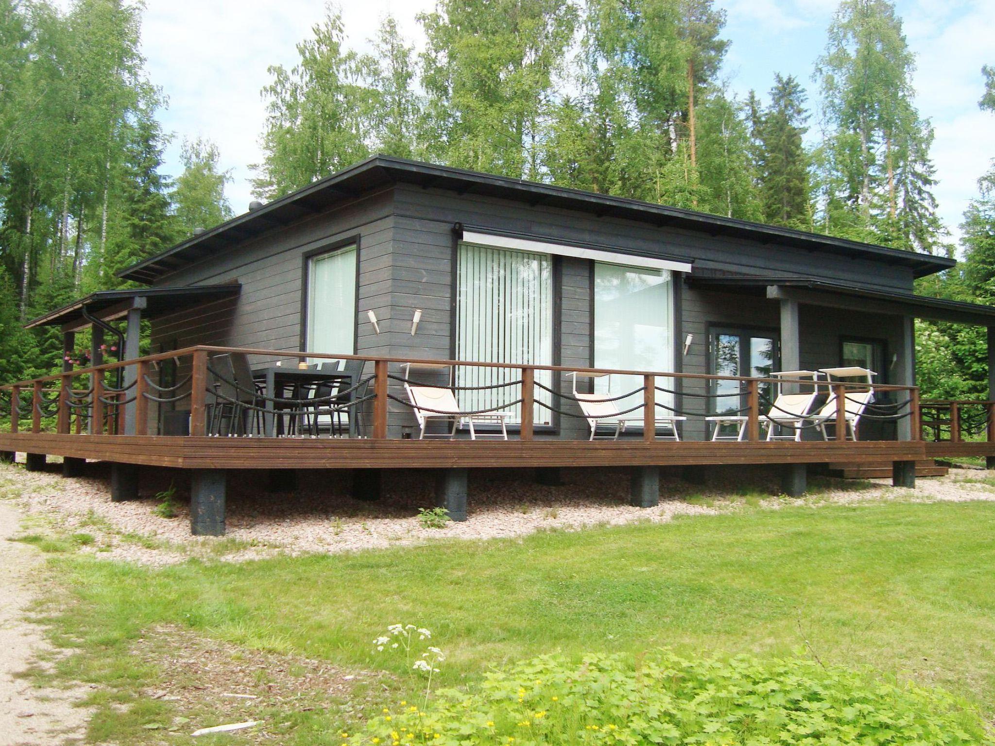 Log cabin 2020, living room/kitchen, two bedrooms, one with double bed (160 x 200 cm Yankee bed), another with 2 80 x 200 cm beds, sofa which can be spread as spare bed (120 x 200 cm) in living room, WC, sauna (wood-fired sauna stove), washroom with two showers, hall, large open terrace with gas grill and garden furniture.