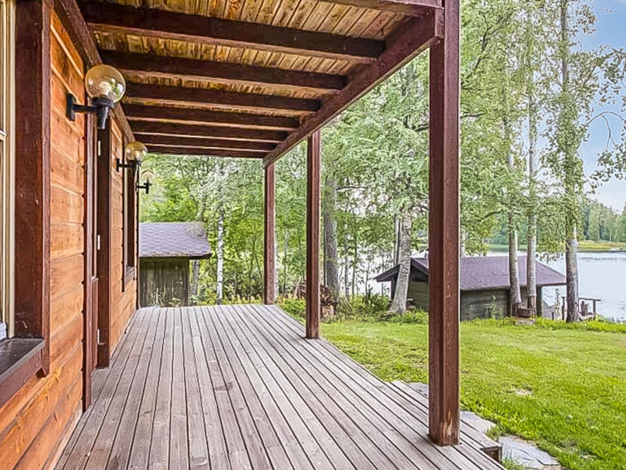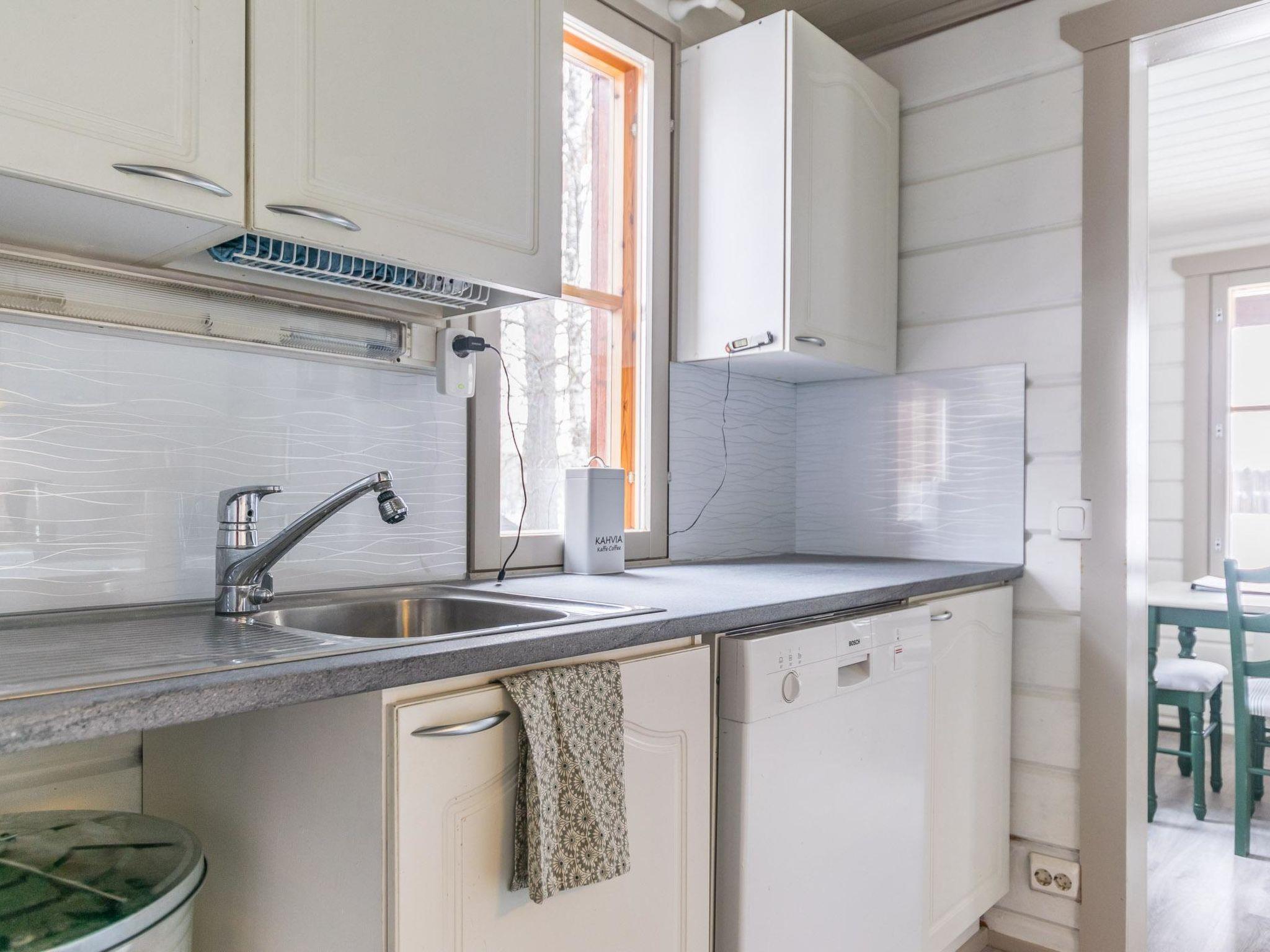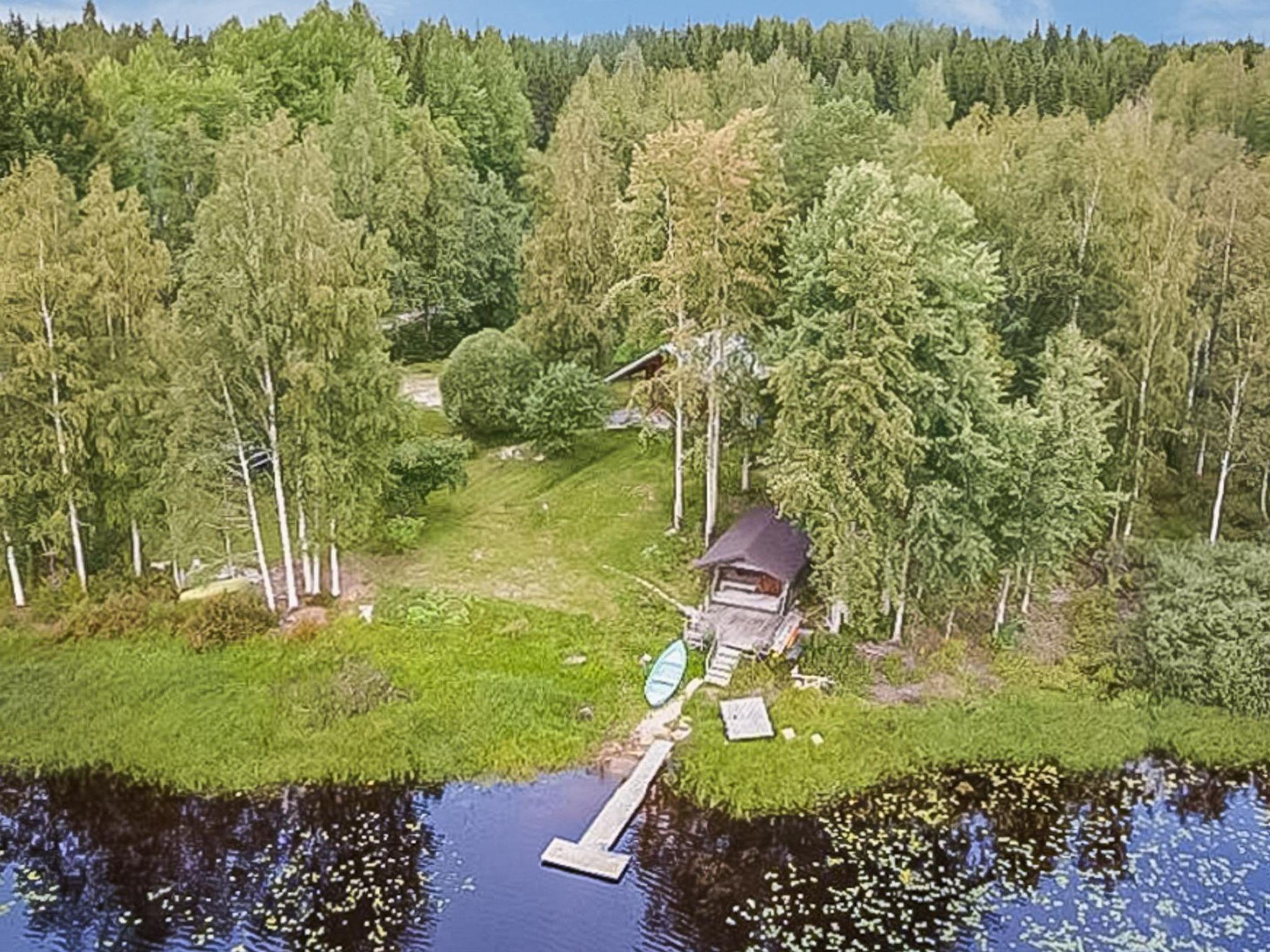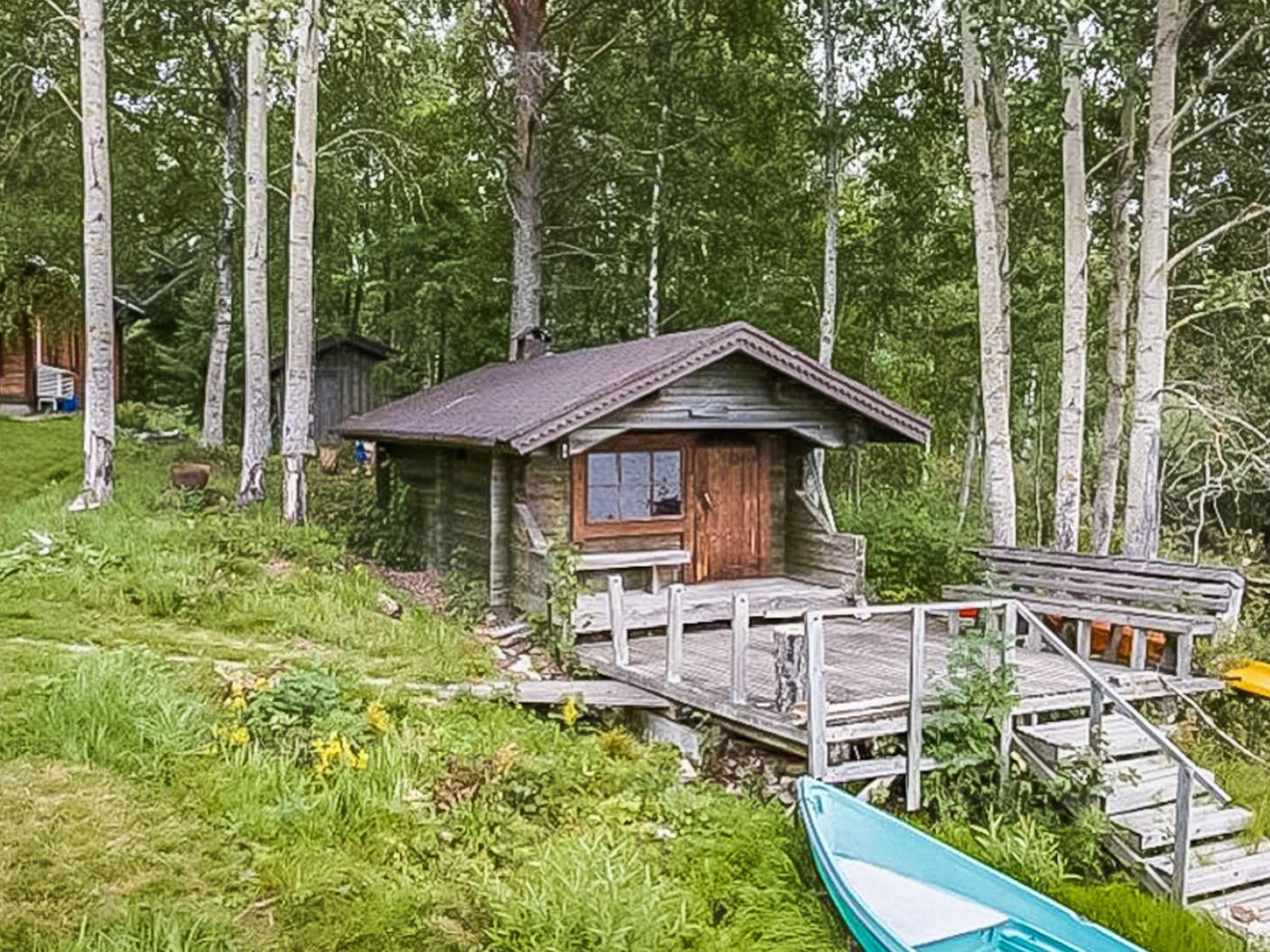 Log cabin, built in 1992, features an open living and dining area, as well as a kitchen with access to the bathroom and sauna. The bathroom includes a shower, while the sauna has an electric sauna stove. There's also a separate indoor WC. On the ground floor, there's a bedroom with a double bed, while on the upper floor, there's another double bed and two single beds.