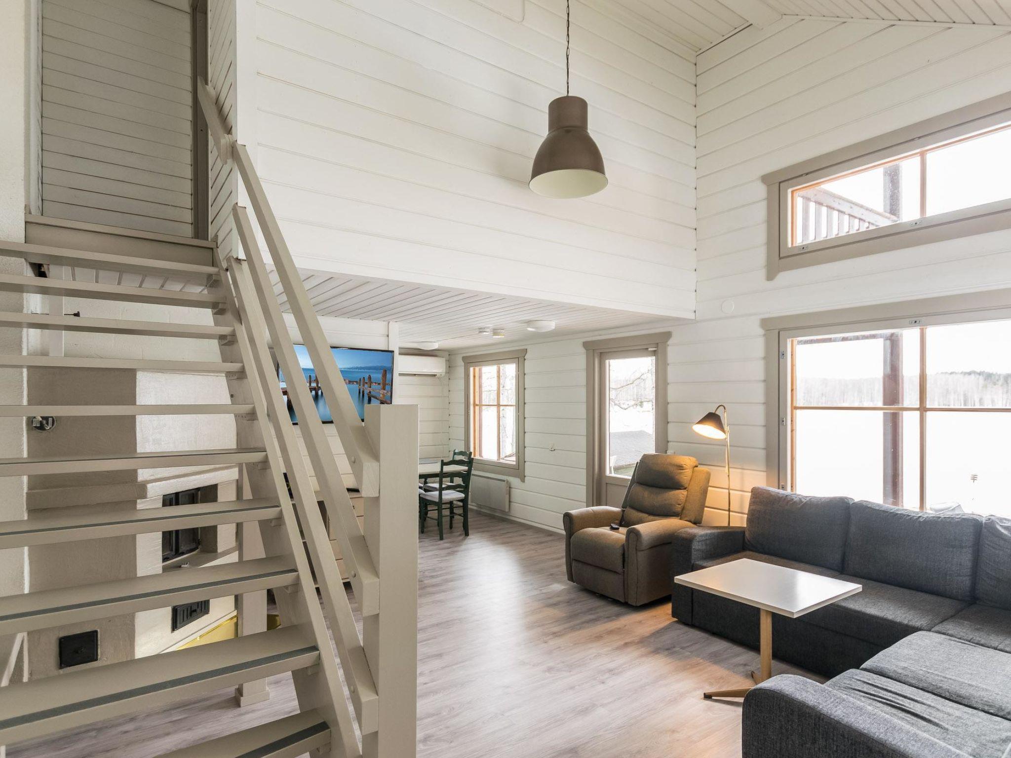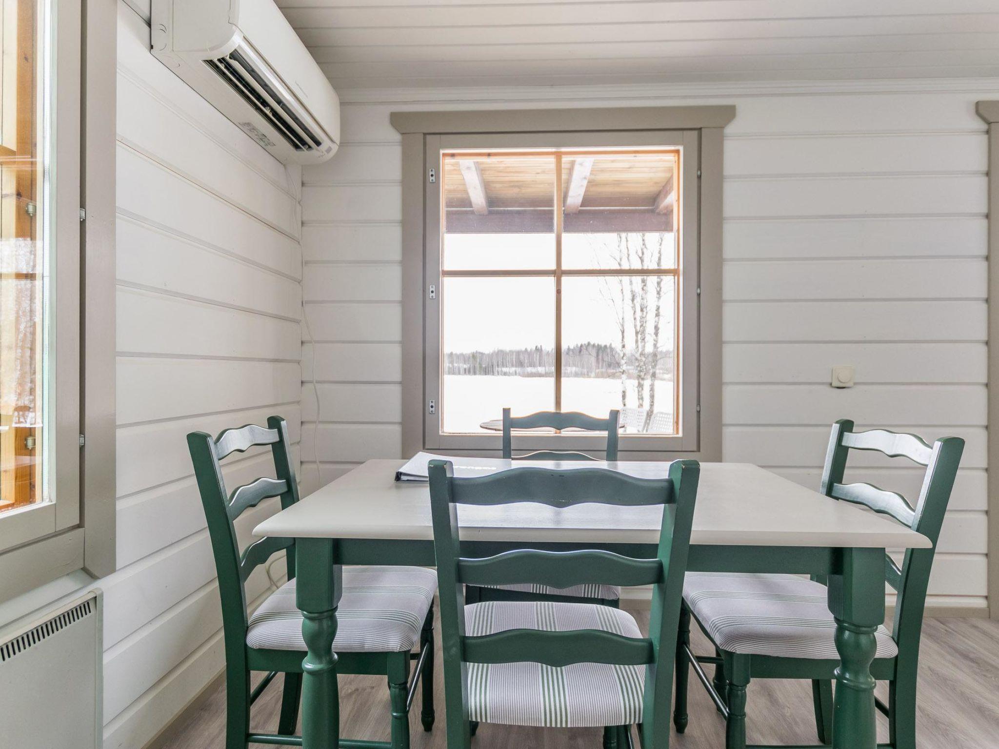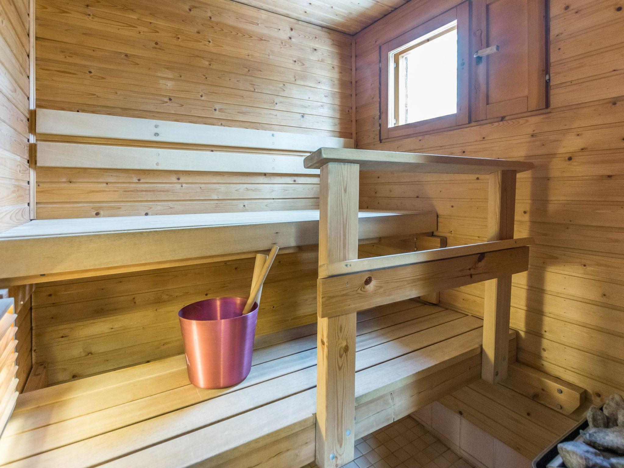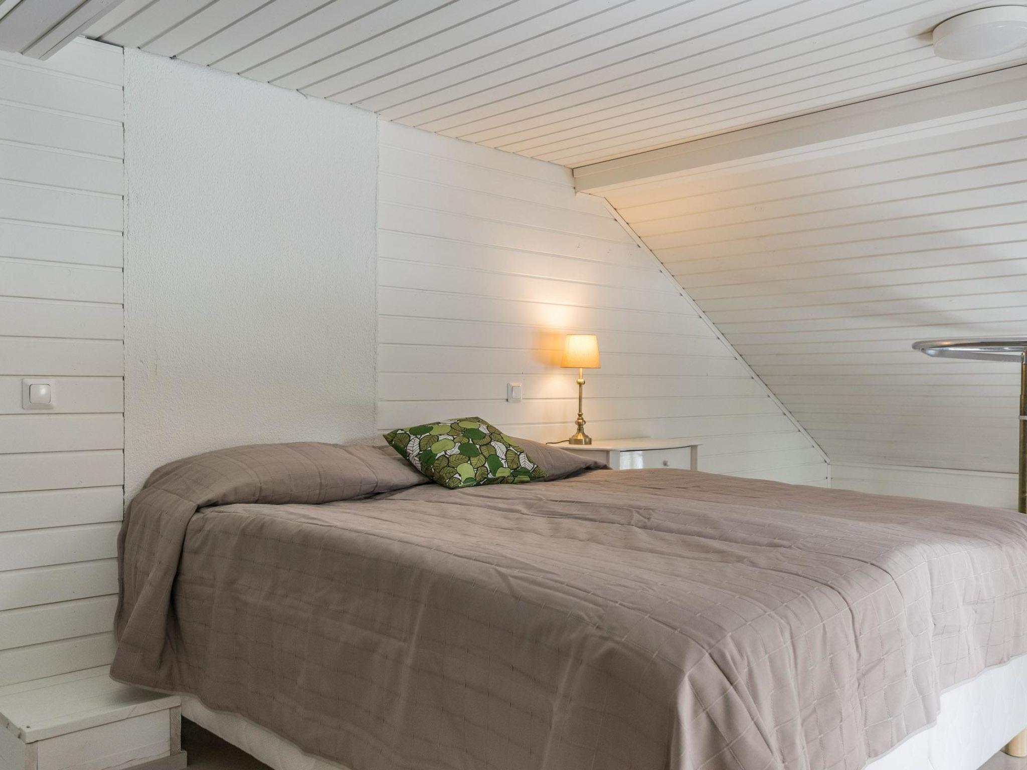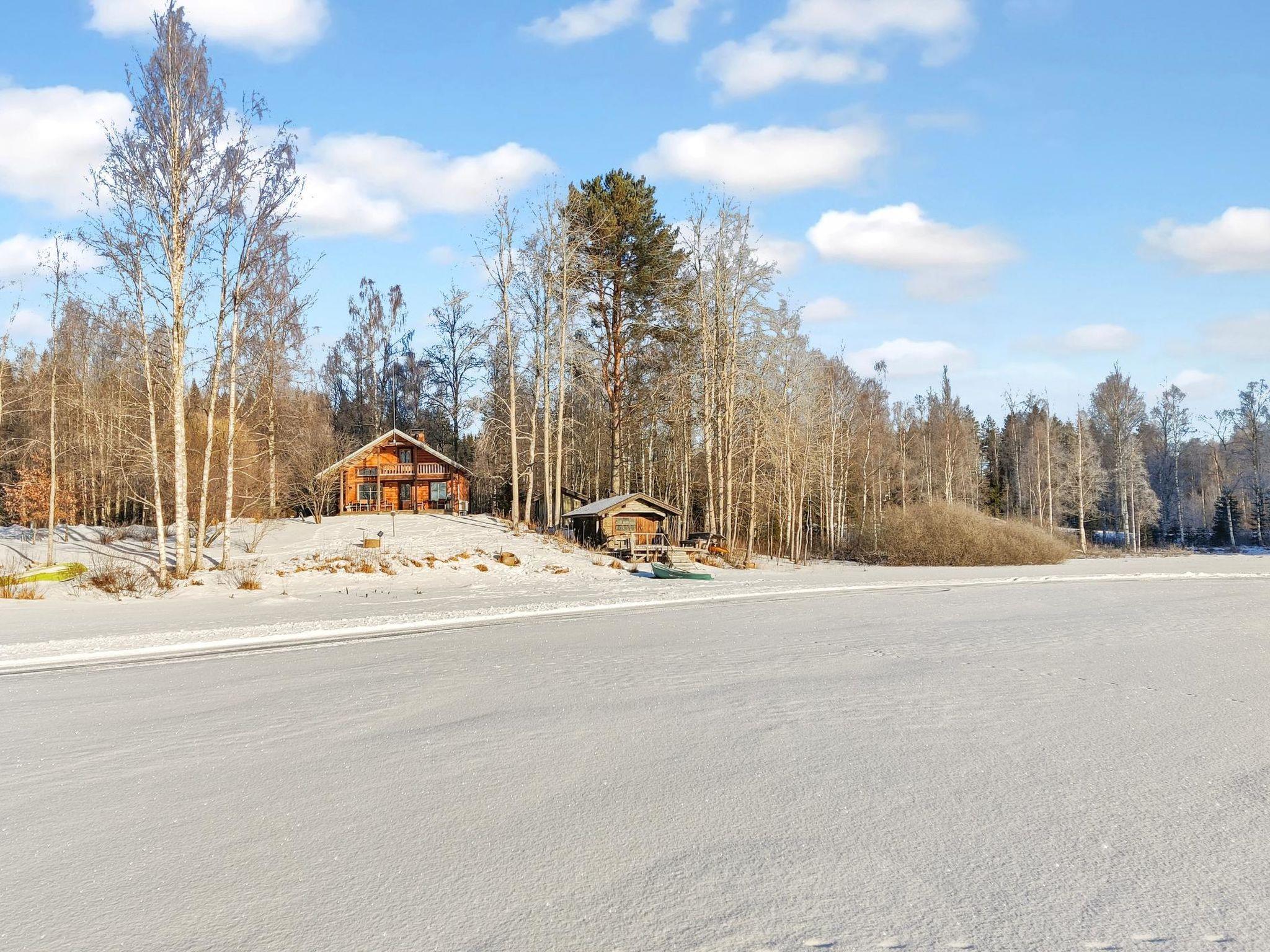 Log cabin, built in 1992, features an open living and dining area, as well as a kitchen with access to the bathroom and sauna. The bathroom includes a shower, while the sauna has an electric sauna stove. There's also a separate indoor WC. On the ground floor, there's a bedroom with a double bed, while on the upper floor, there's another double bed and two single beds.
