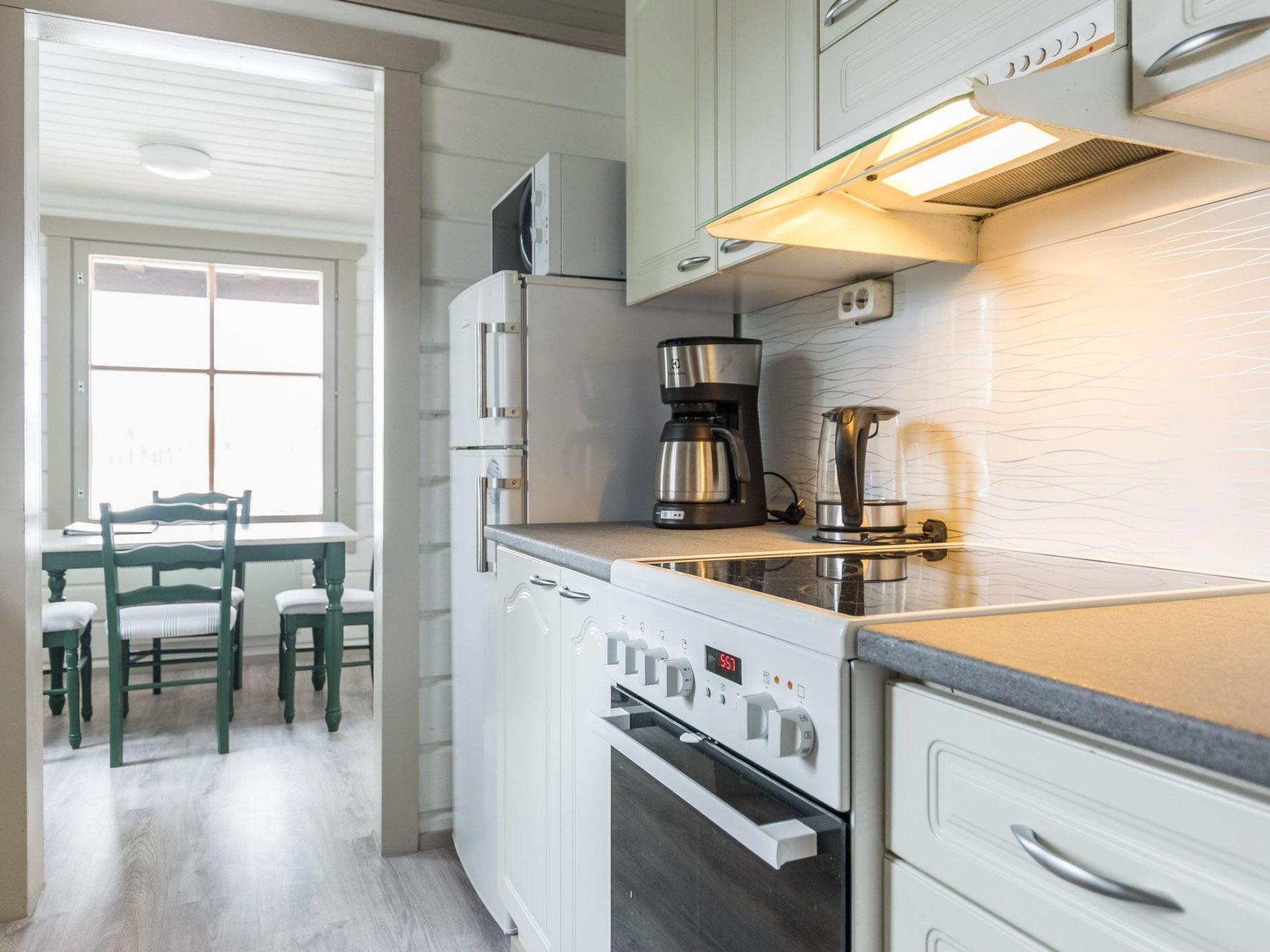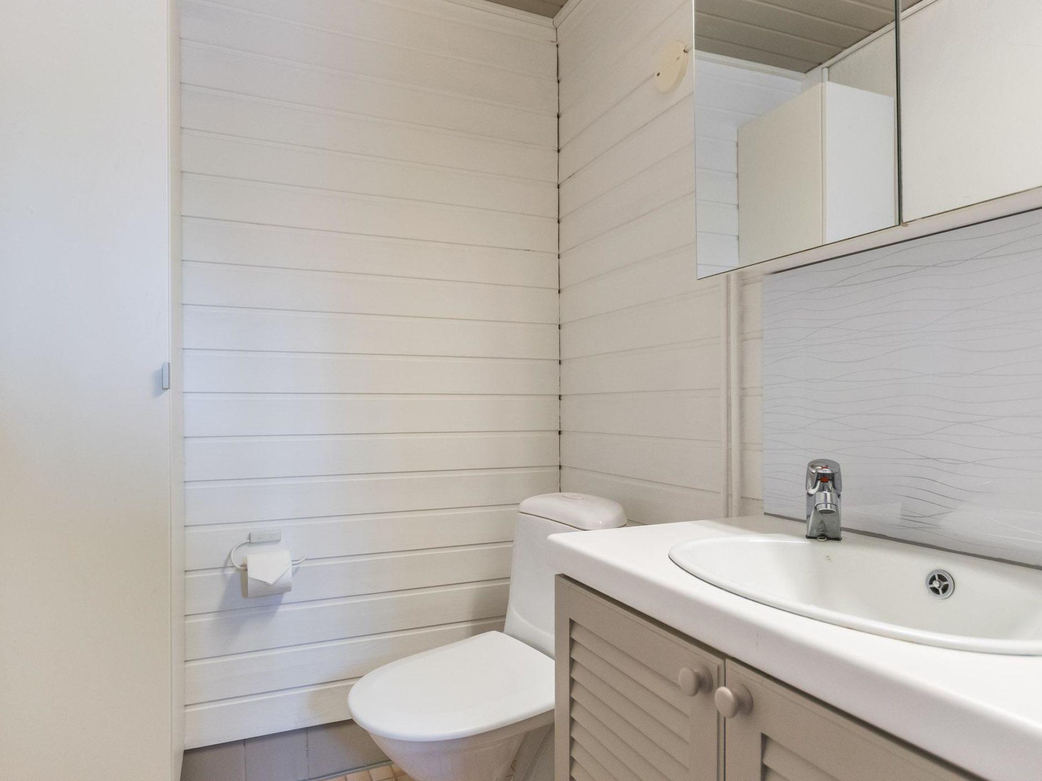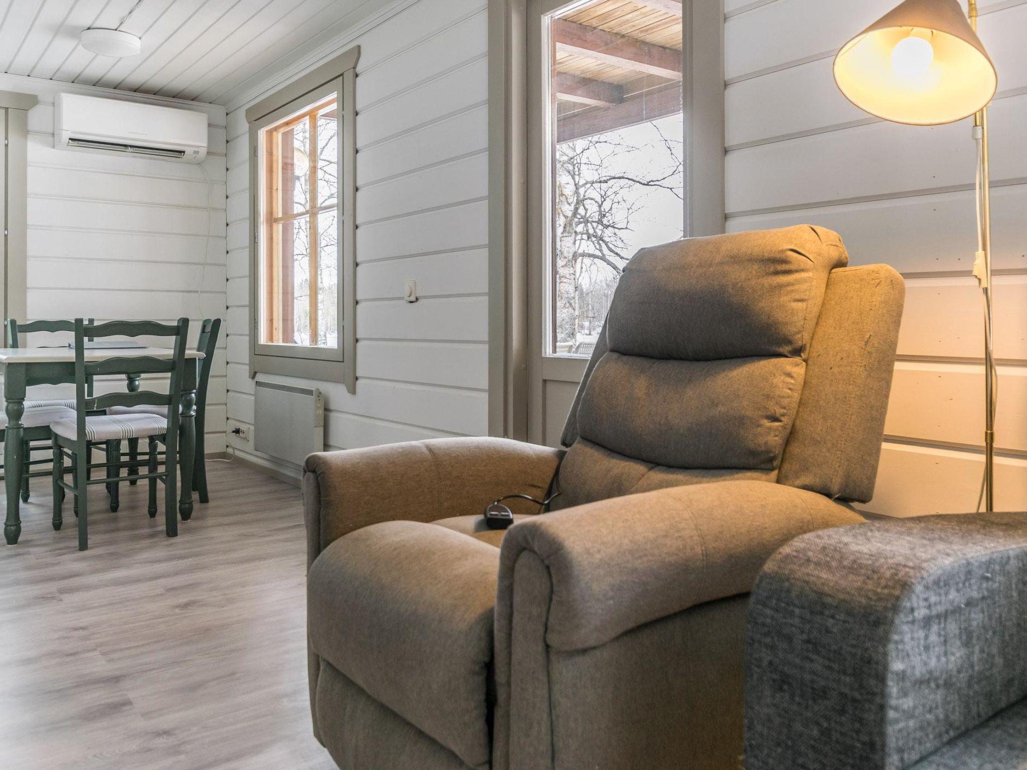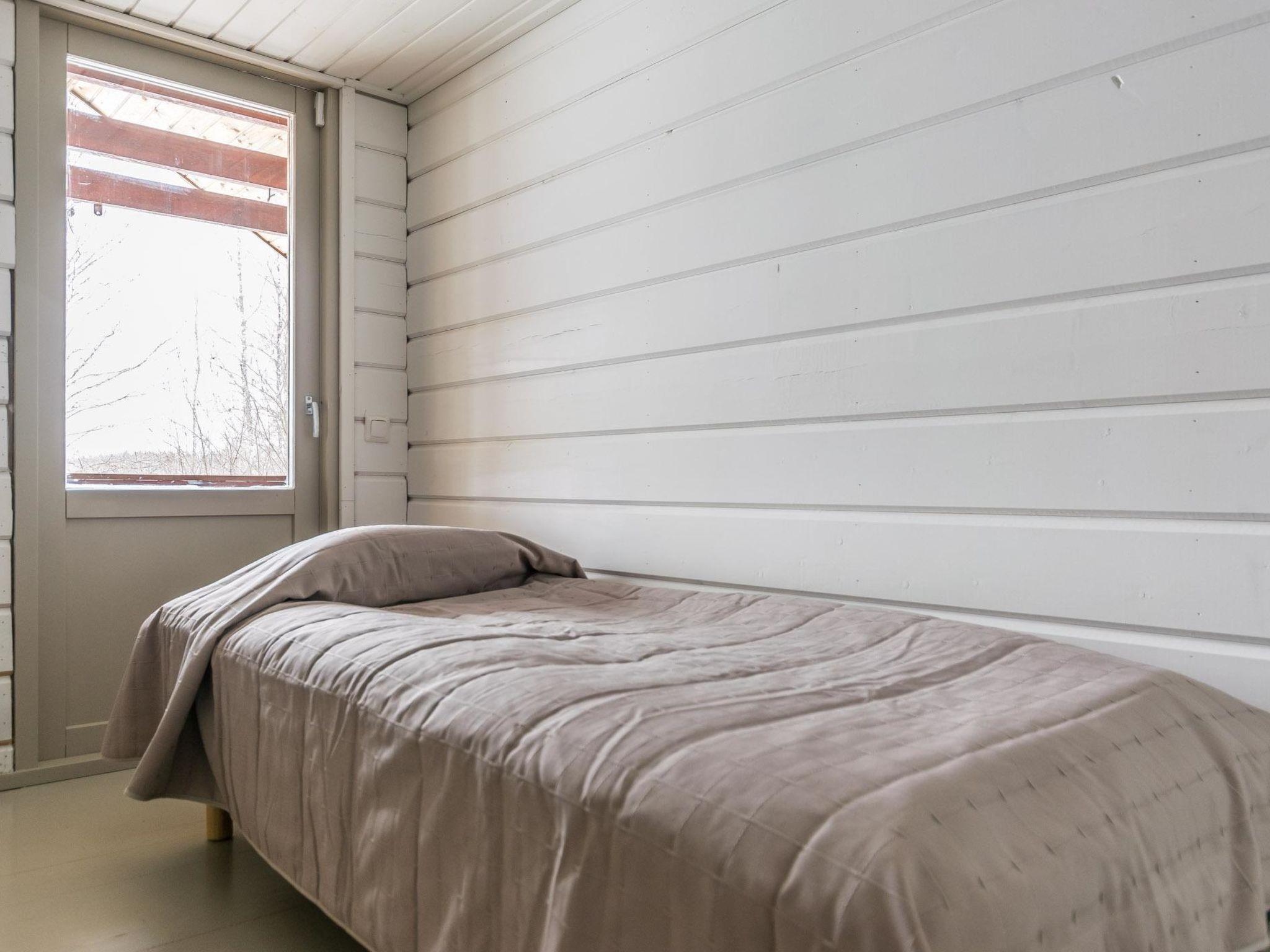 Log cabin, built in 1992, features an open living and dining area, as well as a kitchen with access to the bathroom and sauna. The bathroom includes a shower, while the sauna has an electric sauna stove. There's also a separate indoor WC. On the ground floor, there's a bedroom with a double bed, while on the upper floor, there's another double bed and two single beds.