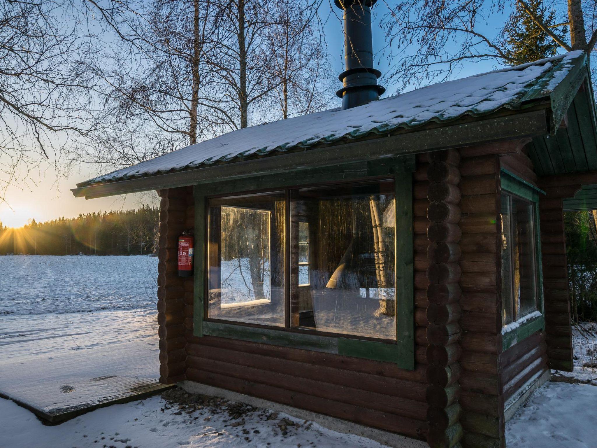 A log cabin in Ruovesi right by Lake Mäkelänjärvi. The yard features a glazed cooking hut, providing a cozy spot to relax while enjoying the glow of the fire. The cabin is situated in a peaceful setting with a beautiful view of the lake opening up from the yard.