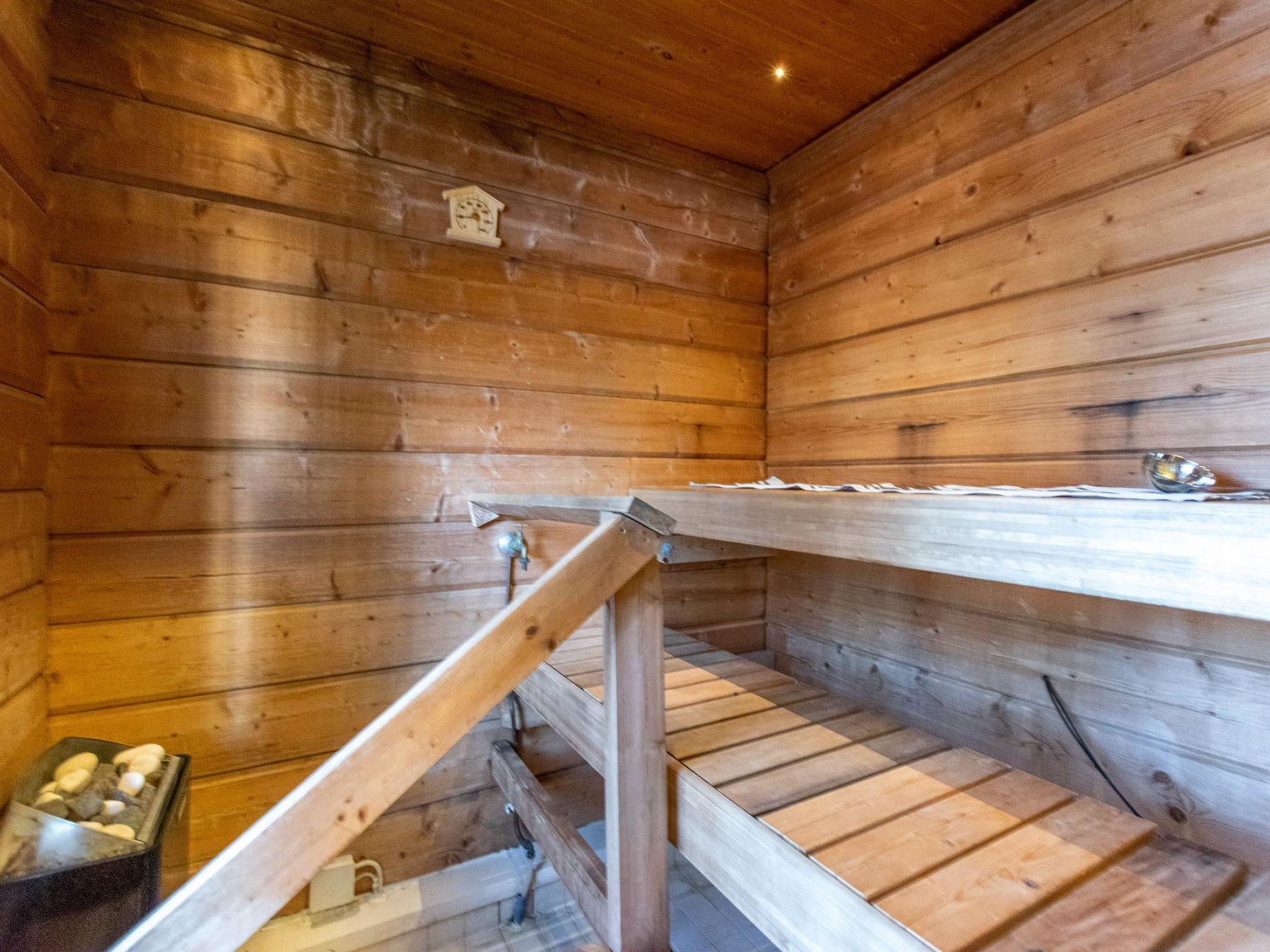 The villa also includes a separate WC, sauna (electric sauna stove), washroom with two showers, and combined dressing/utility room with access to a terrace. At the other end of the villa, a separate glazed terrace leads to a larger outdoor terrace.