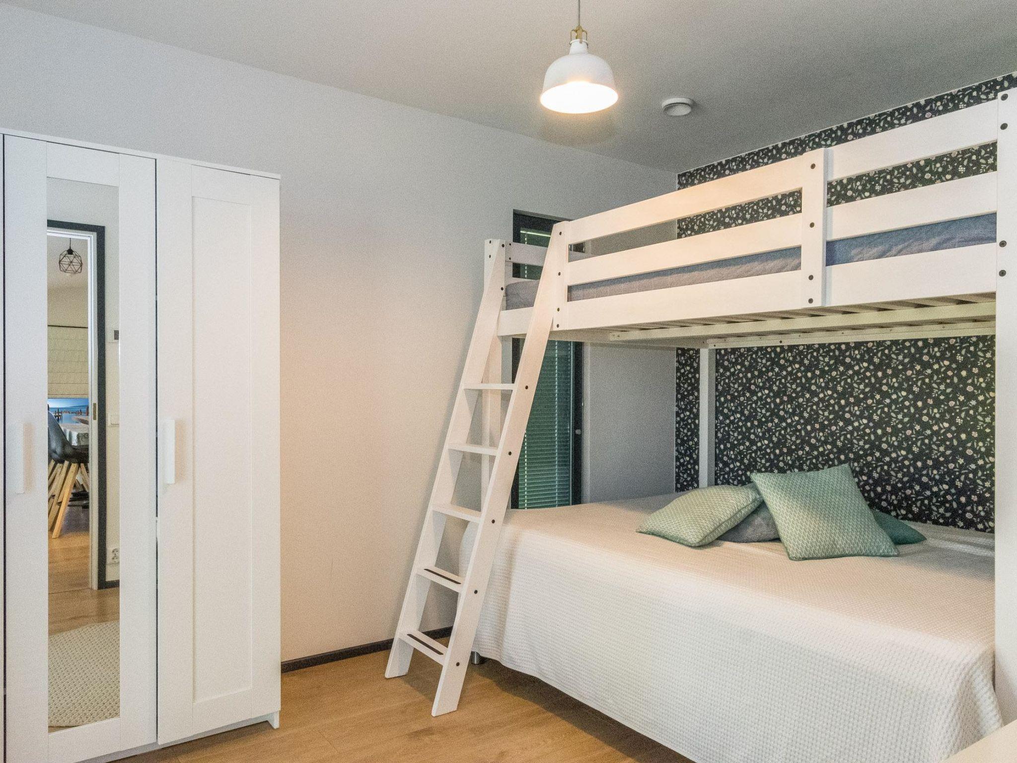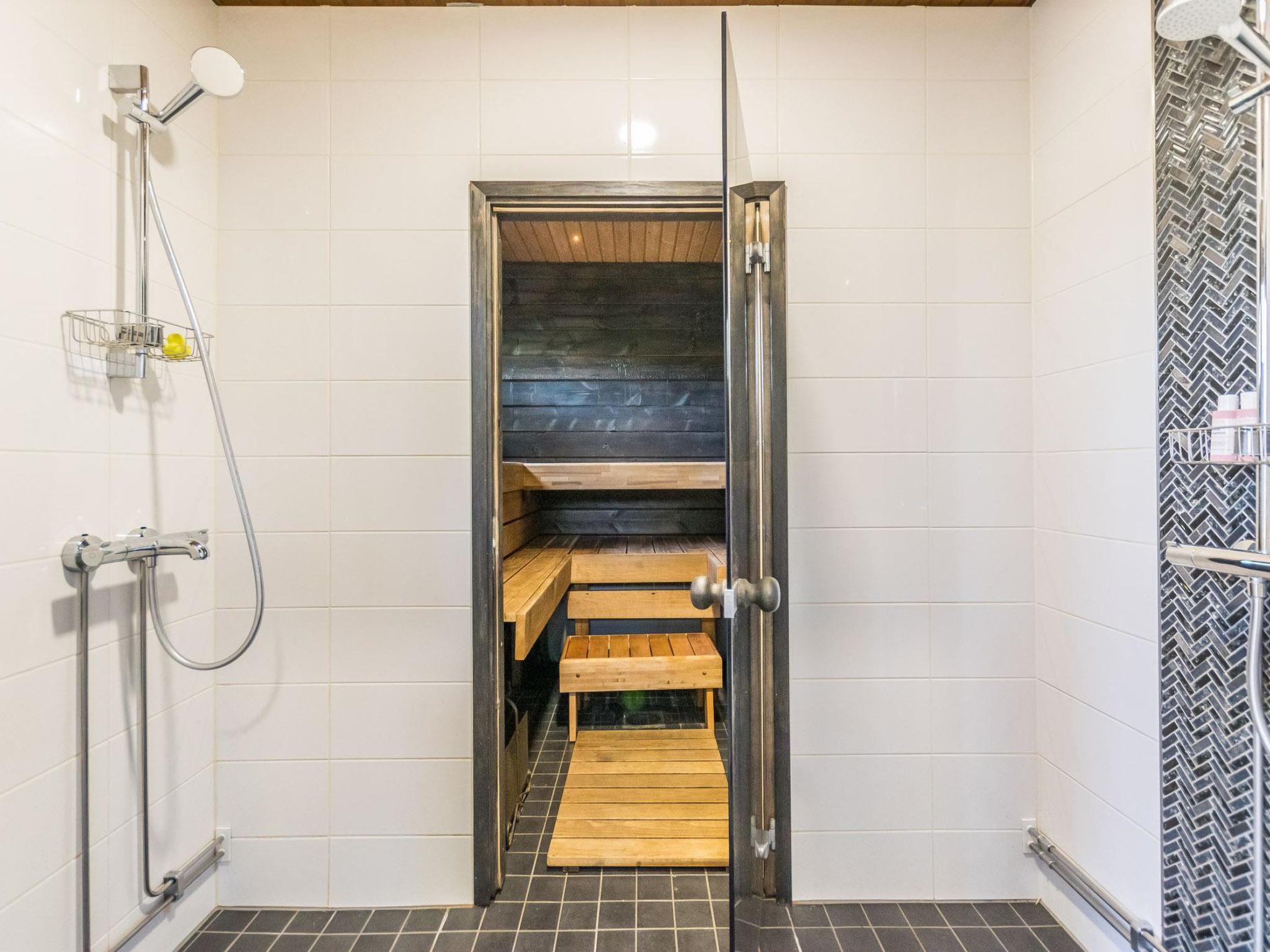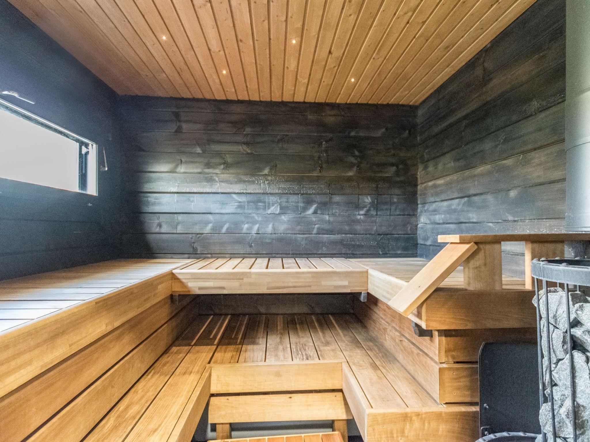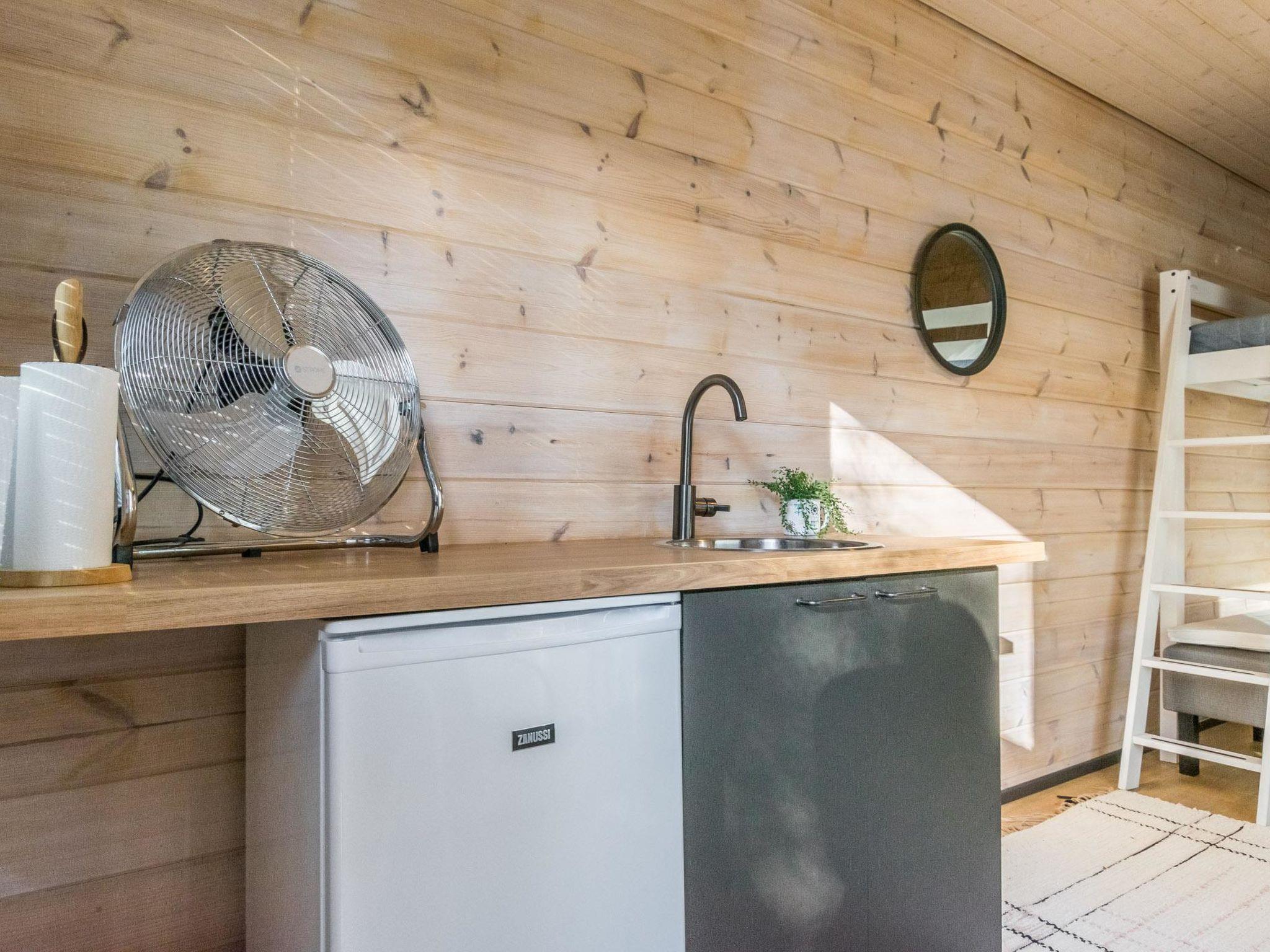 The lakeside sauna has a separate room with its own water point and refrigerator. In the room, there is a bunk bed. The lower bed is 160 x 200 cm and the upper bed is 140 x 200 cm. The sauna has a wood-burning sauna stove, and from the sauna window, there is a view of the beach. The terrace is equipped with outdoor furniture and a wood-heated hot tub available for an extra fee.
