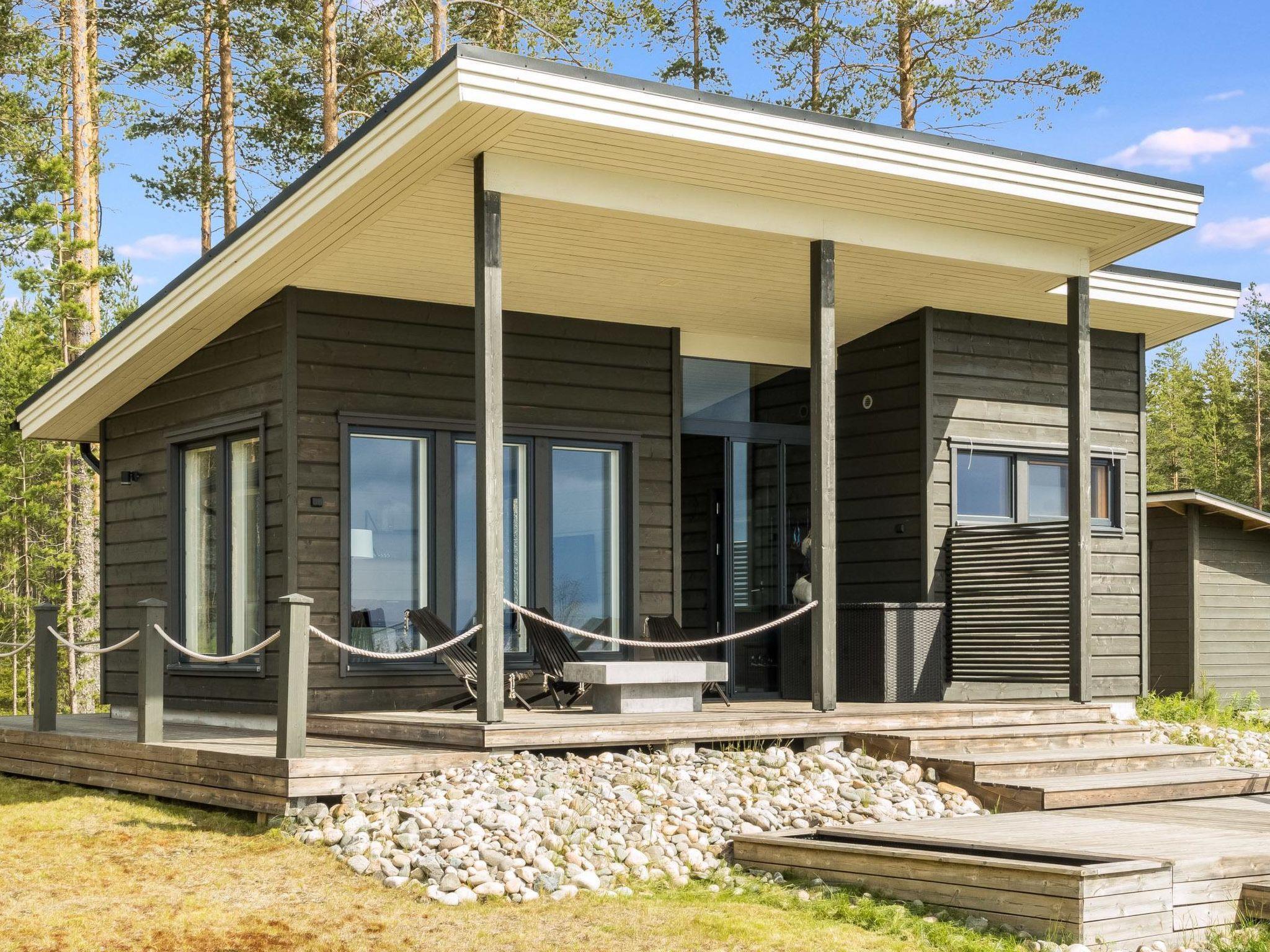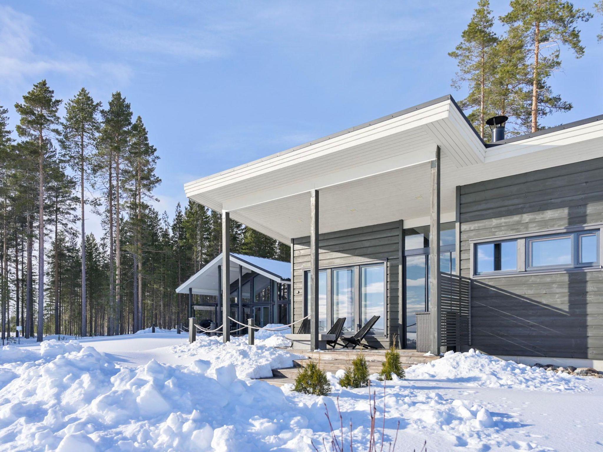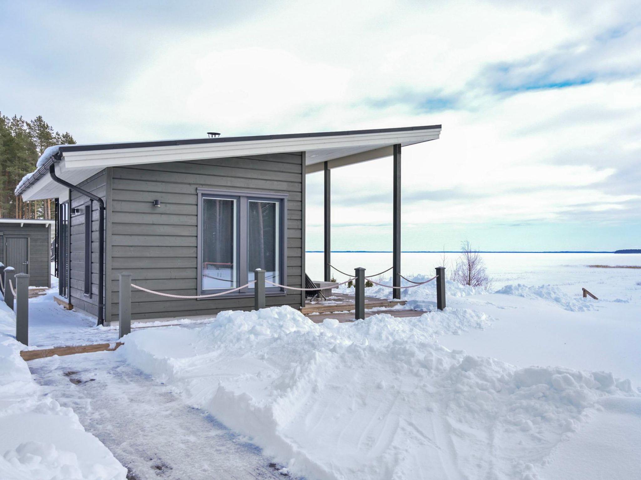 Modern villa and lakeside sauna on a bright and sunny beach in Säräisniemi area by the lake Oulujärvi. Flat lawn yard and sand beach.