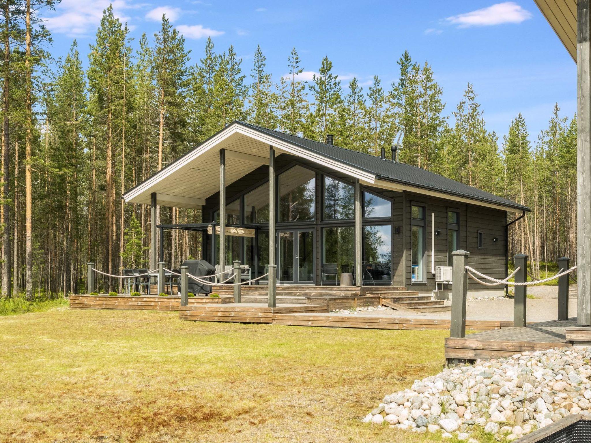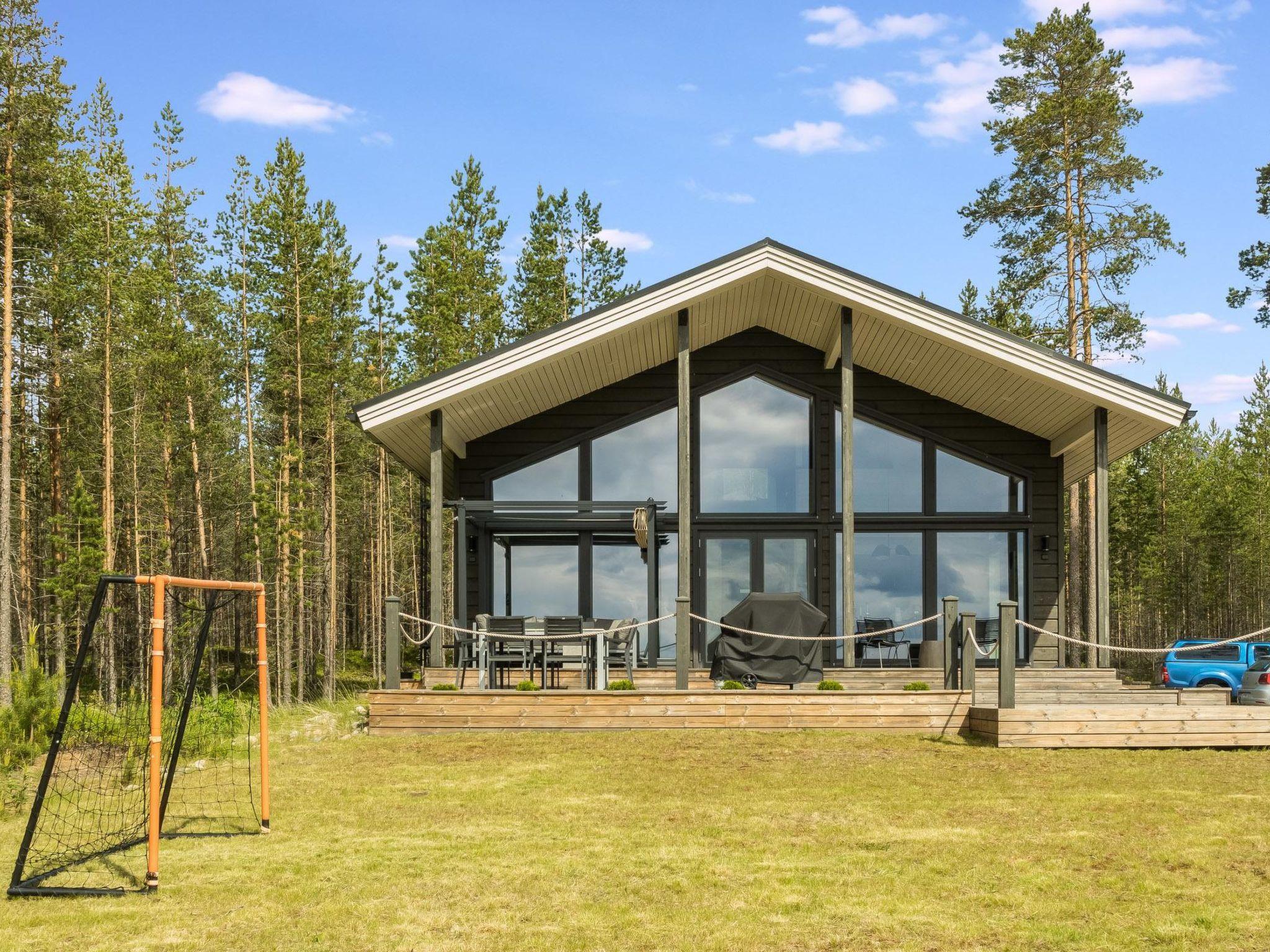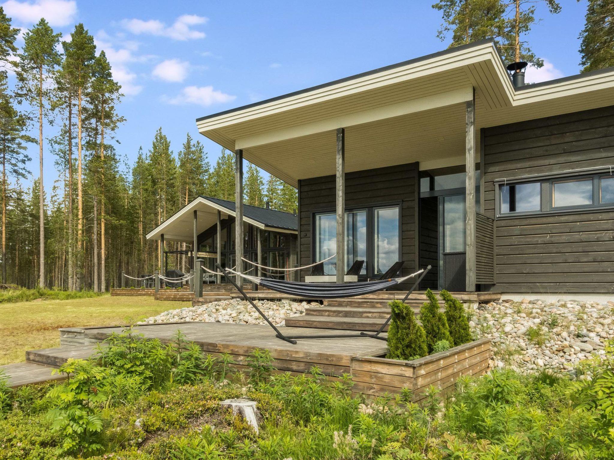 Modern villa and lakeside sauna on a bright and sunny beach in Säräisniemi area by the lake Oulujärvi. Flat lawn yard and sand beach.