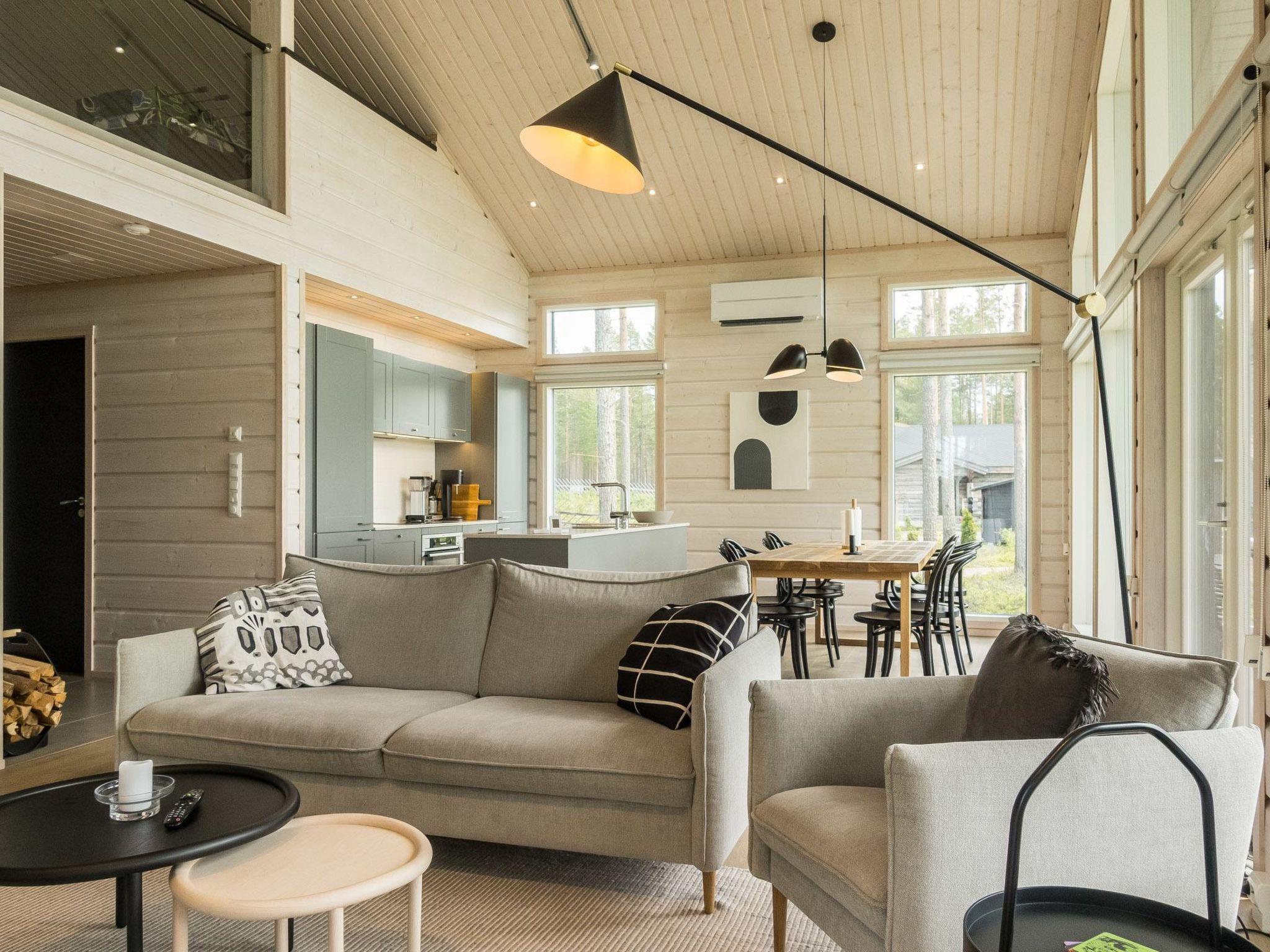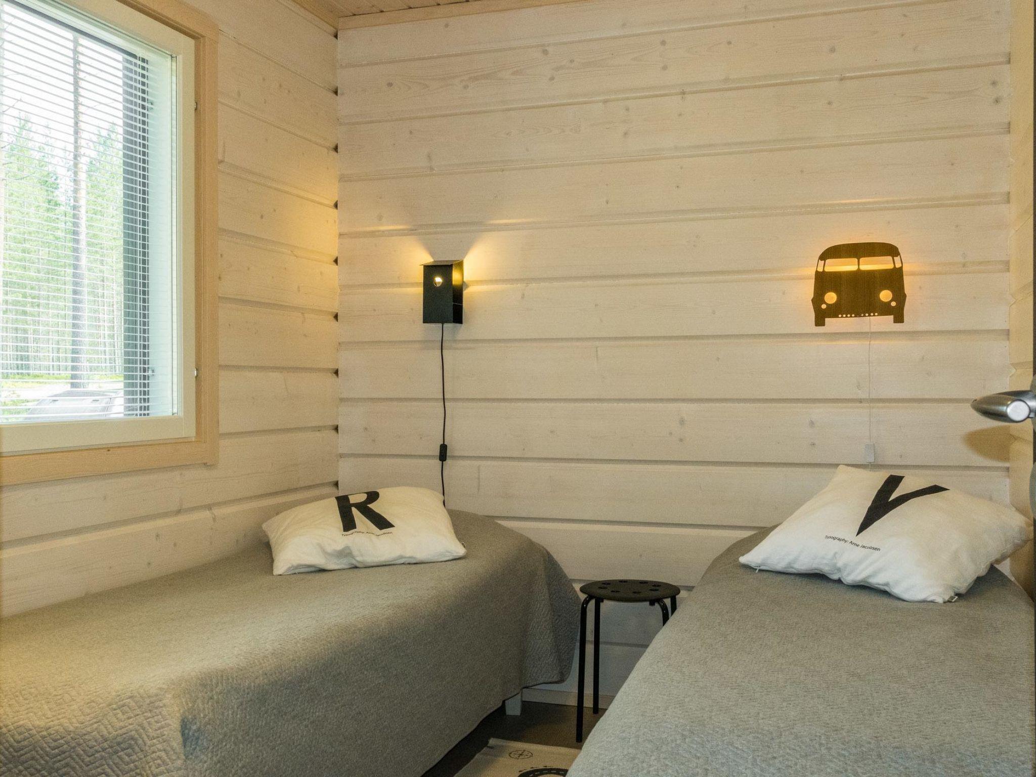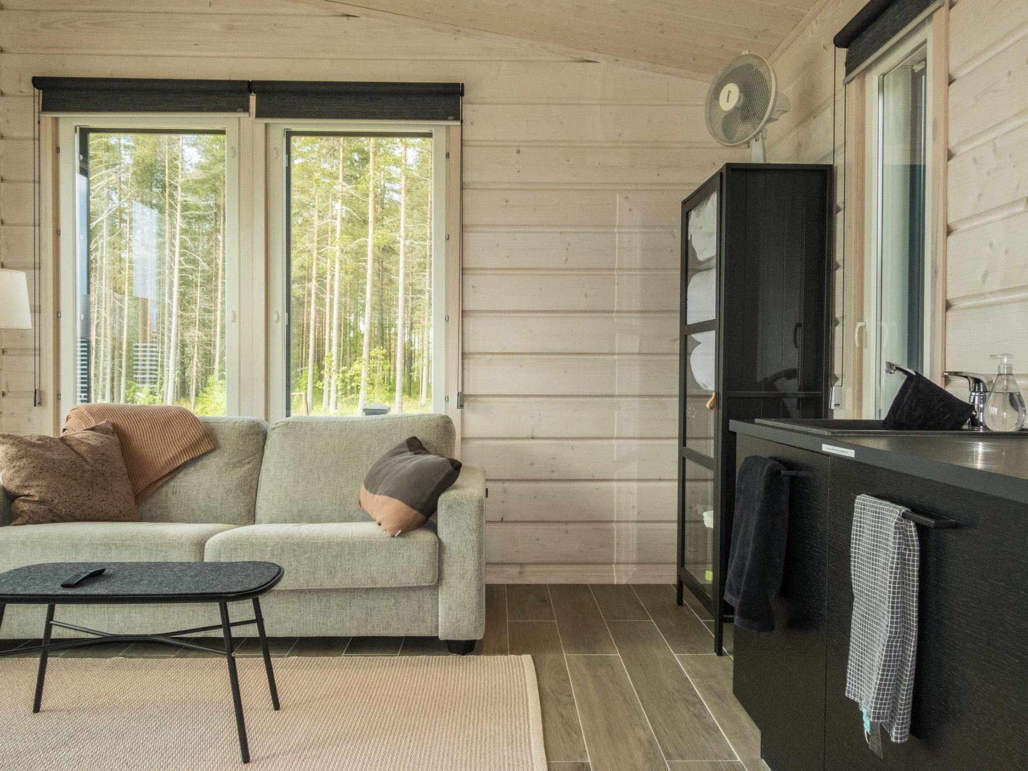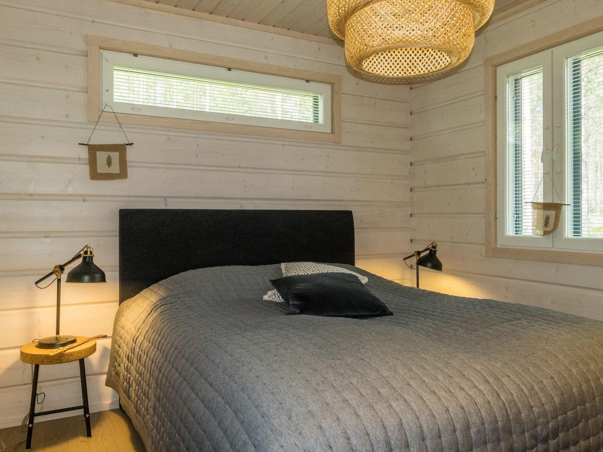 Log-paneled cabin, built in 2016. Living room/kitchen, double bed in the bedroom (width 180 cm), 2 separate beds in second bedroom, 2 beds in the loft, sofa bed and 2 separate mattresses. The loft beds have both a common mattress pad and separate mattress pads. The cabin also has washroom/WC and partially covered terrace.