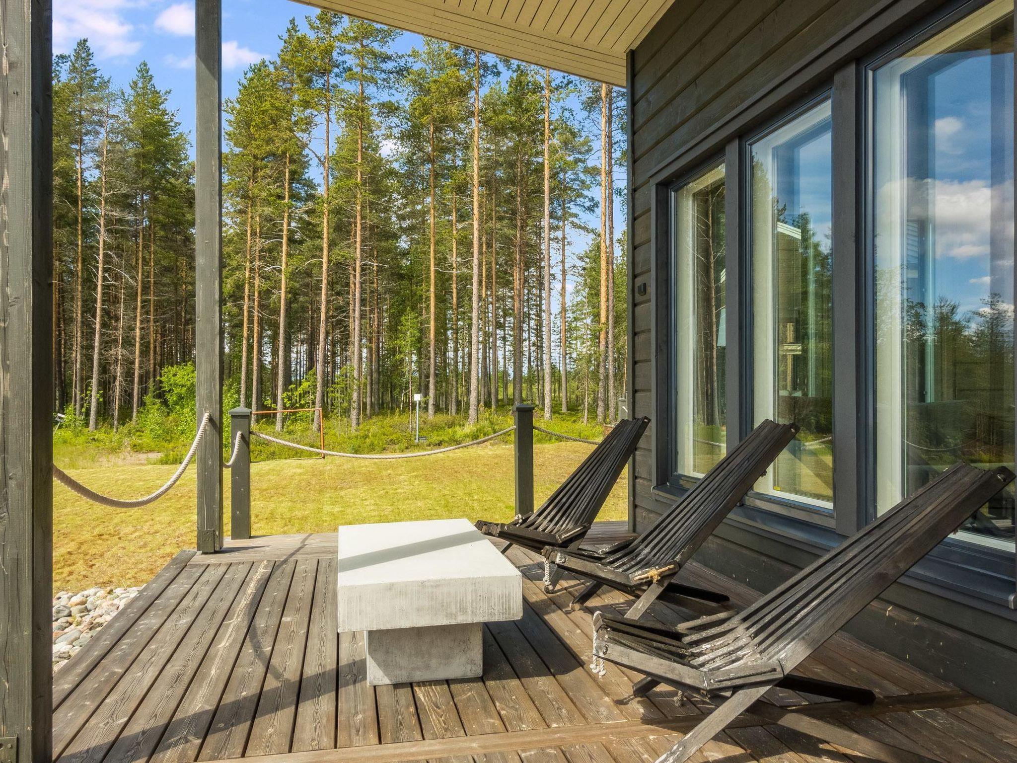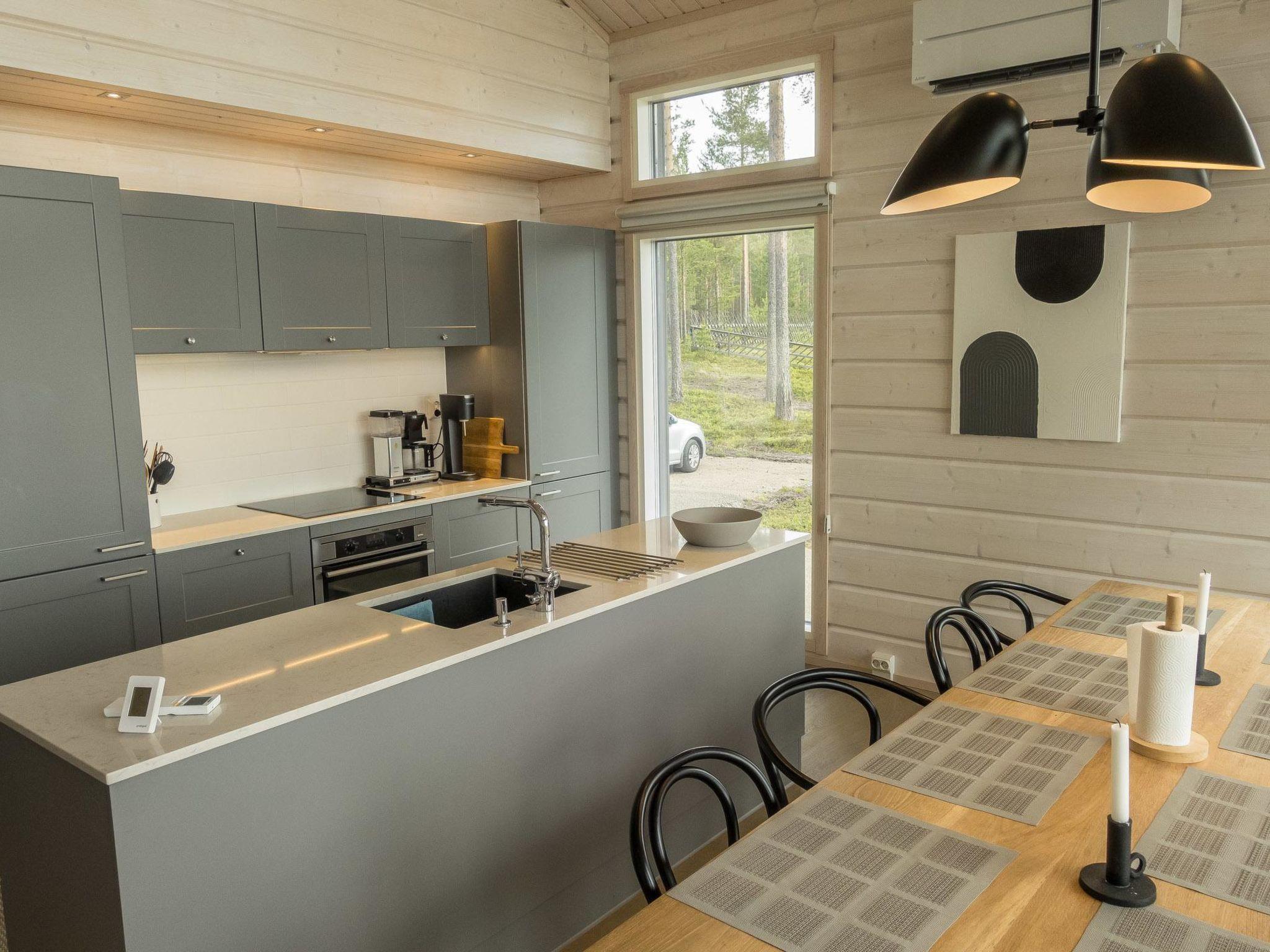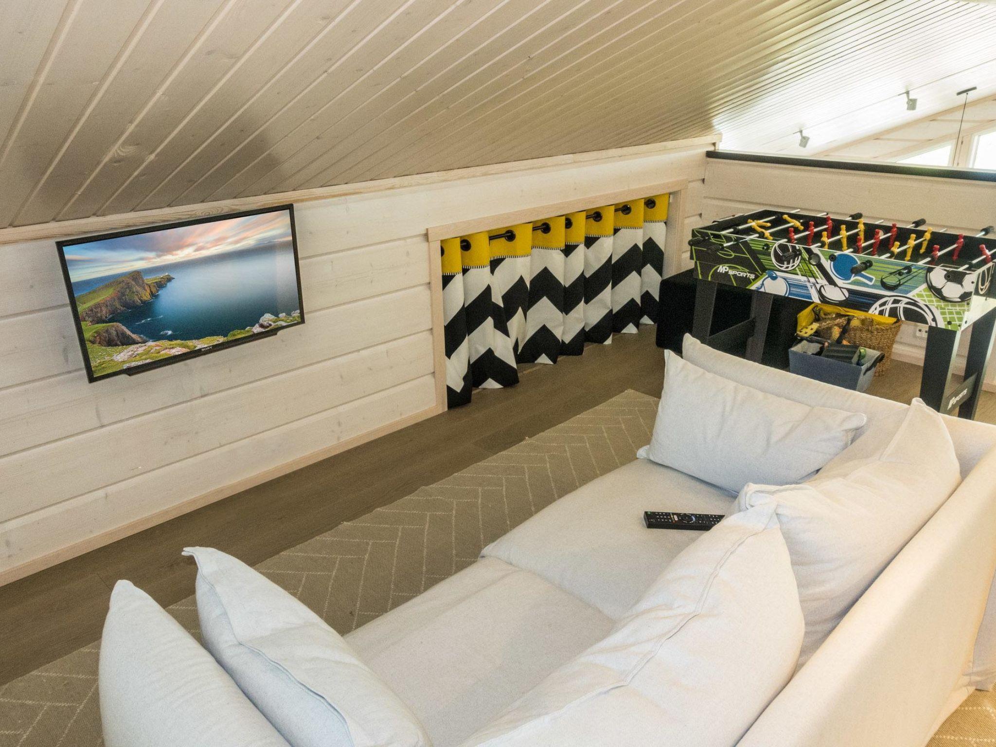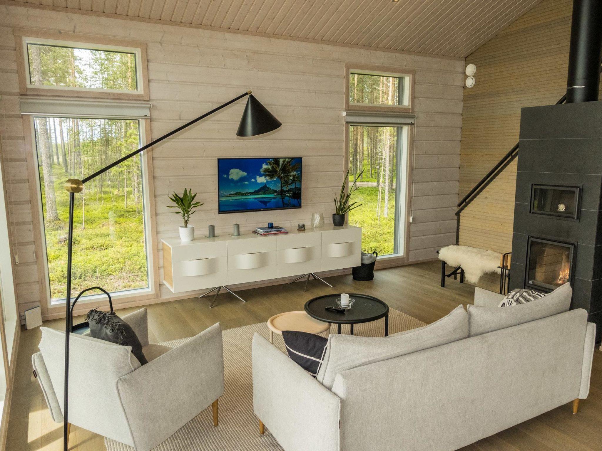 Log-paneled cabin, built in 2016. Living room/kitchen, double bed in the bedroom (width 180 cm), 2 separate beds in second bedroom, 2 beds in the loft, sofa bed and 2 separate mattresses. The loft beds have both a common mattress pad and separate mattress pads. The cabin also has washroom/WC and partially covered terrace.