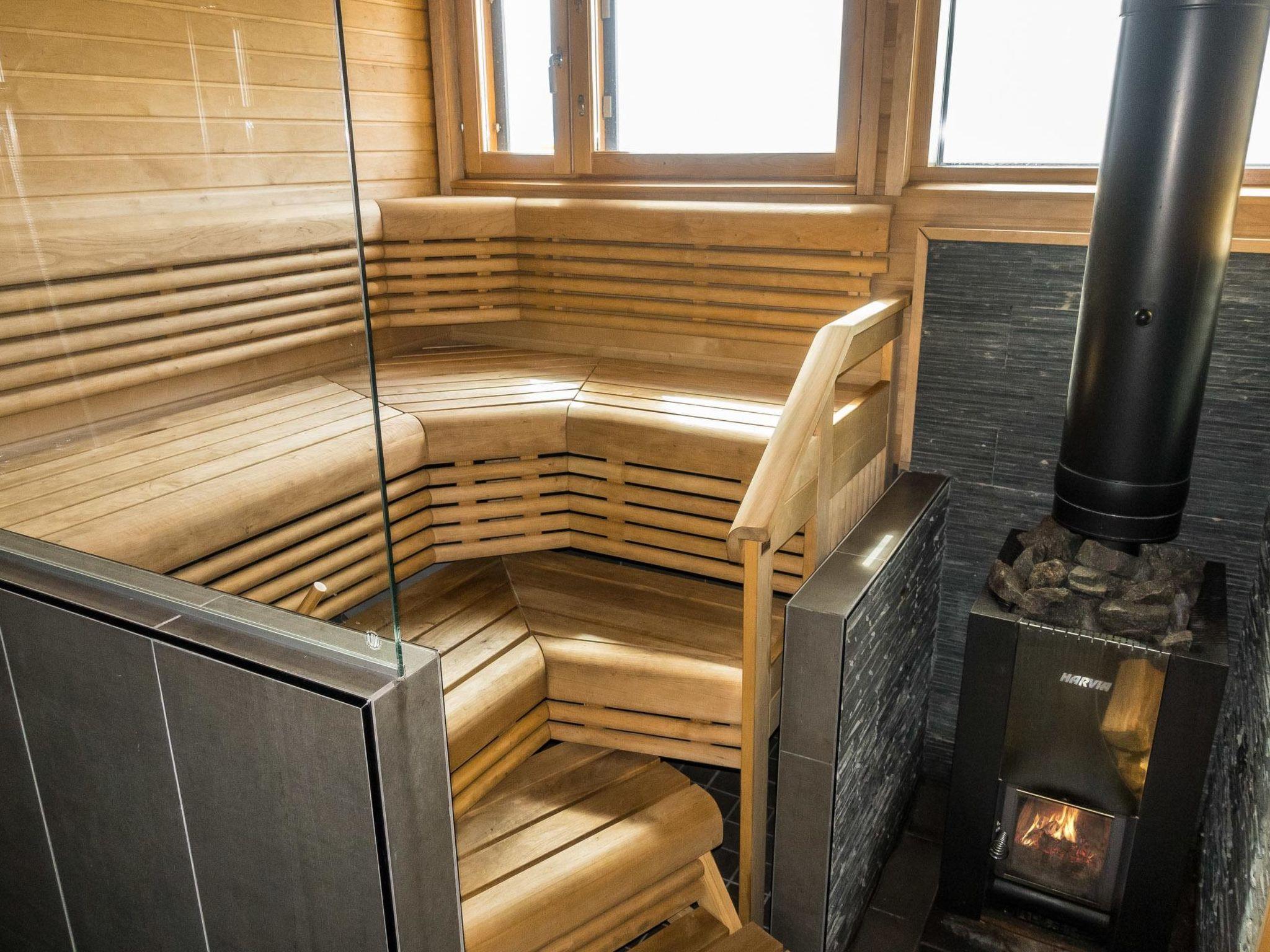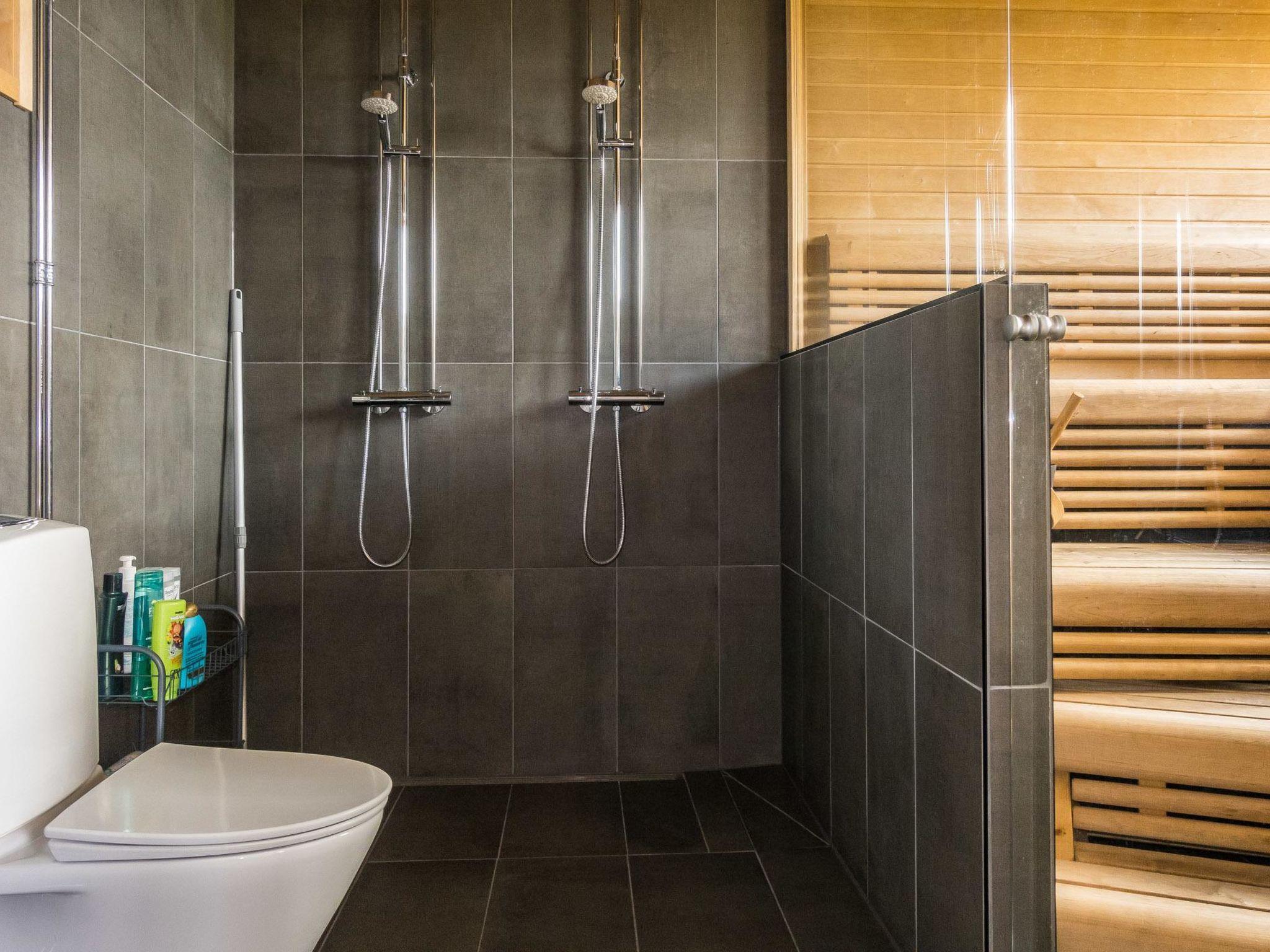 Lakeside sauna with sauna room, washroom/WC, living room and terrace. 2 showers in the washroom, sink, fridge and TV in the living room.