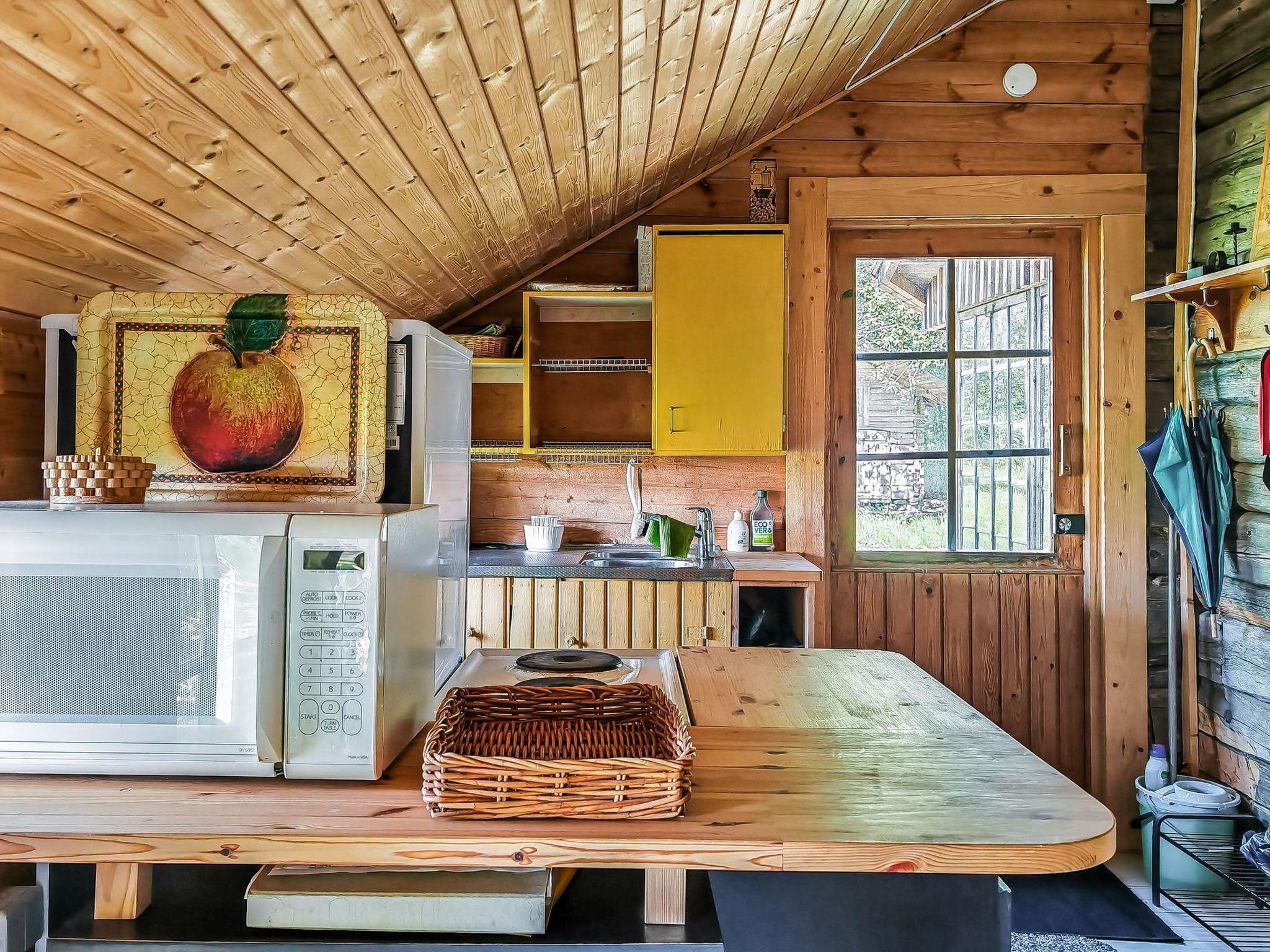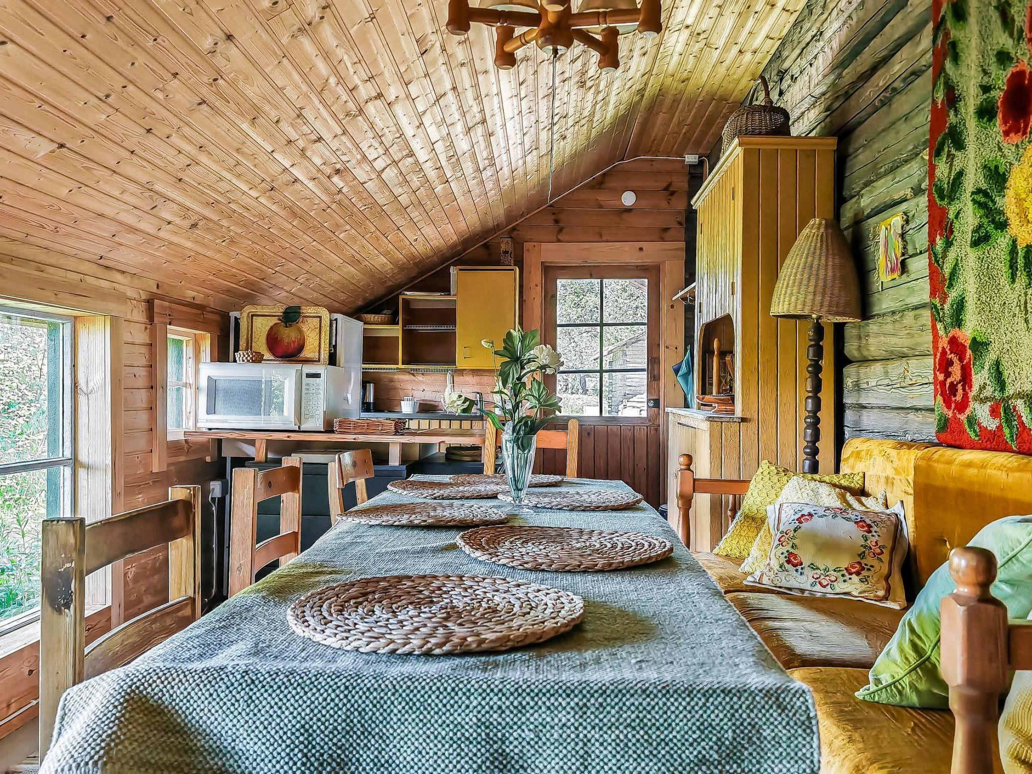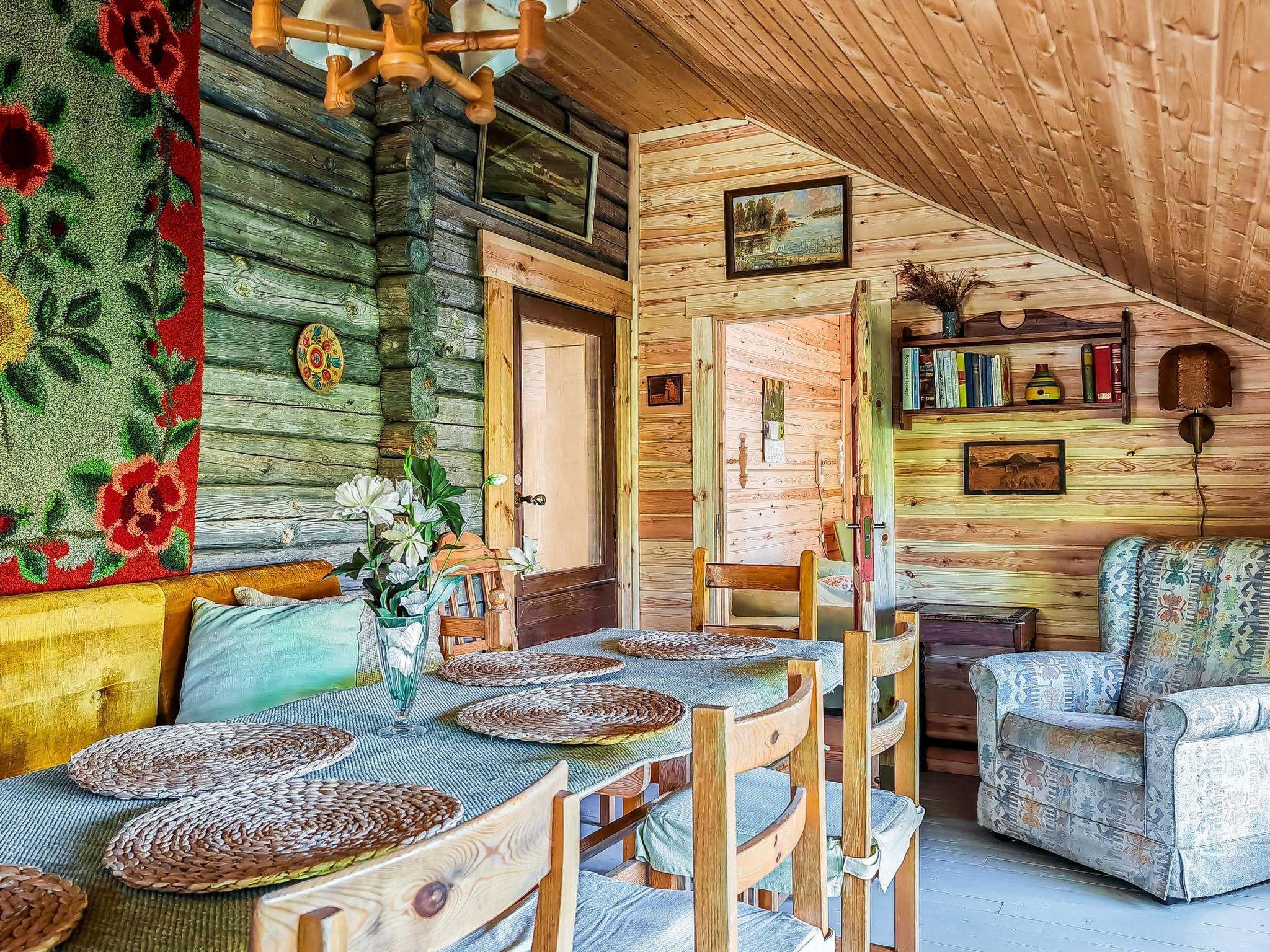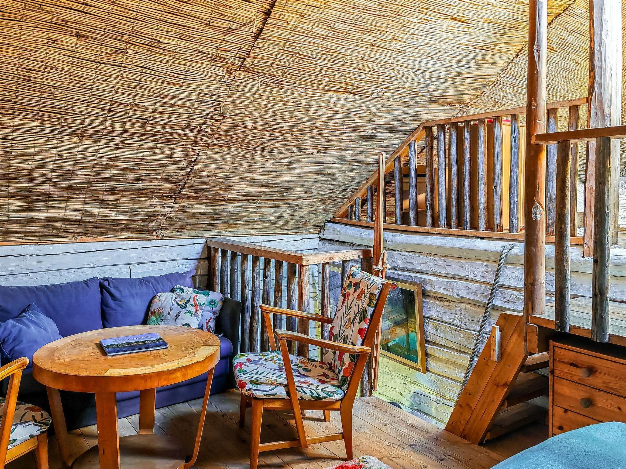 The wooden cabin features a dining hall and a living room/kitchen. There is one bedroom with a double bed, the bathroom has a WC and shower cubicle. The loft, accessed via steep, narrow ladder-like stairs, includes sofas and a double bed. On the upper level of the loft, there is a cozy sleeping area with three floor mattresses. The loft does not have heating. The cabin is also equipped with a large, glazed living area with space for lounging and dining.