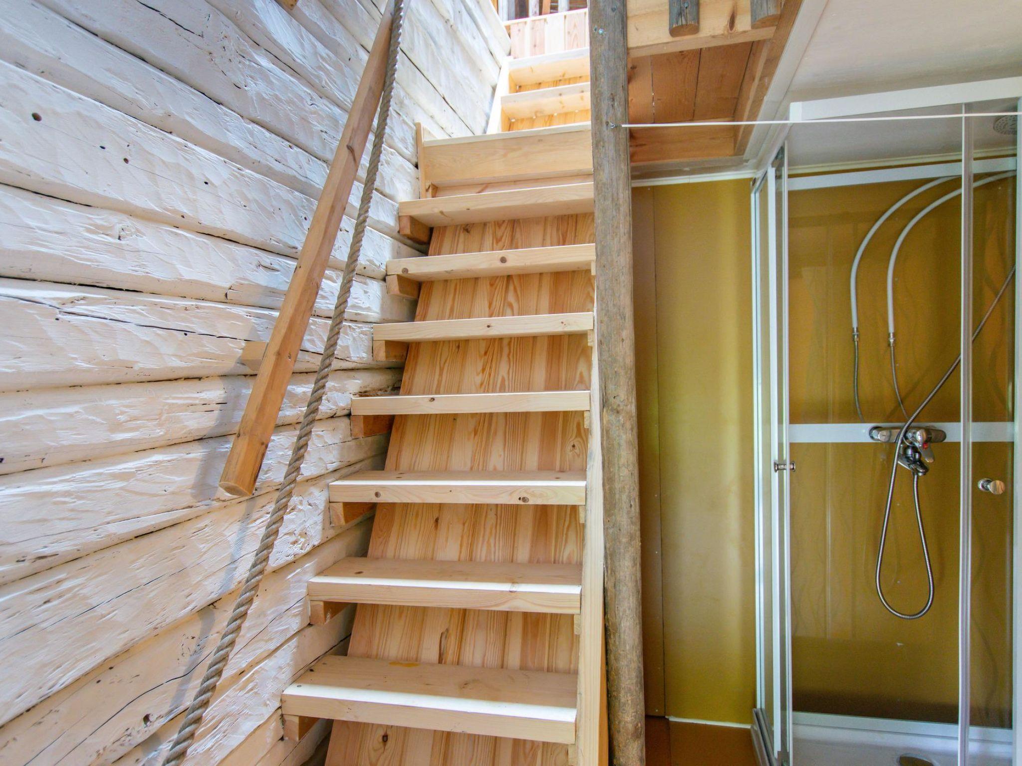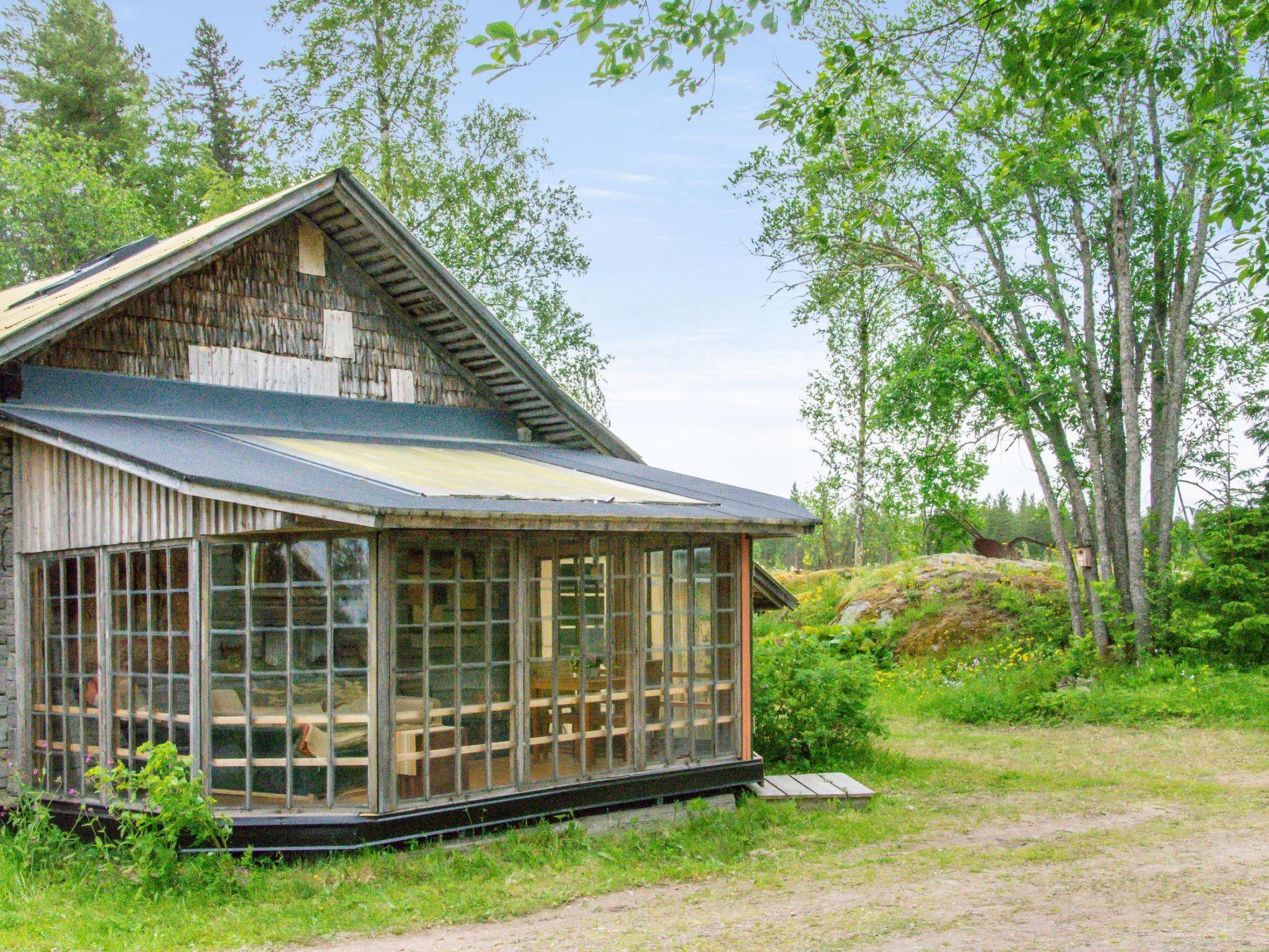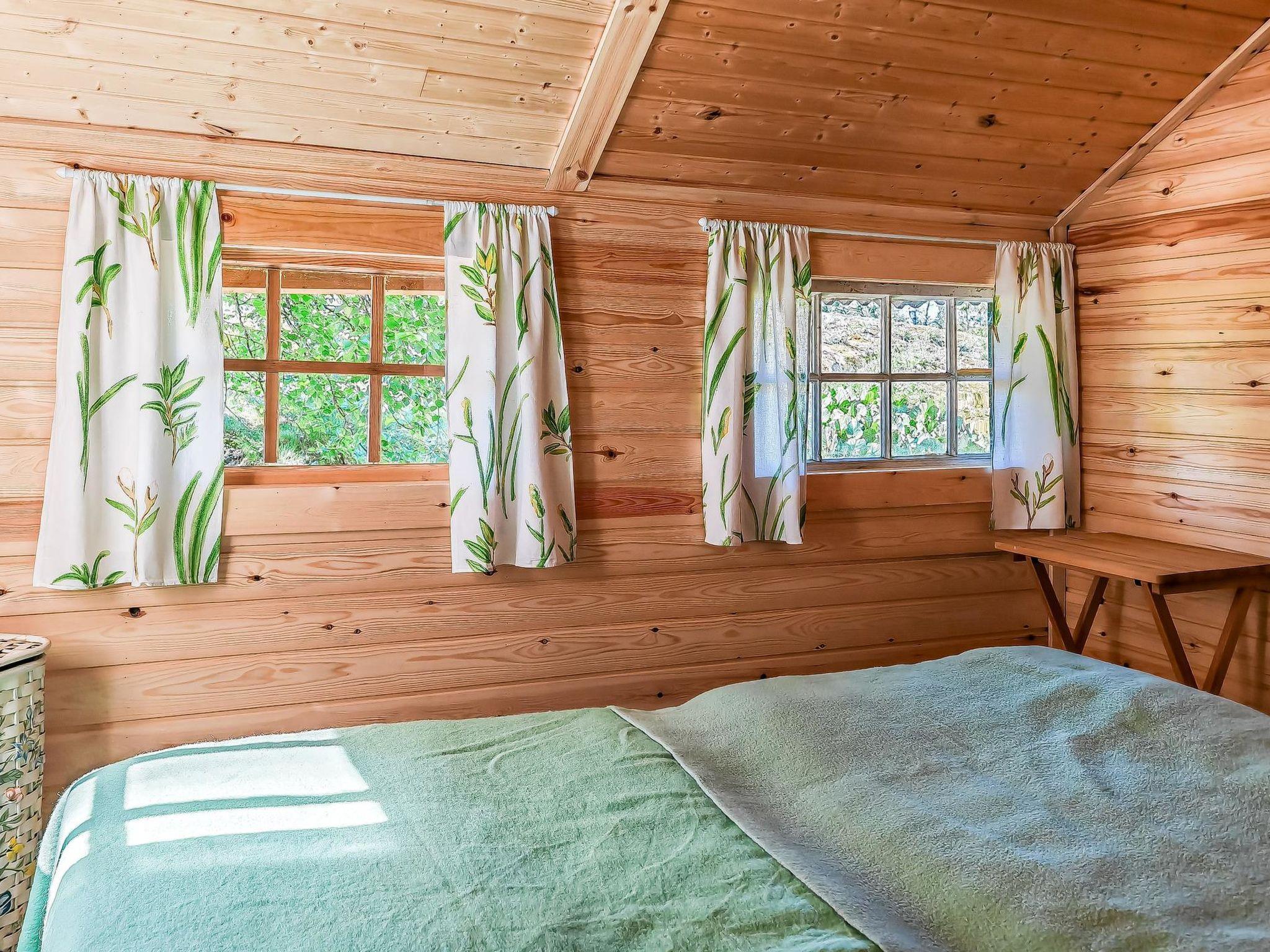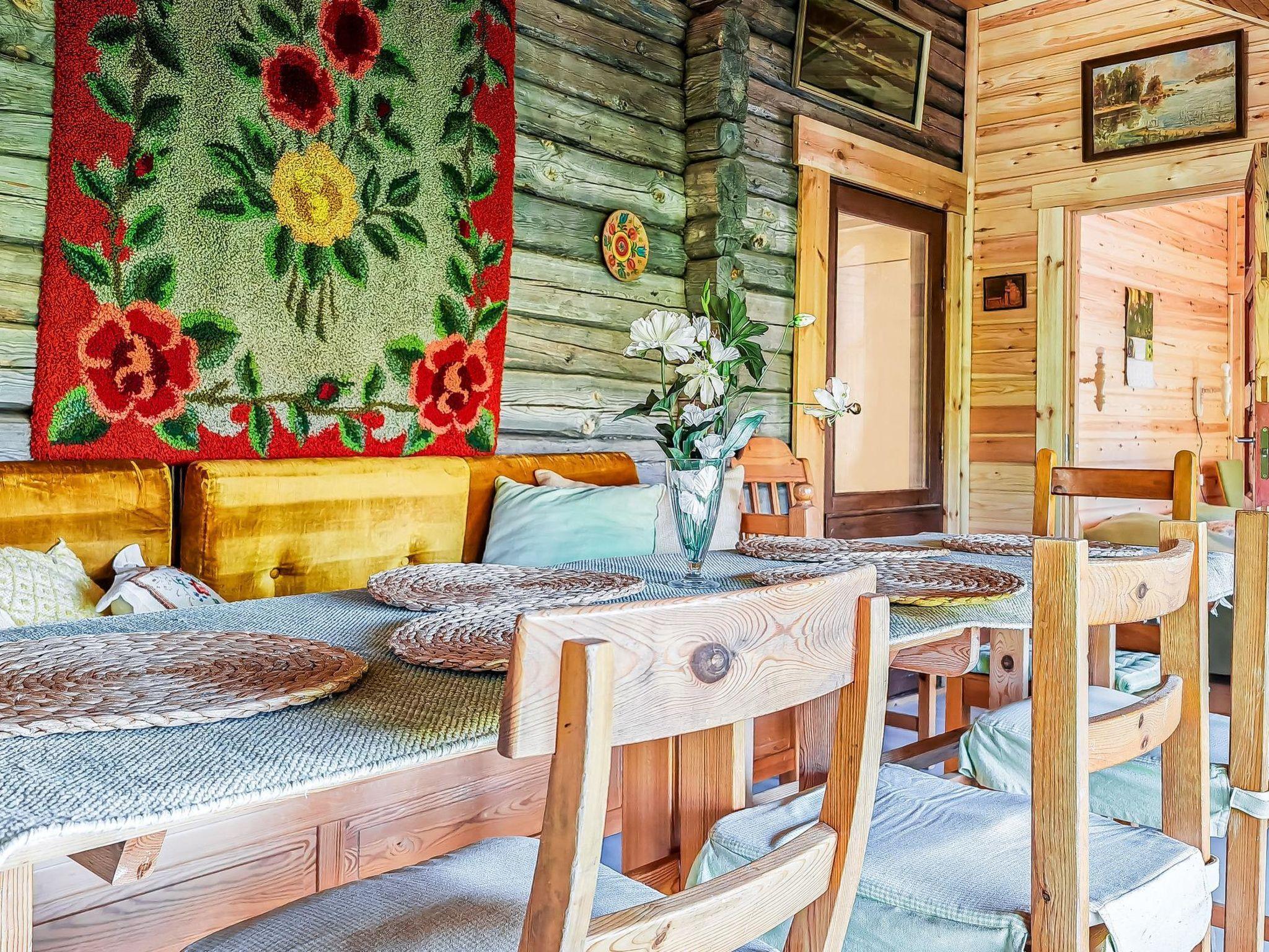 The wooden cabin features a dining hall and a living room/kitchen. There is one bedroom with a double bed, the bathroom has a WC and shower cubicle. The loft, accessed via steep, narrow ladder-like stairs, includes sofas and a double bed. On the upper level of the loft, there is a cozy sleeping area with three floor mattresses. The loft does not have heating. The cabin is also equipped with a large, glazed living area with space for lounging and dining.