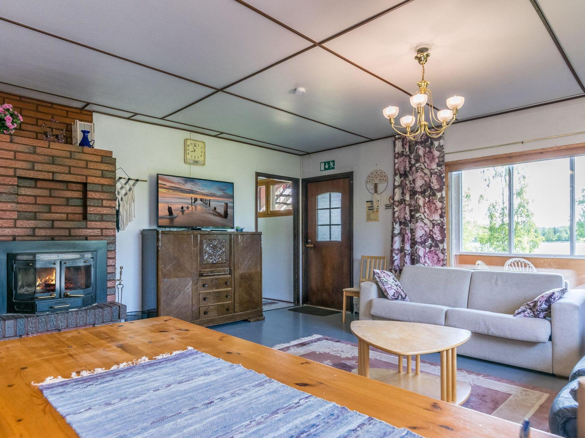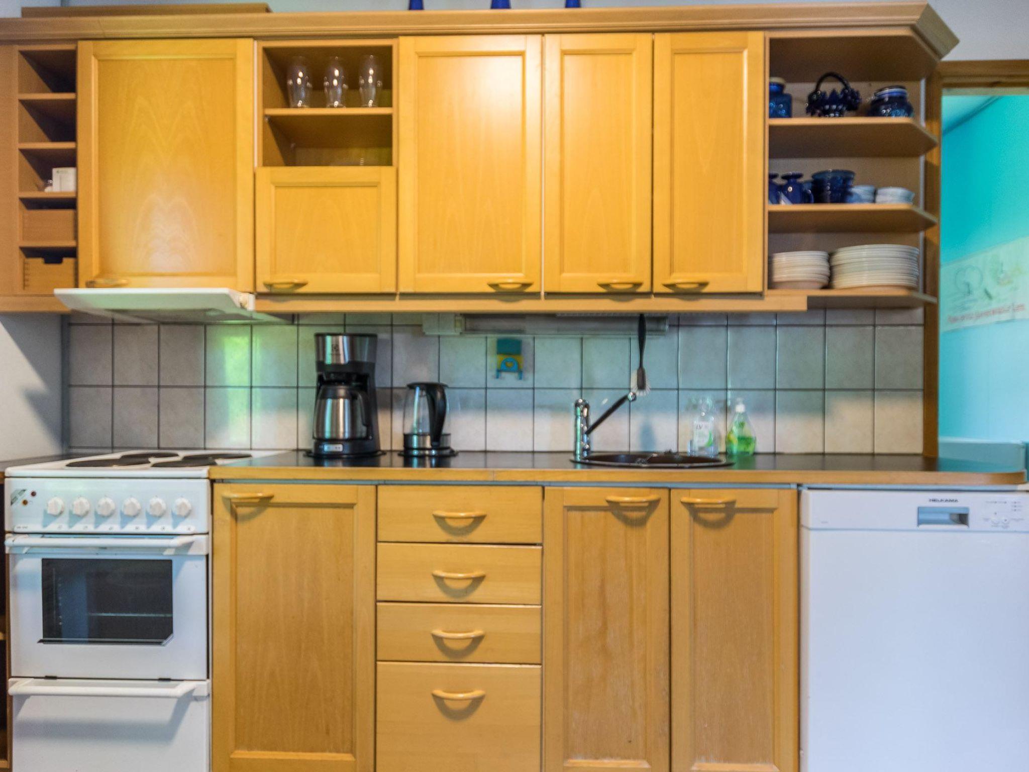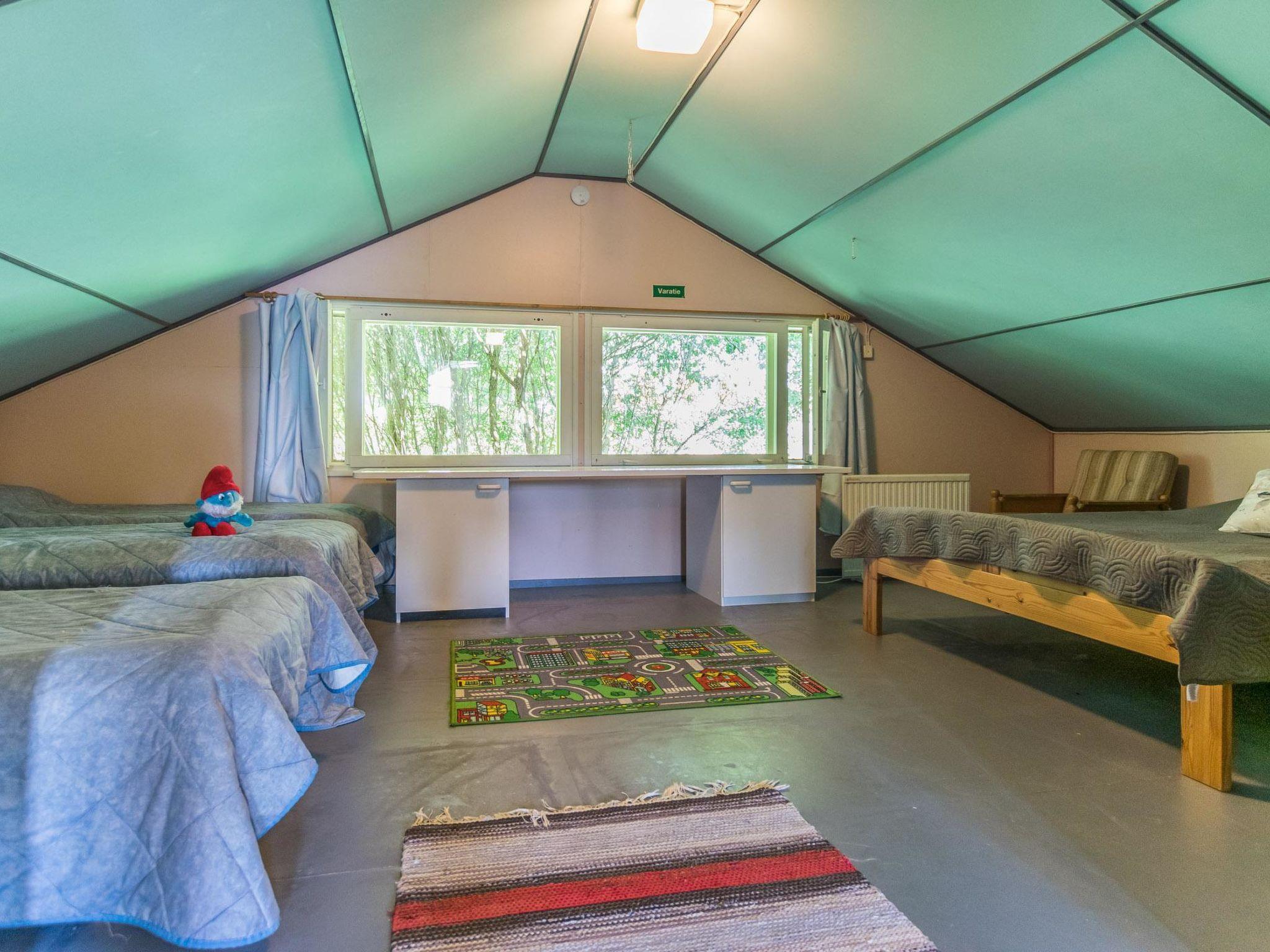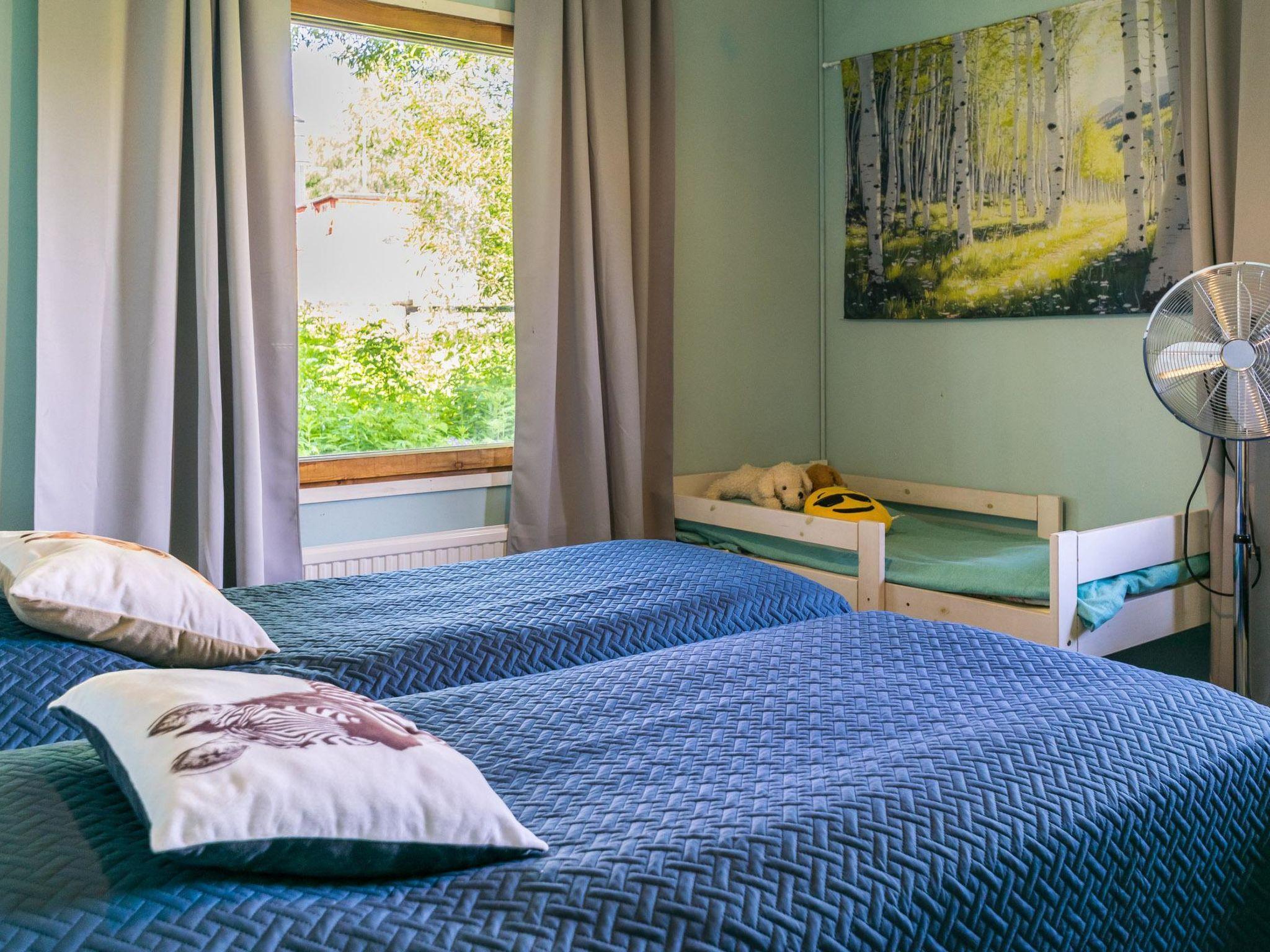 The wooden cabin, built in 1995. The ground floor features a living room with a sofa set, dining table, heat-storing fireplace, and TV. A kitchenette includes a stove, refrigerator and freezer, dishwasher, microwave, coffee maker, and kettle. Two bedrooms — one with two beds plus an extendable children’s bed and a crib, and the other with two beds. Separate WC, sauna with wood-burning stove, shower, and dressing room.