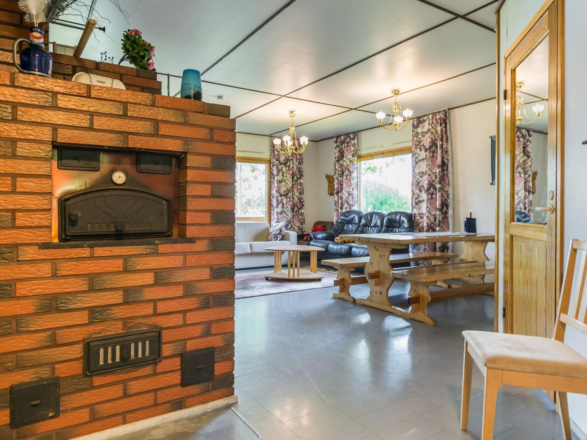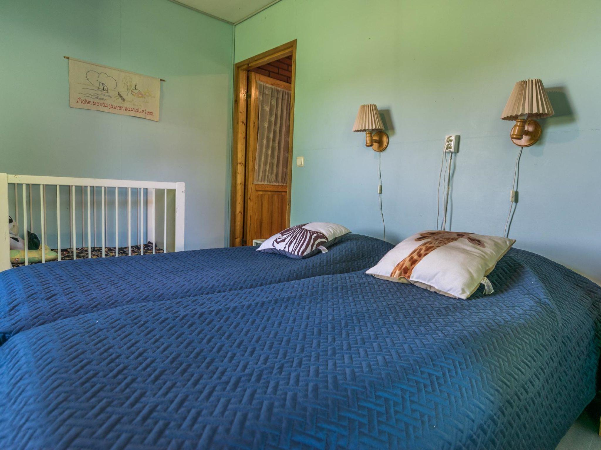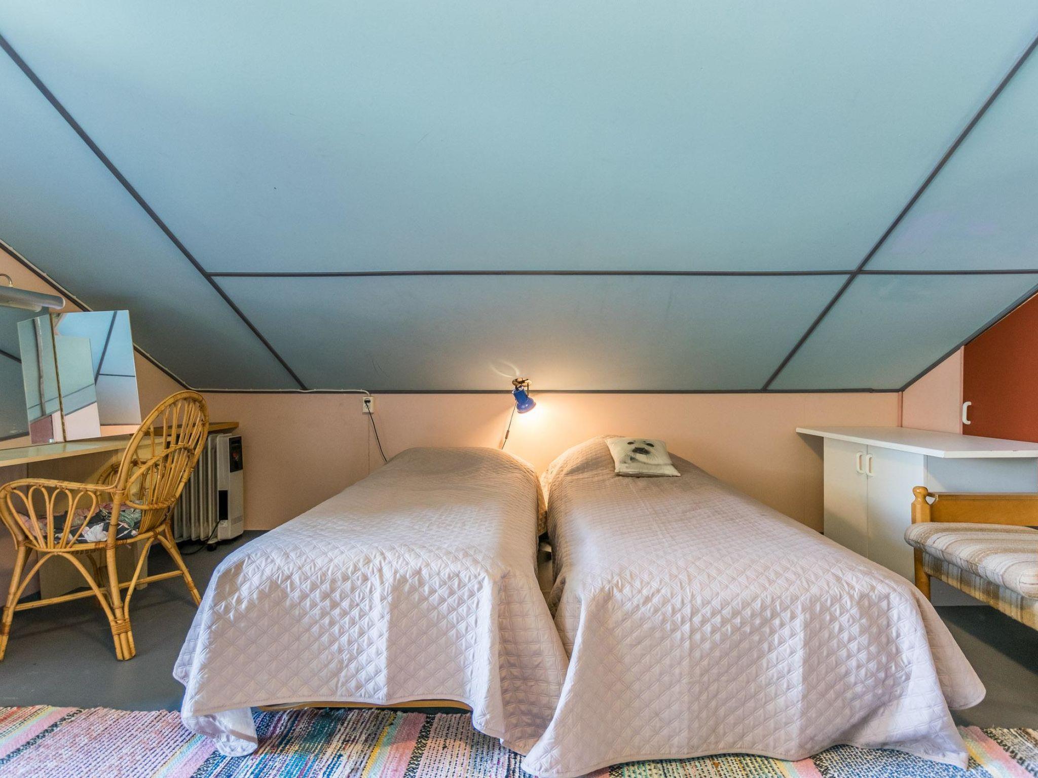 The wooden cabin, built in 1995. The ground floor features a living room with a sofa set, dining table, heat-storing fireplace, and TV. A kitchenette includes a stove, refrigerator and freezer, dishwasher, microwave, coffee maker, and kettle. Two bedrooms — one with two beds plus an extendable children’s bed and a crib, and the other with two beds. Separate WC, sauna with wood-burning stove, shower, and dressing room.