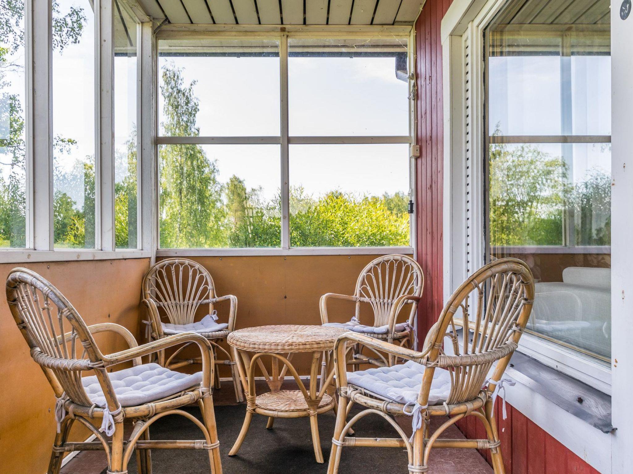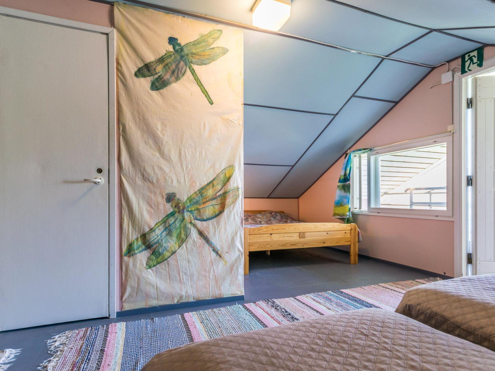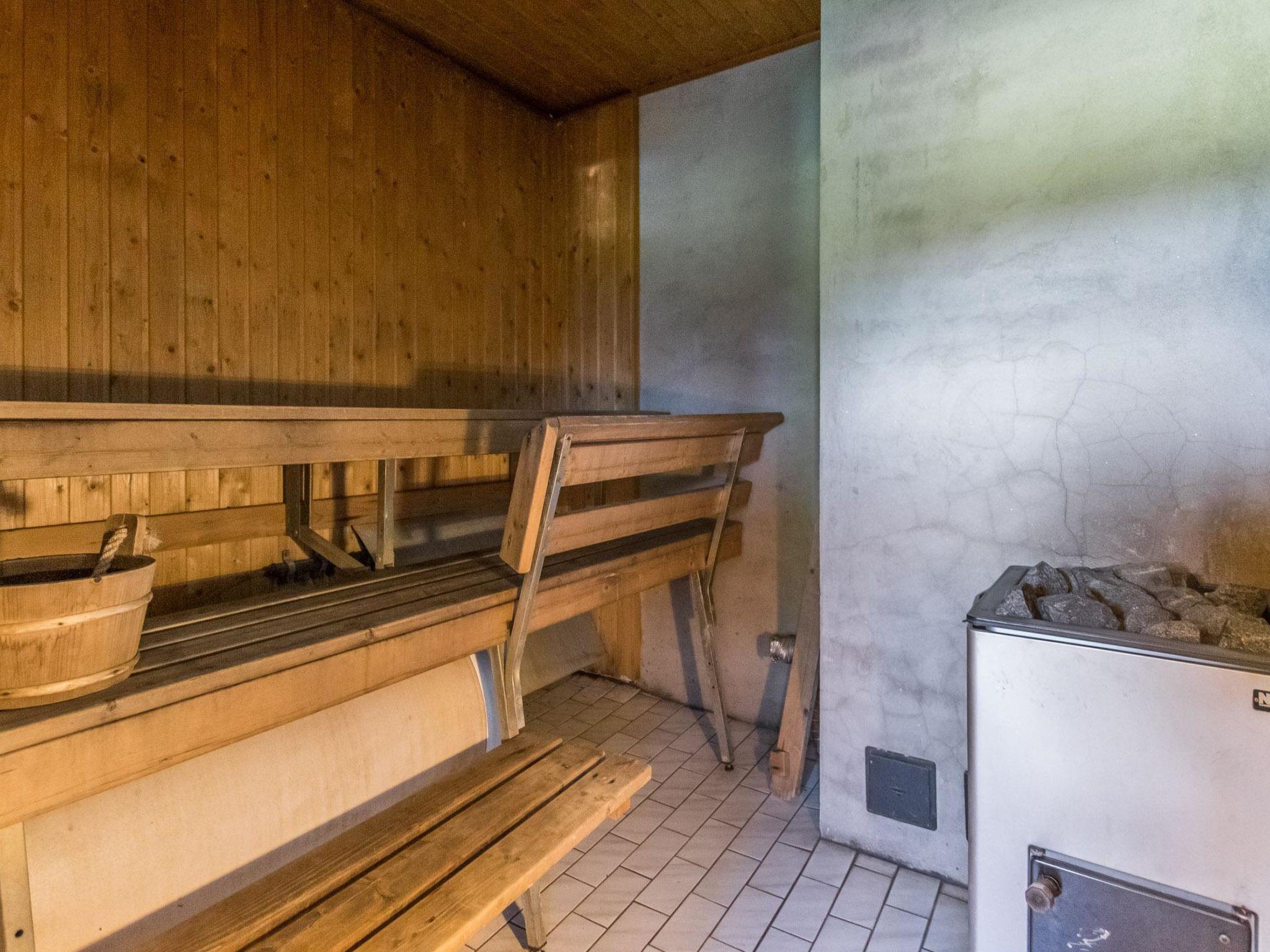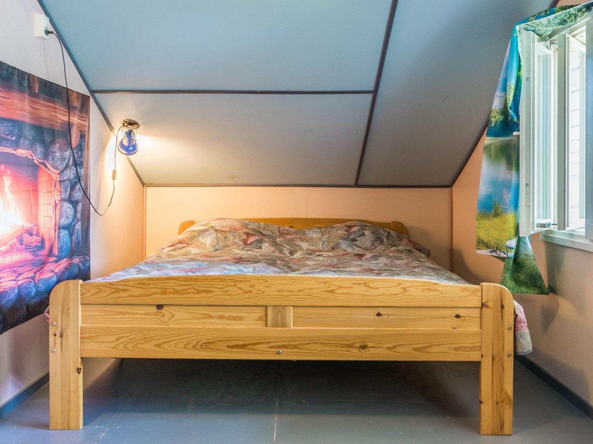 The wooden cabin, built in 1995. The ground floor features a living room with a sofa set, dining table, heat-storing fireplace, and TV. A kitchenette includes a stove, refrigerator and freezer, dishwasher, microwave, coffee maker, and kettle. Two bedrooms — one with two beds plus an extendable children’s bed and a crib, and the other with two beds. Separate WC, sauna with wood-burning stove, shower, and dressing room.
