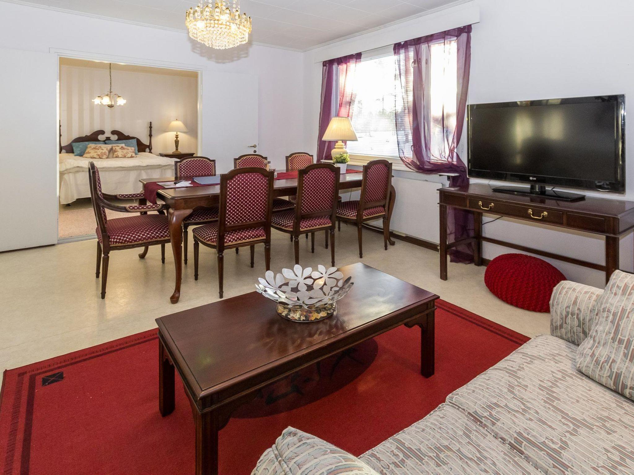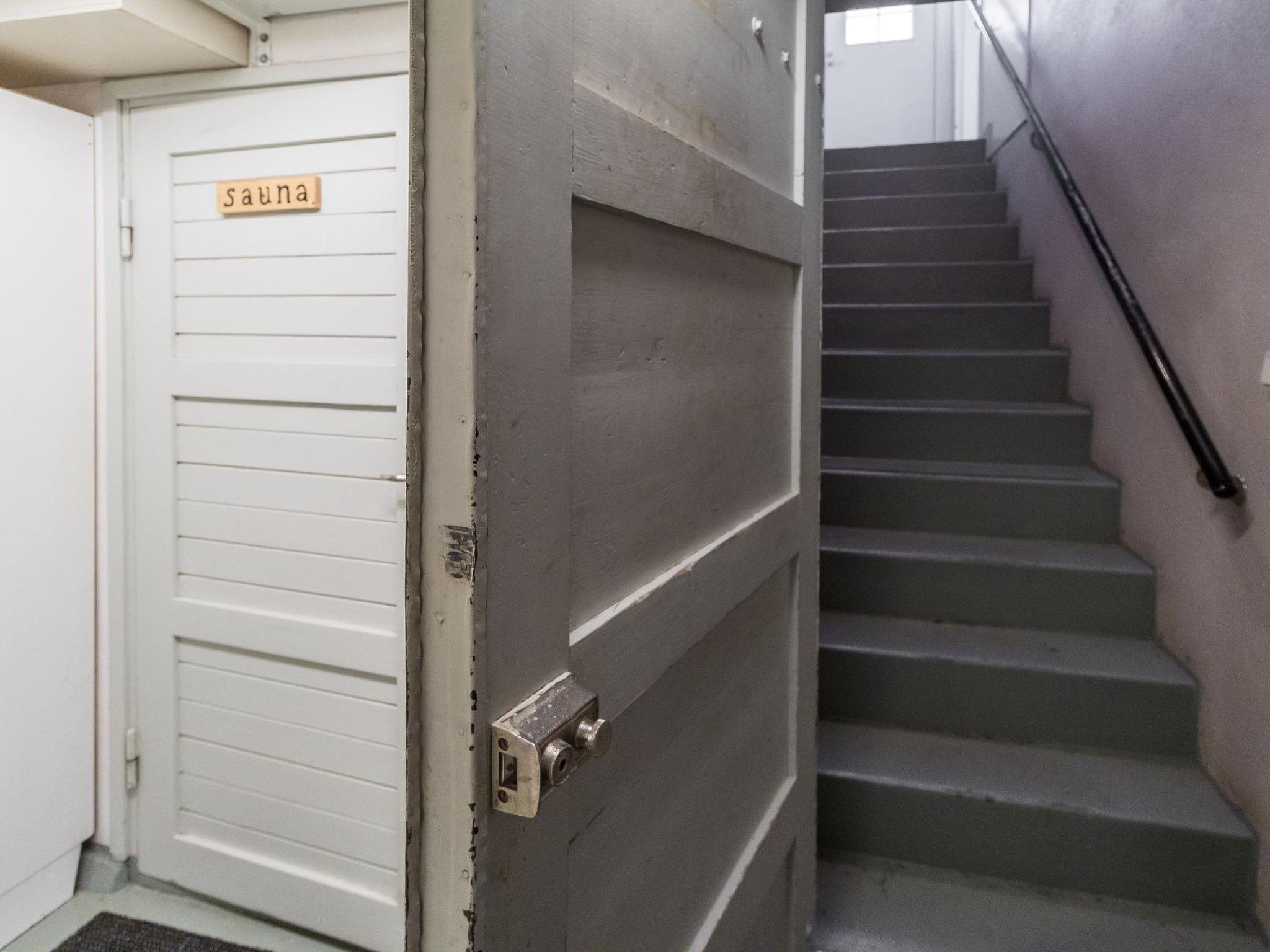 The apartment features a spacious living room and a bright, roomy kitchen. One bedroom has a 160 cm wide double bed, and the other bedroom has two separate 80 cm wide beds. The living room contains a sofa bed, which is 140 cm wide when opened. The washroom includes a shower and WC. In shared use with another apartment: a sauna, washing facilities, washing machine in the basement, and a tepee in the yard.