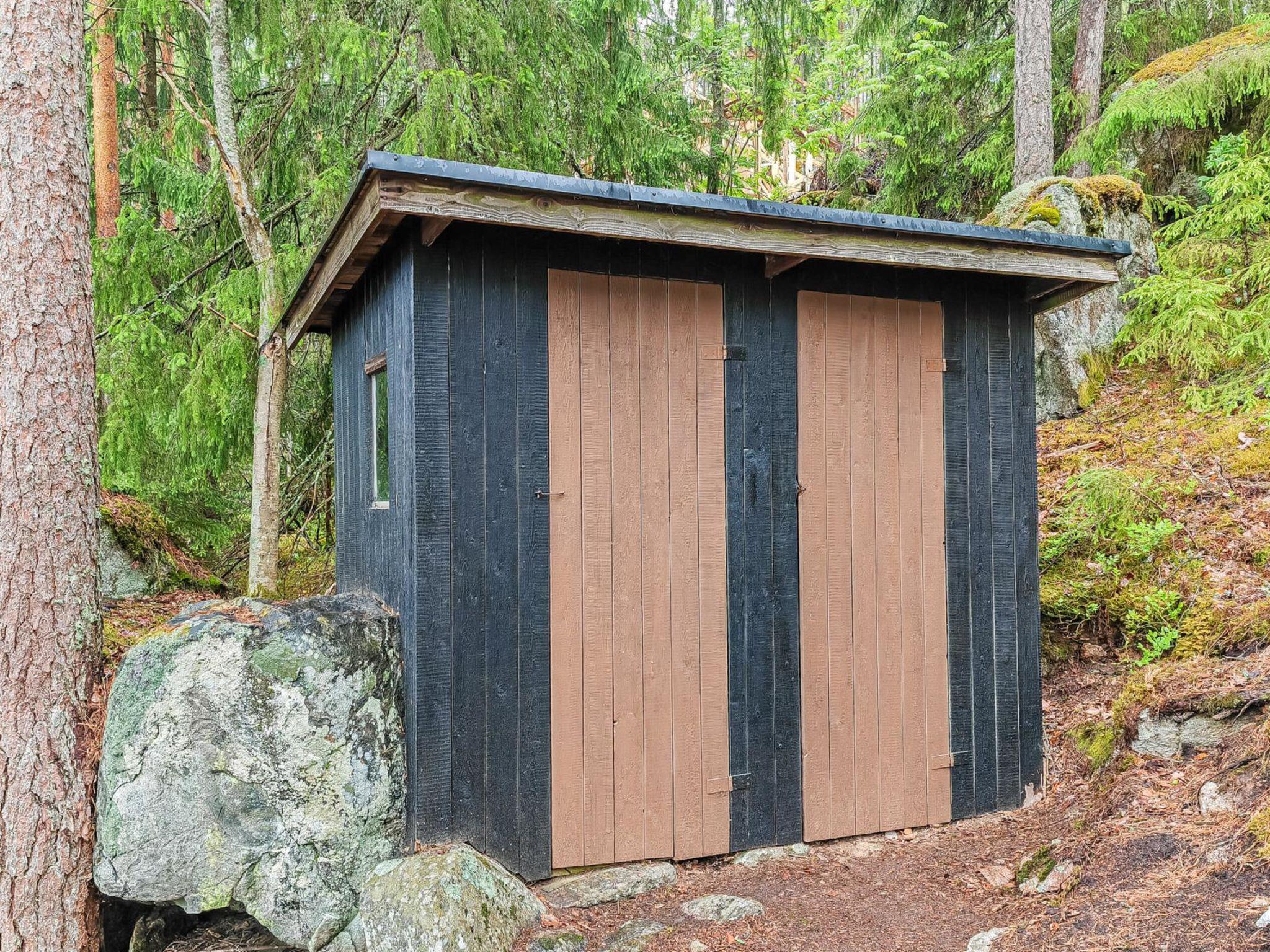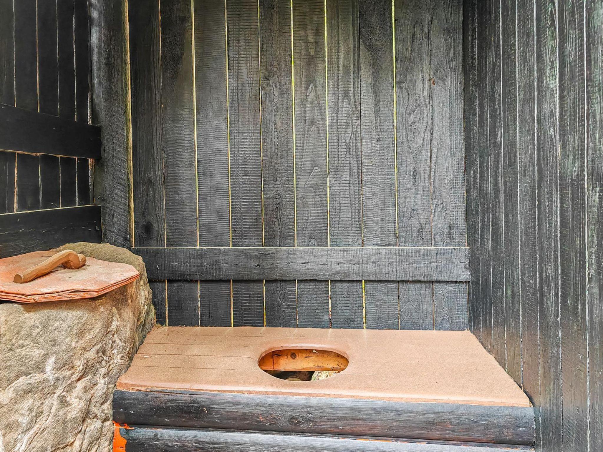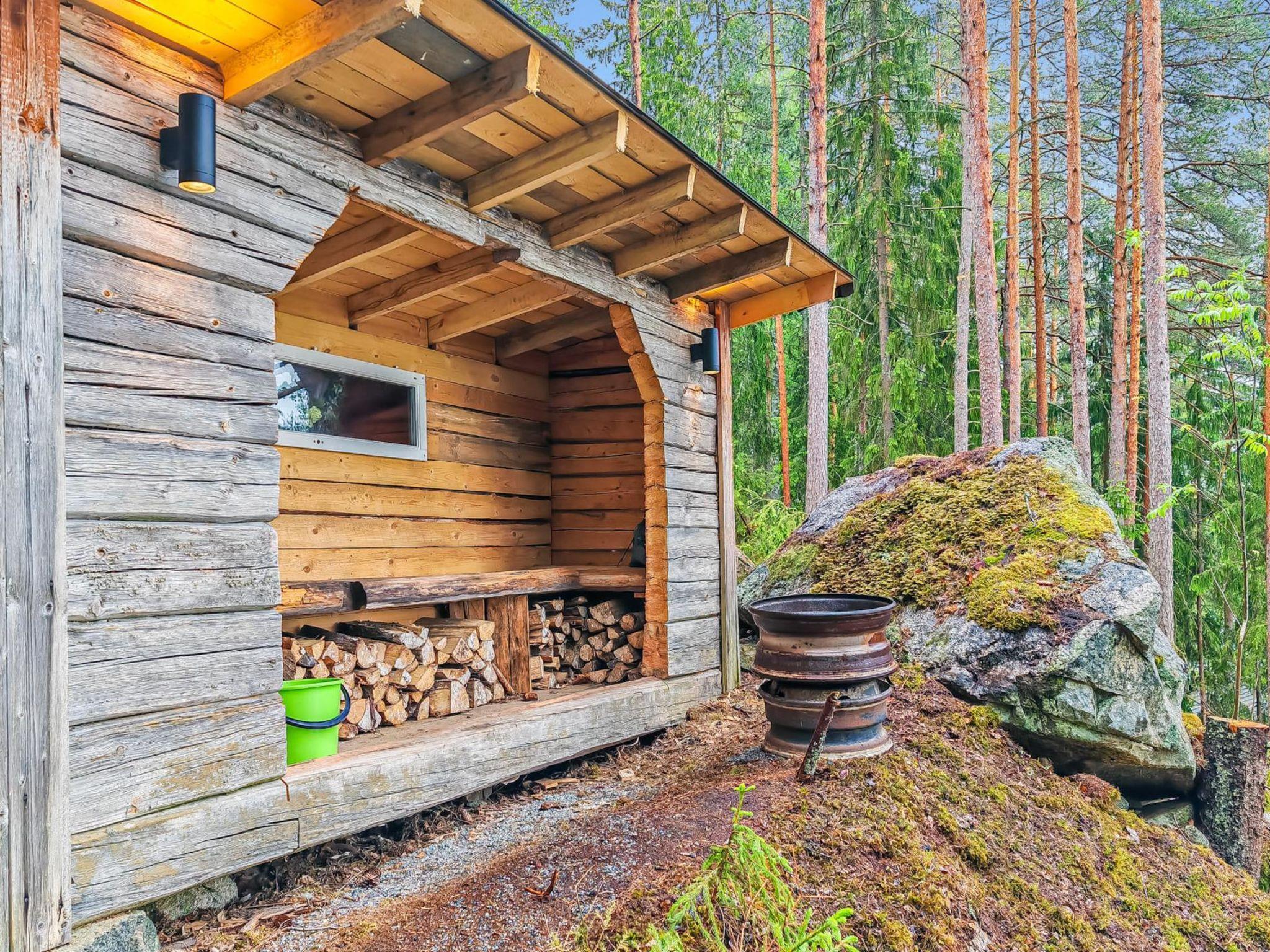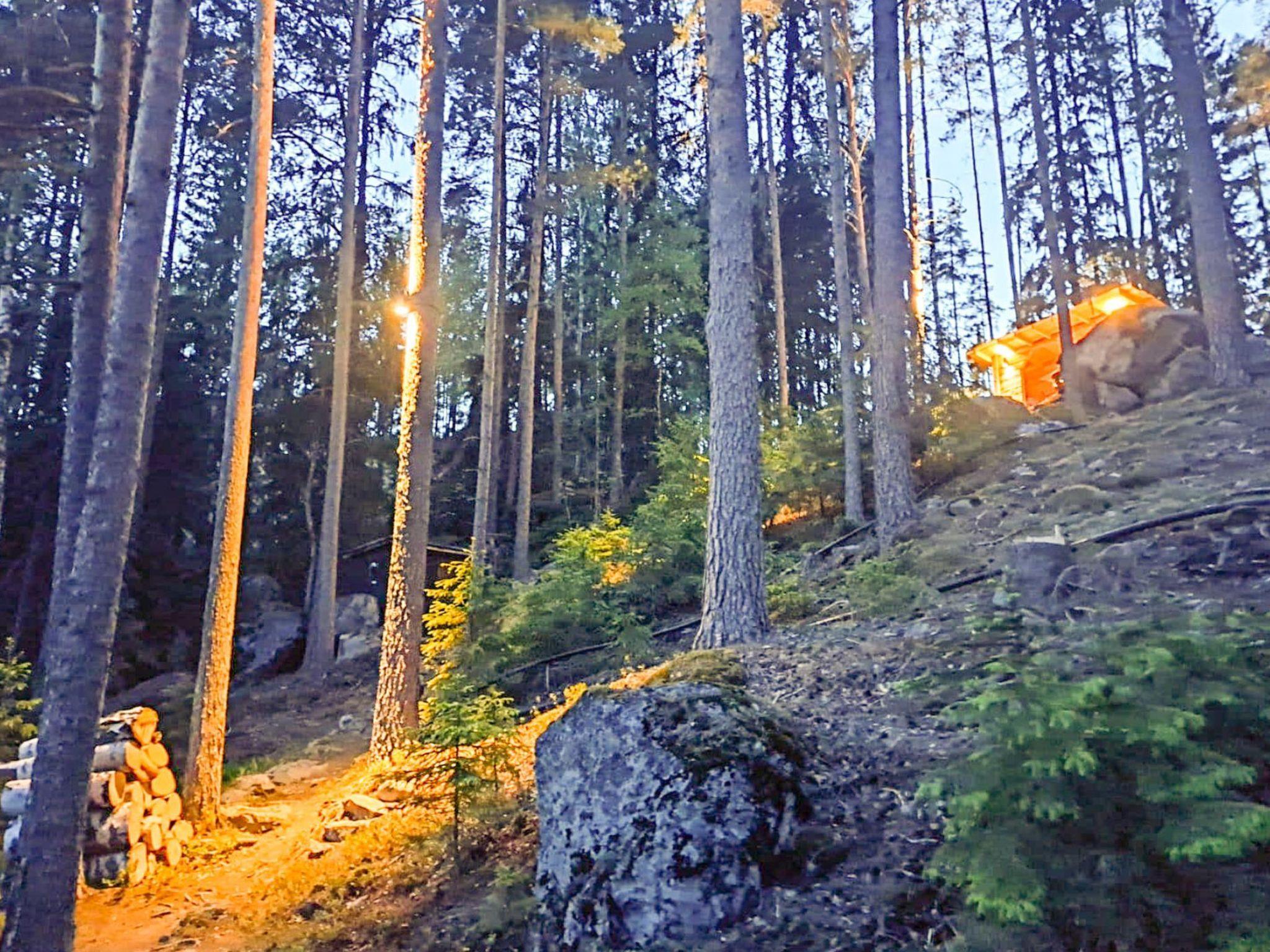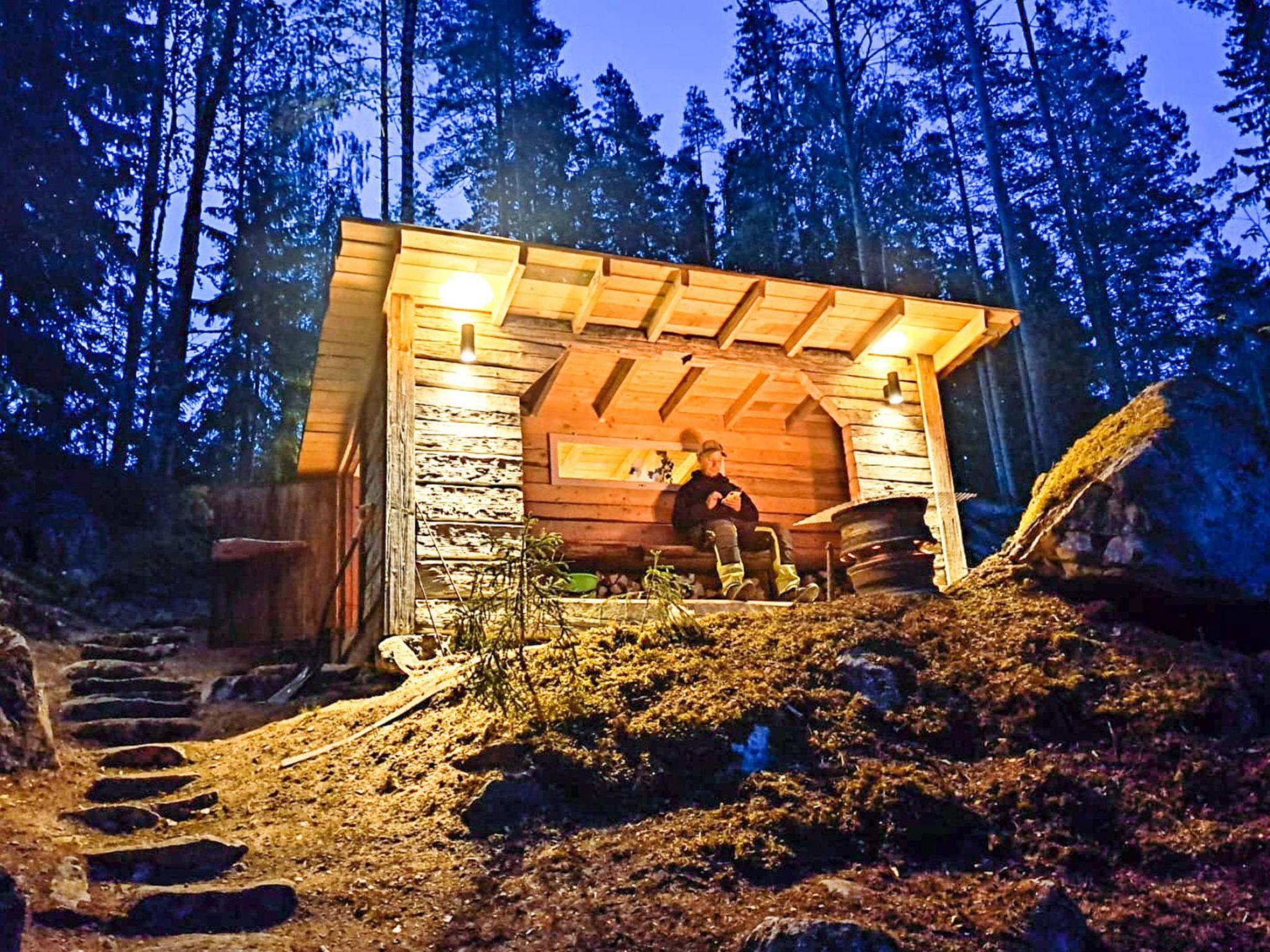 On the slope, a lean-to with a low sleeping space (140x200 cm air mattress). Campfire place next to the lean-to. Outdoor toilet in the yard. The cabin and the shed have electricity. There is electric lighting in the yard and on the slope. The plot is very steep. There are steps made of natural stone on the slope. The destination is not recommended for people who find it difficult to move in terrain with a lot of height differences.