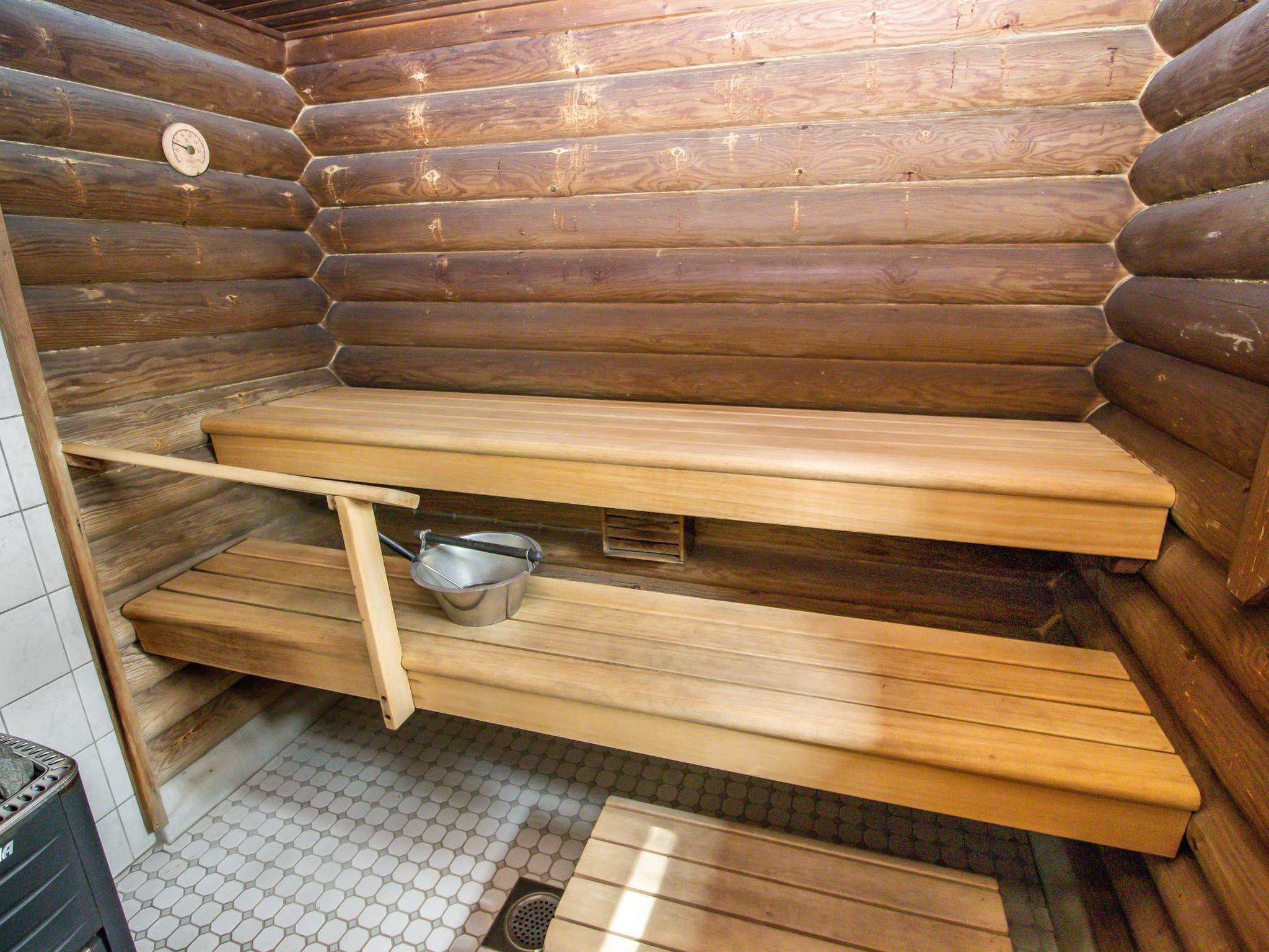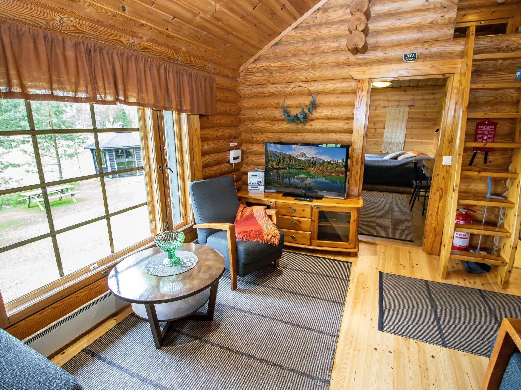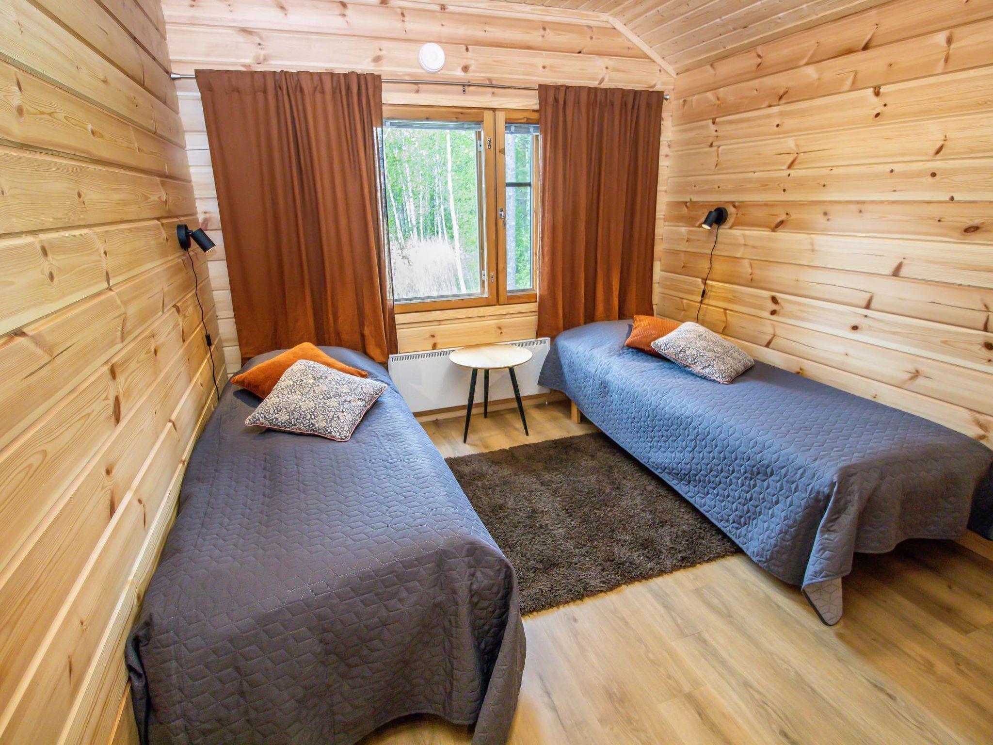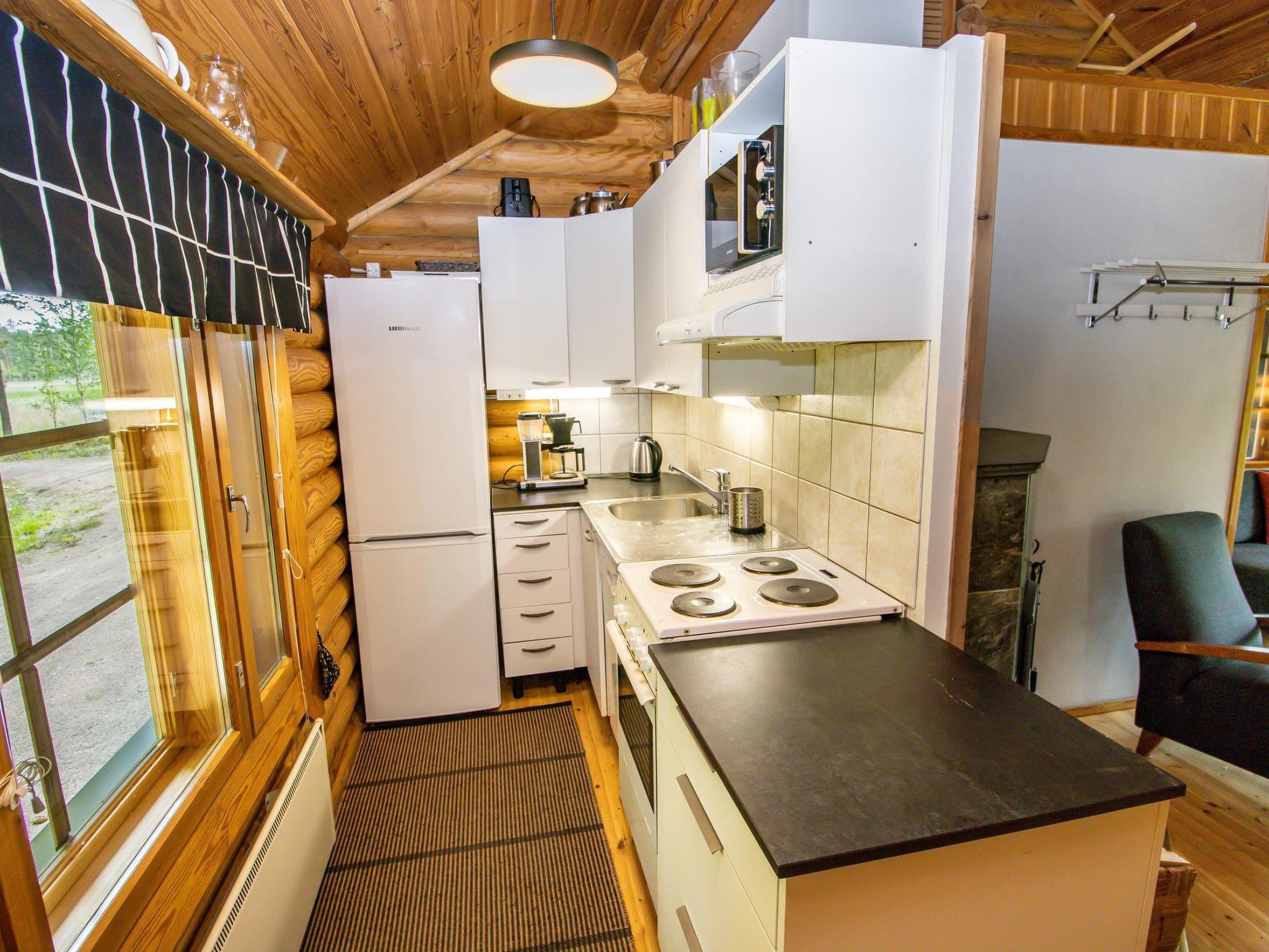 The cabin features a kitchenette, a spacious dining area, and a bright living room. On the ground floor, there are two bedrooms with separate beds; one of the bedrooms also features a dedicated remote work space. The loft offers sleeping space for two. On the same floor, you'll find a wood-heated sauna, a shower, and a WC.