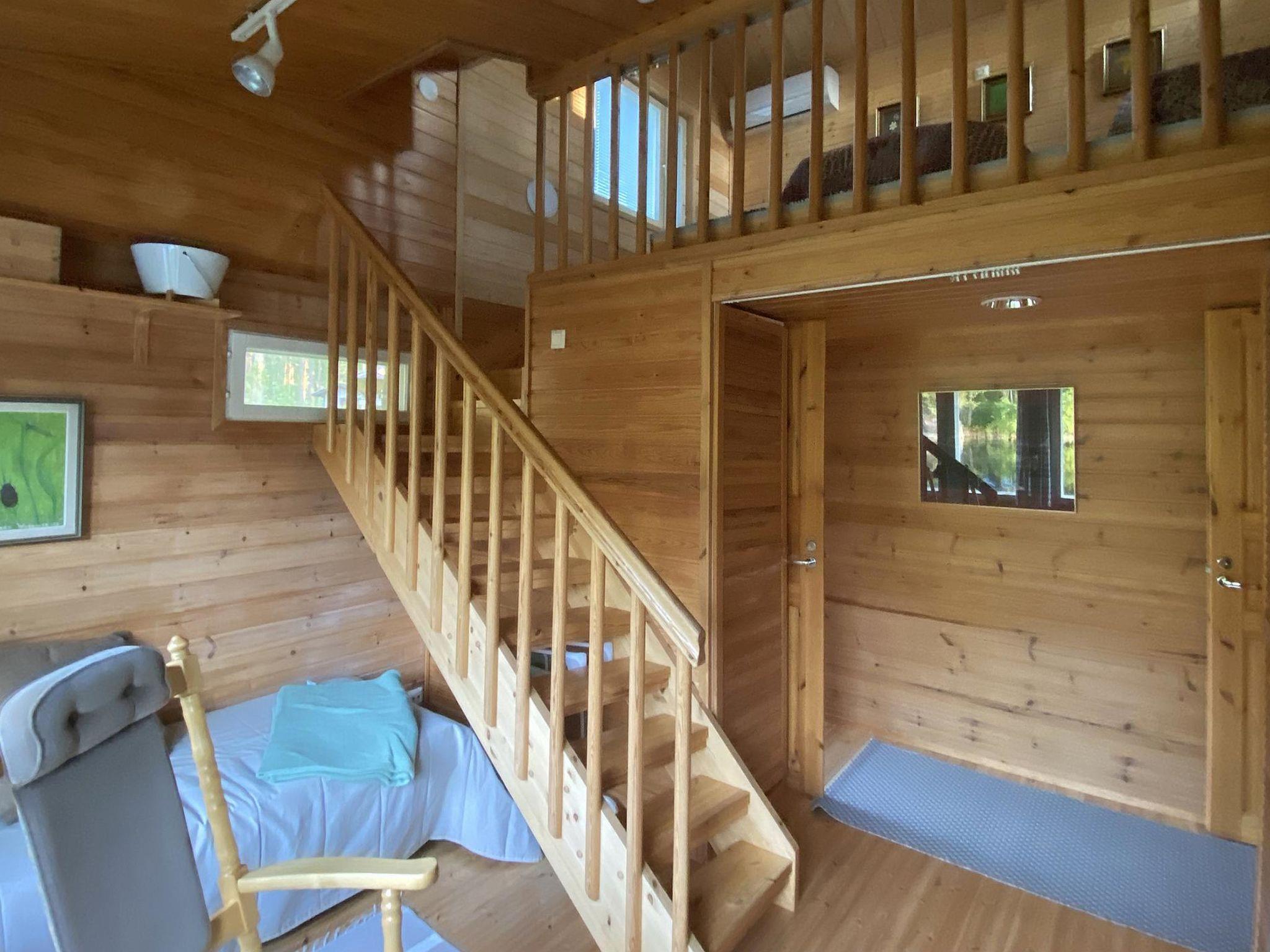 Wooden cabin 1995, renovated in 2010 and 2020, kitchen, living room, bedroom (11 m²) double bed, bedroom (7 m²) 120 cm wide bed, on the loft two beds (11 m², room height 230 cm), washroom with shower and toilet, renovated in 2025.