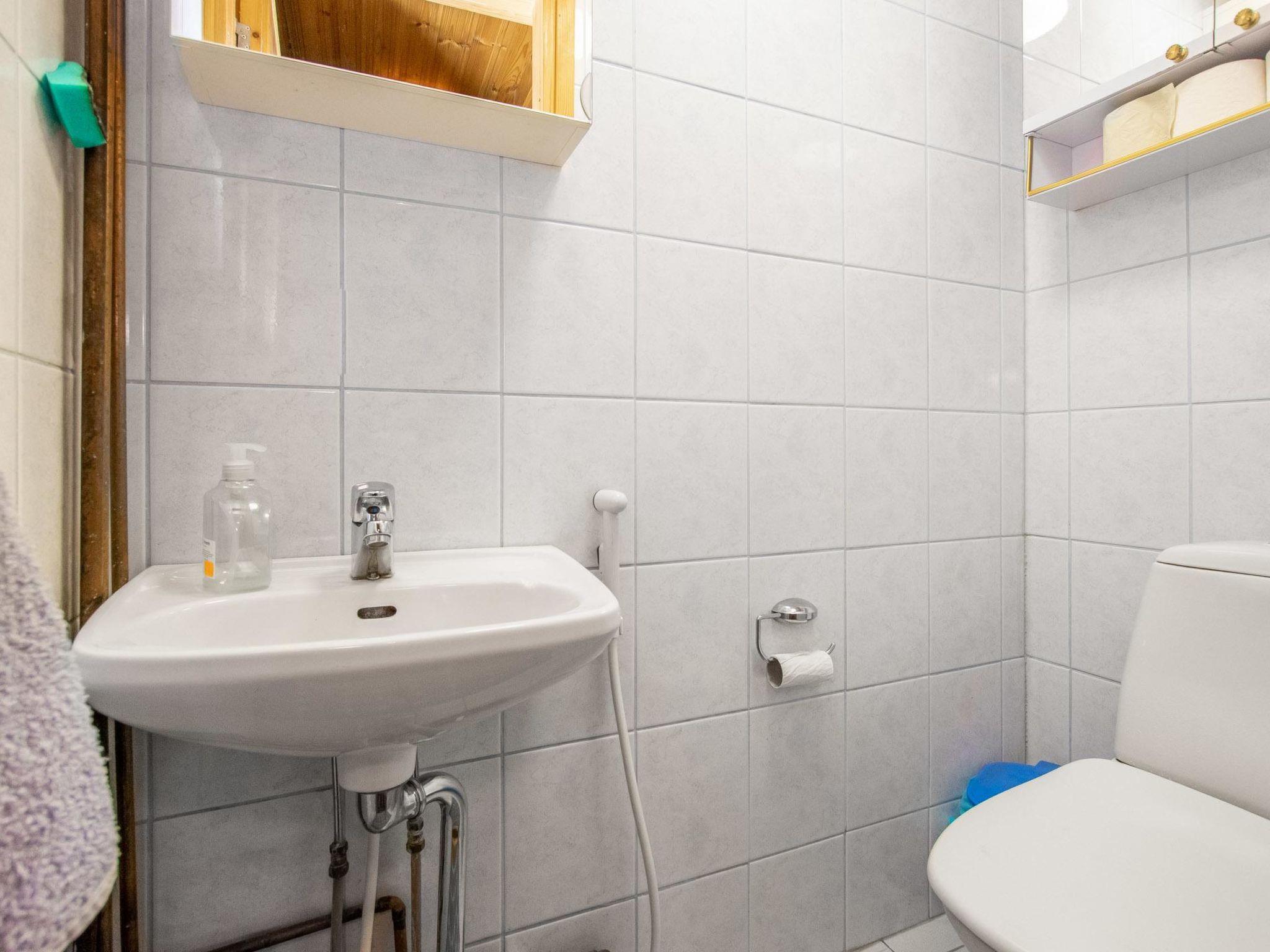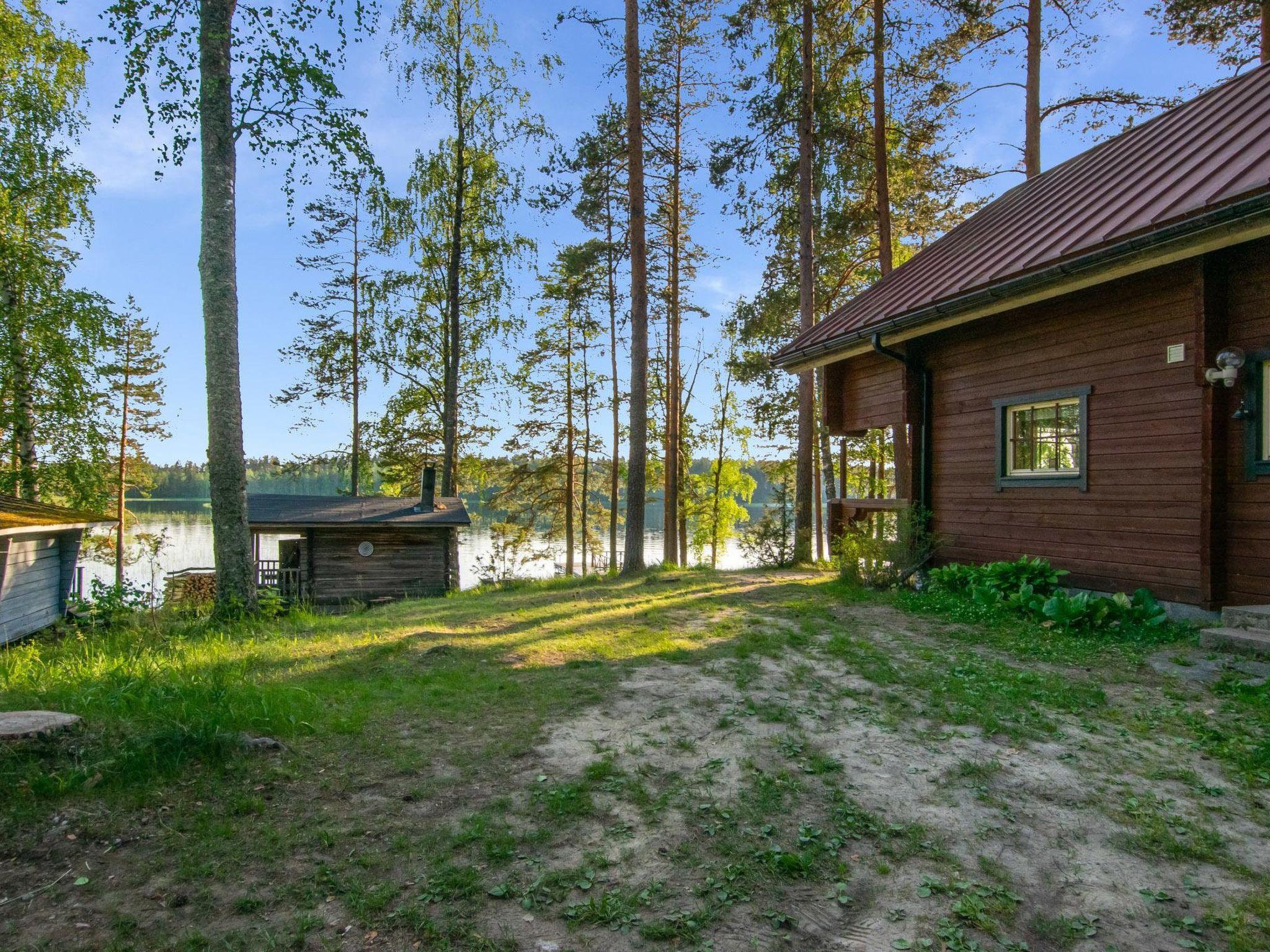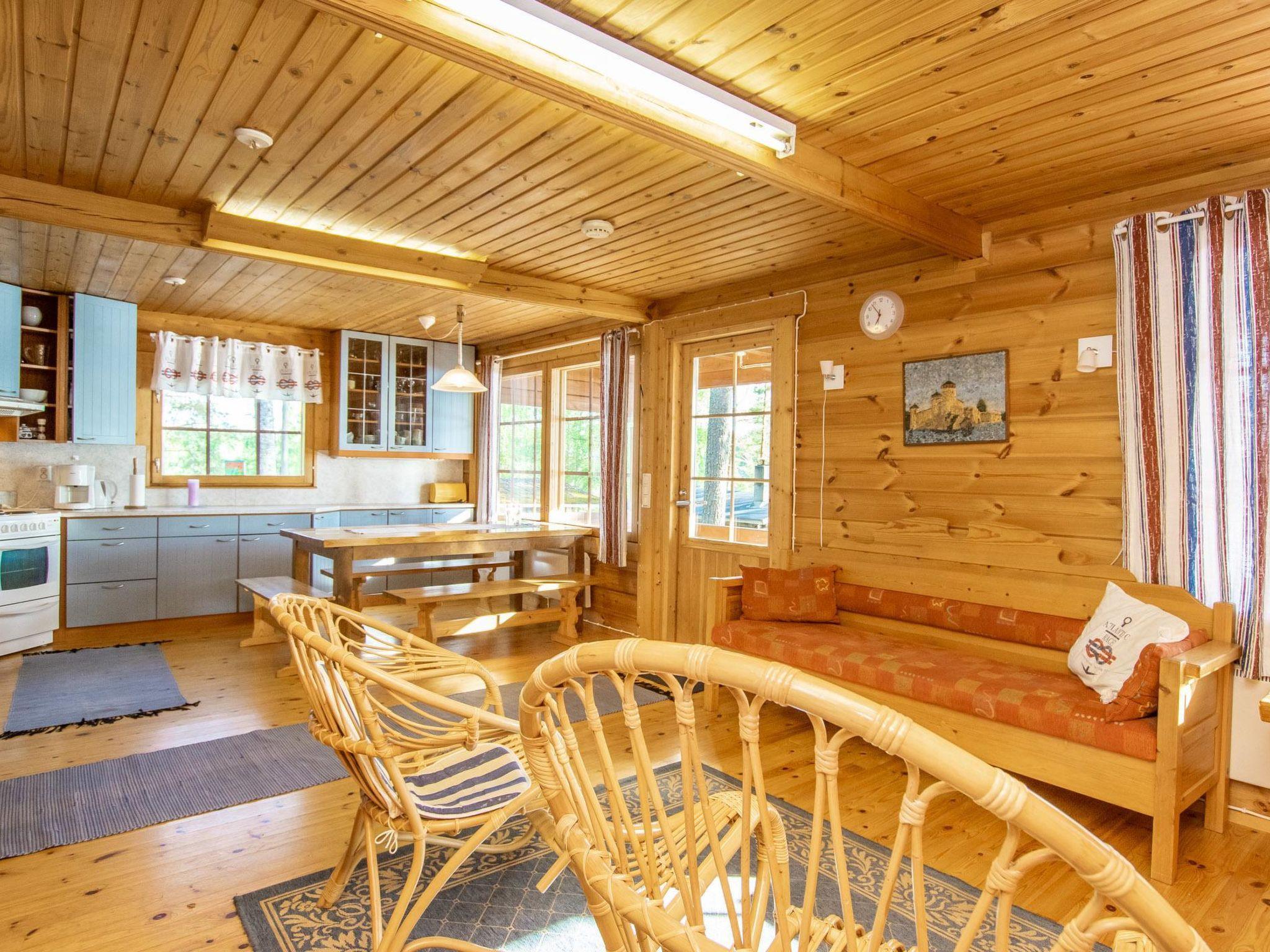 Log cabin 1994, living room/kitchen (30 m²), bedroom (7 m²) double bed, washroom, sauna (wood-burning sauna stove), separate WC. On the upper floor bedroom (12 m²) with double bed and two sofas, another bedroom (14 m²) with double bed and travel bed, third bedroom (20 m²) with two beds and spreadable bed (two extra beds) and balcony.