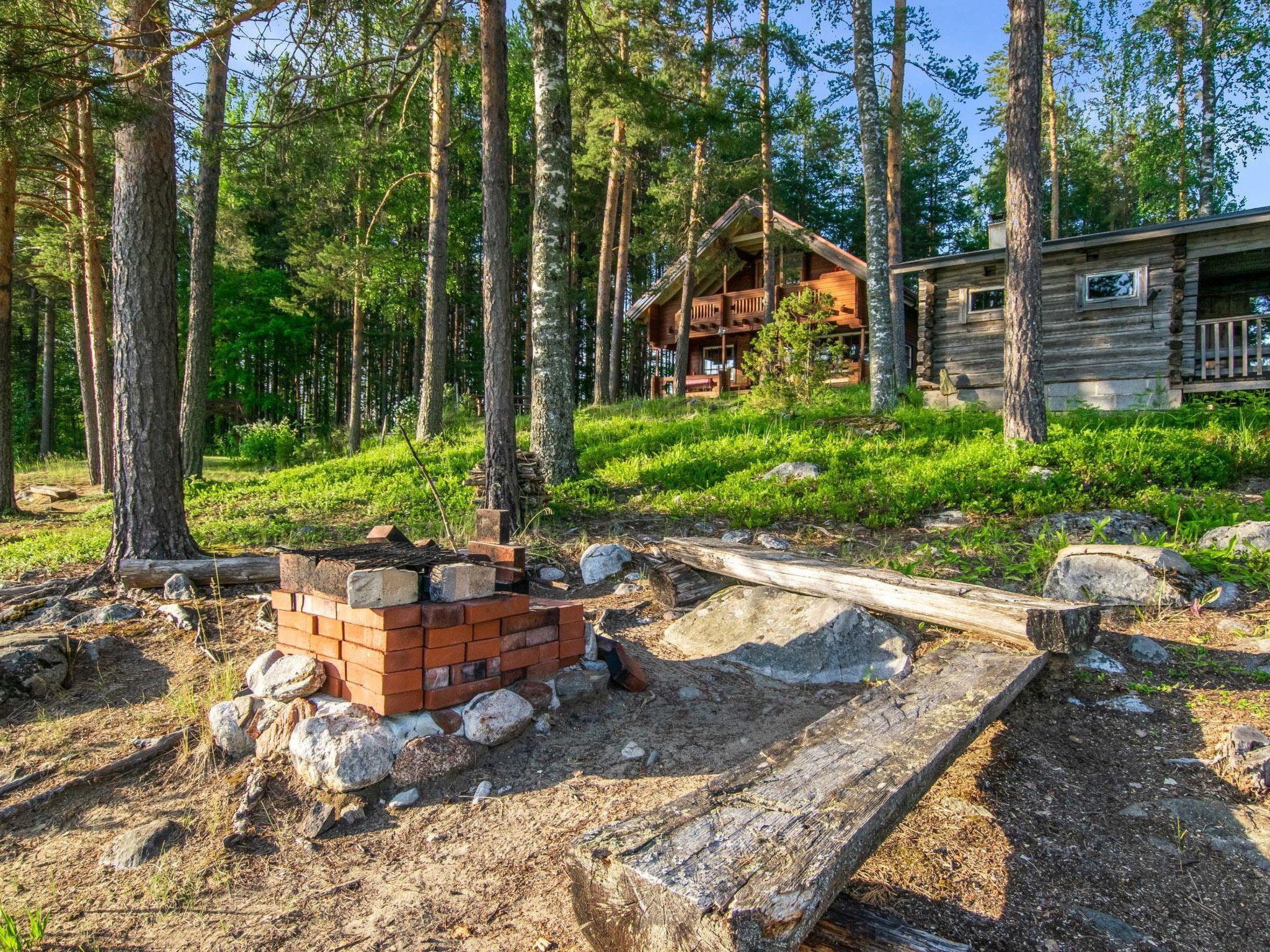 "Korpi" grill hut in the half-hectare forest behind the cottage, distance from the main cottage approx. 25 m. The hearth of the hut is decorated with animal-themed decorations, the hut is equipped with a coffee pot, a grill grid and a flat pan.