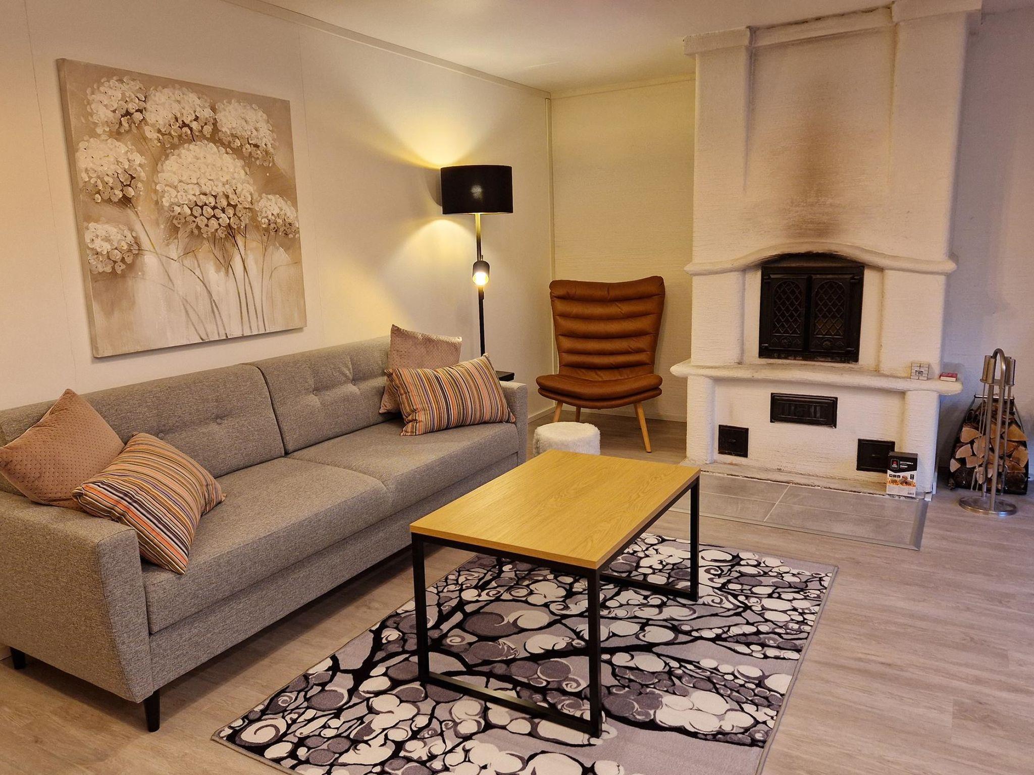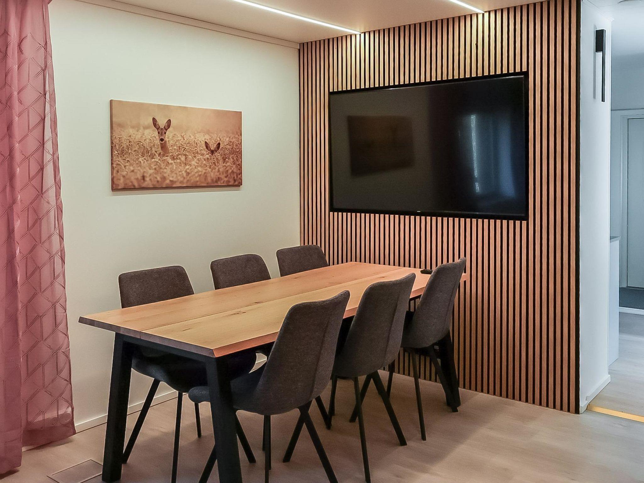 The living room features a heat-storing fireplace and a long table for eight people. The TV is placed on the wall above the table so it can be used for meetings.